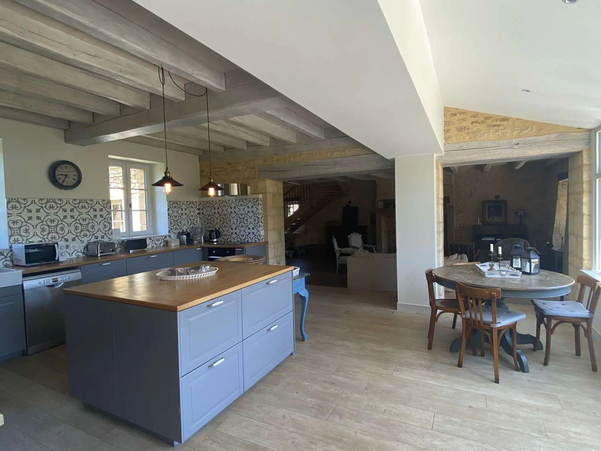 Entrando por el camino de entrada, la cocina está a su izquierda. Muy luminosa gracias a un gran ventanal y puertas francesas, la cocina se abre directamente al jardín orientado al sur y al salón con sus zonas de estar y comedor.