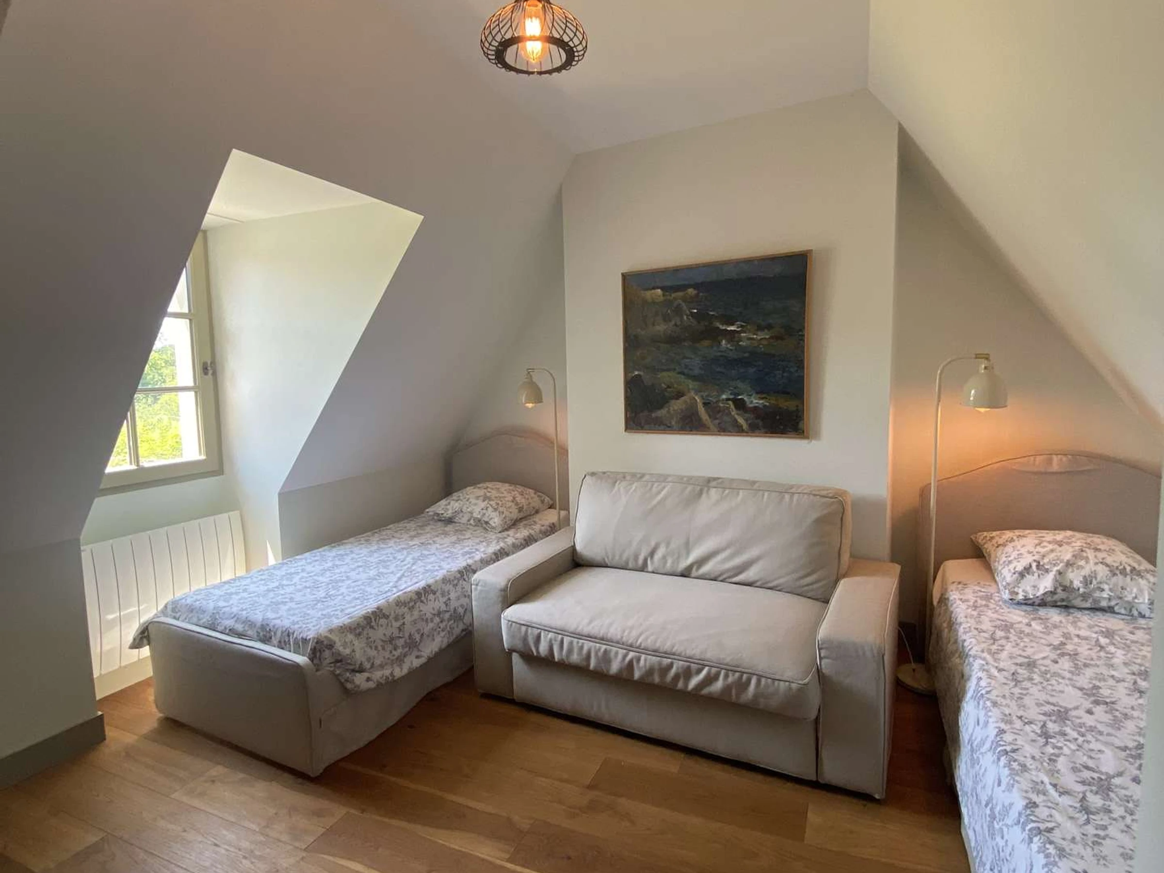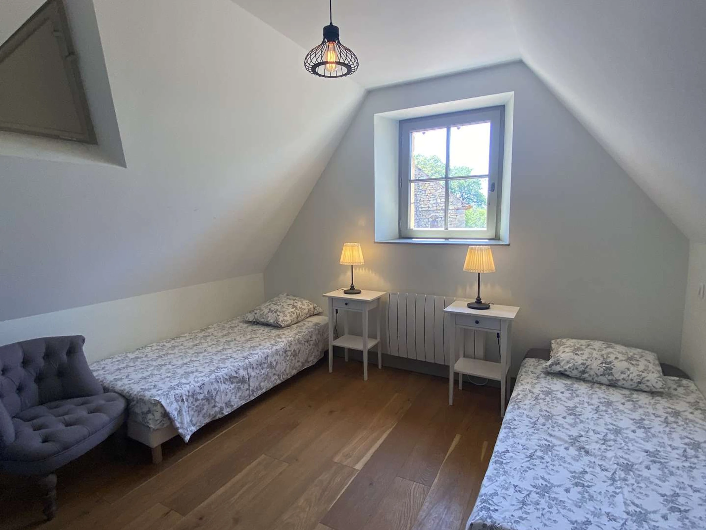 Desde el salón, una escalera conduce a la zona de noche. Esta planta cuenta con tres dormitorios: uno doble con baño en suite y dos dormitorios con dos camas individuales. Un baño y un aseo se encuentran en el rellano.