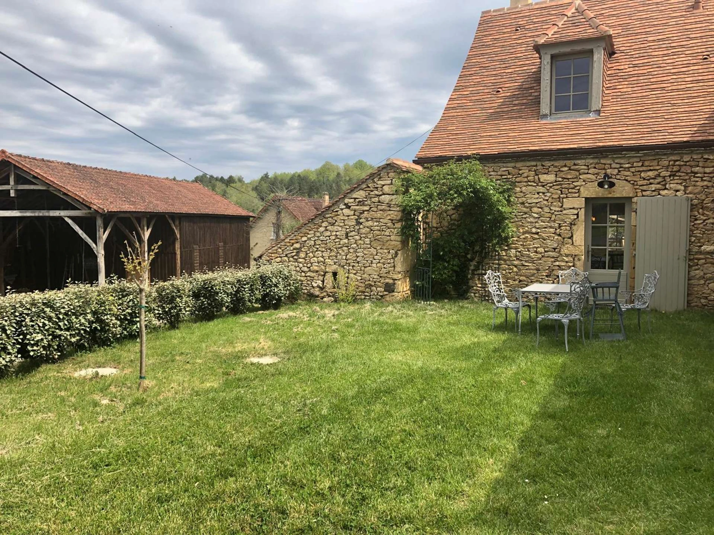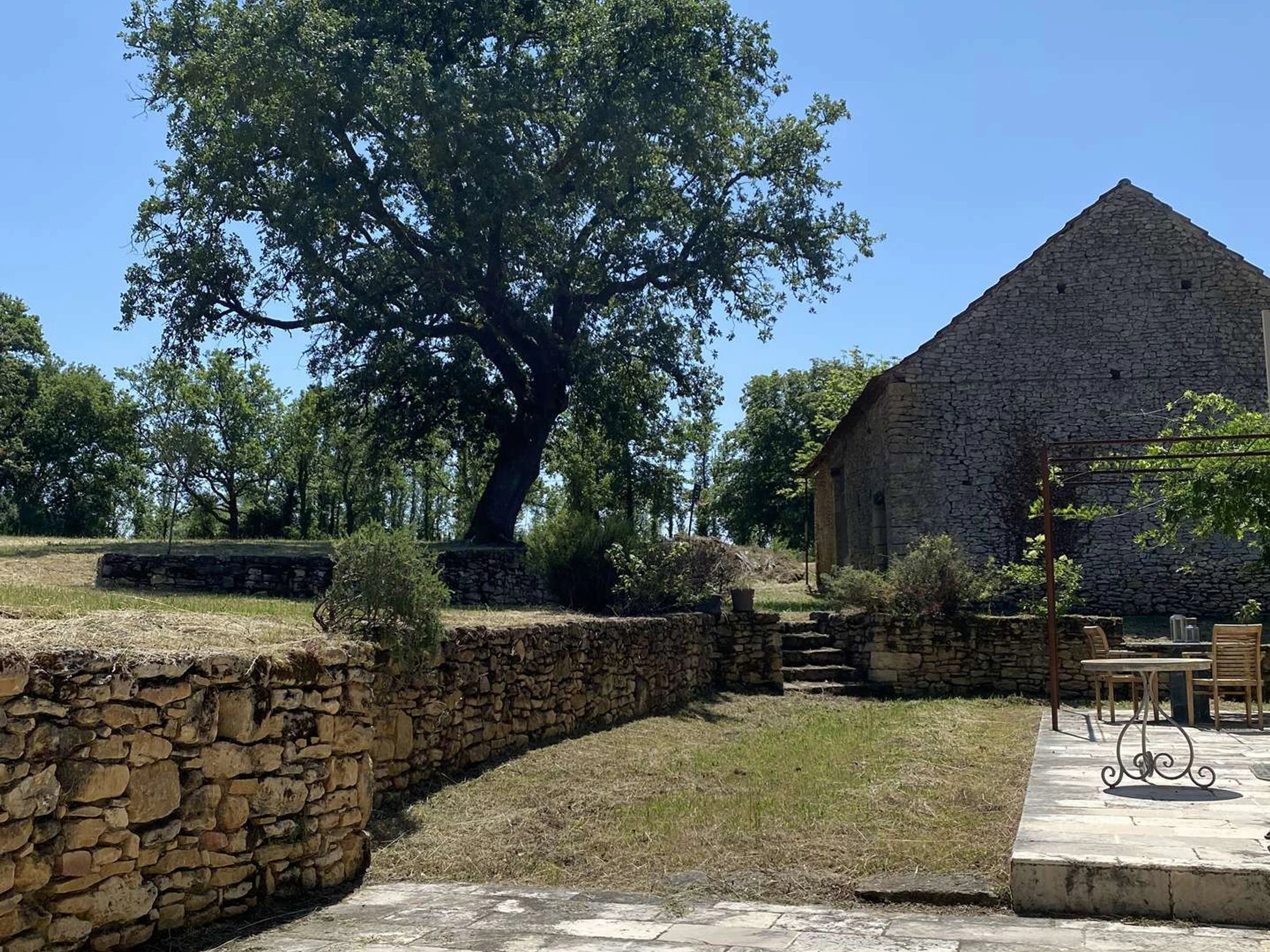 Puede disfrutar de sus comidas de verano en la terraza junto a la cocina o bajo el roble cerca del granero.