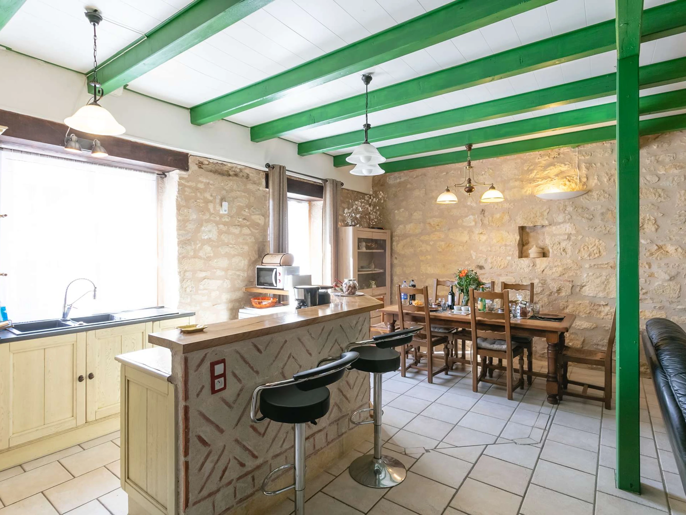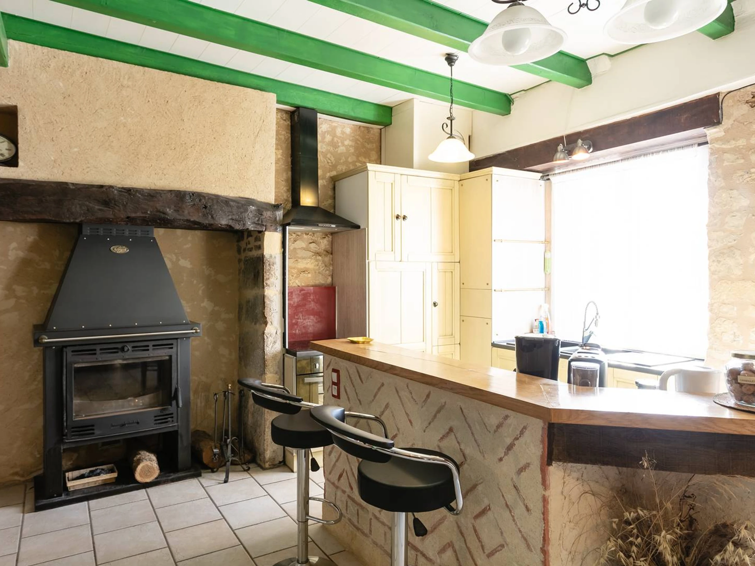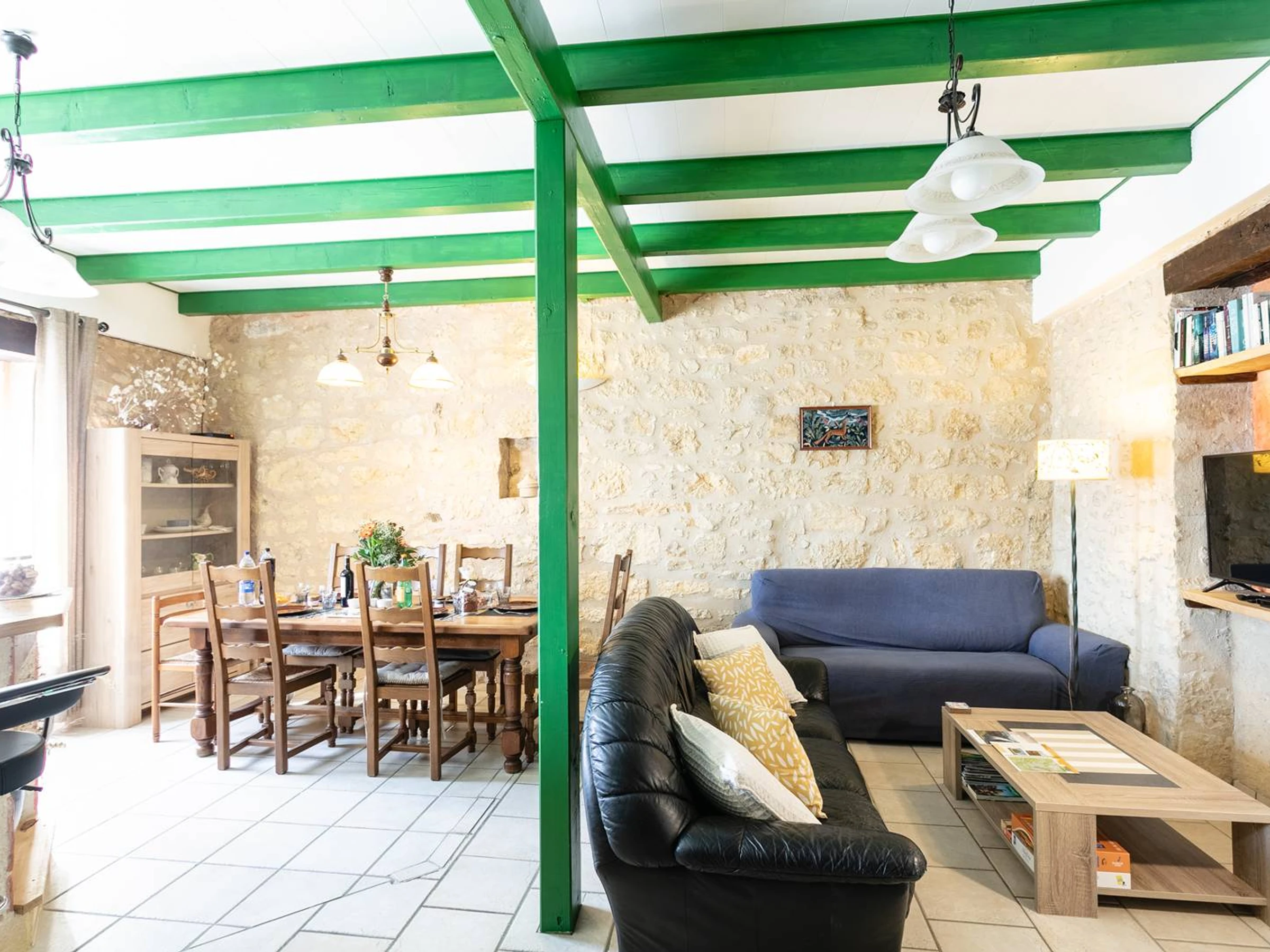 - salón luminoso abierto a la cocina y al comedor, equipado con dos sofás de 3 plazas, TV y estufa de leña, ideal para momentos en grupo