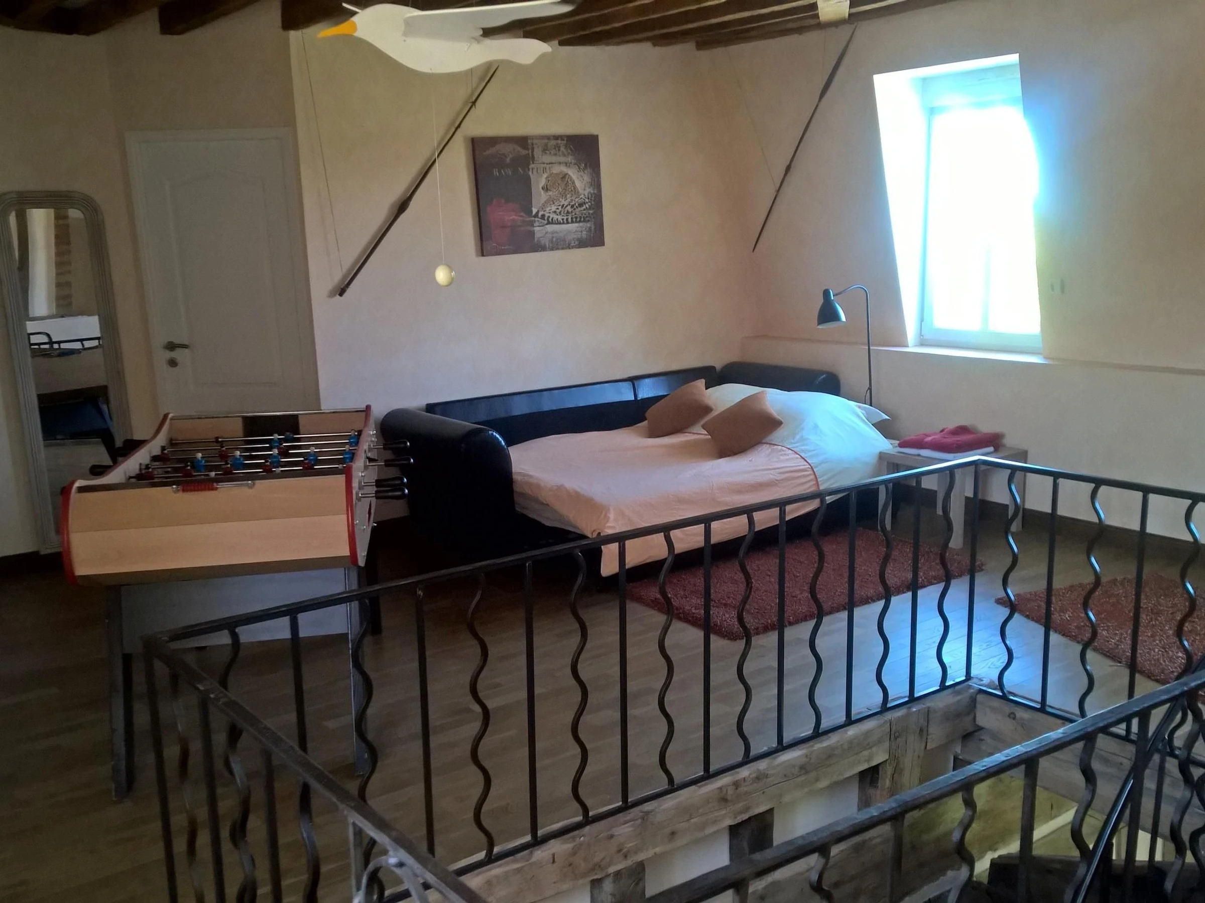 Planta alta: Sala de juegos con futbolín y TV, con sofá cama de 160 x 200 cm; un dormitorio con cama doble de 160 x 200 cm; un dormitorio con cama doble de 140 x 200 cm; un dormitorio con tres camas individuales de 90 x 200 cm (dos de las cuales se pueden unir). y un dormitorio con una cama doble de 160 x 200 cm (dos camas individuales) y una cama individual de 90 x 200 cm. También hay un aseo independiente, dos cuartos de ducha y un lavadero con lavadora y secadora (disponible para estancias de una semana o más).