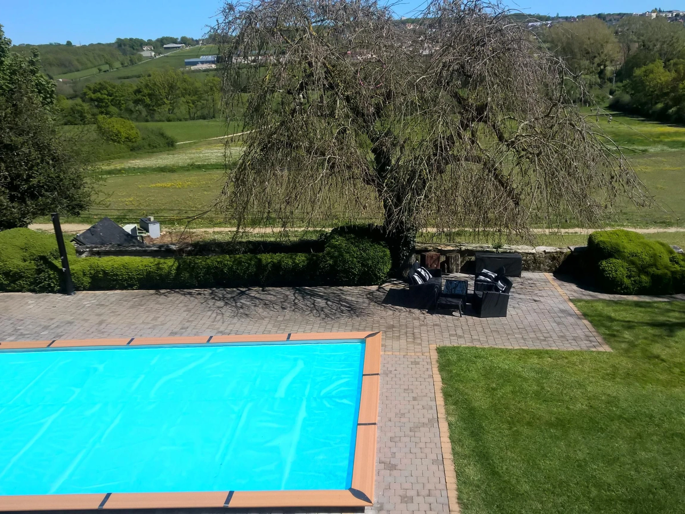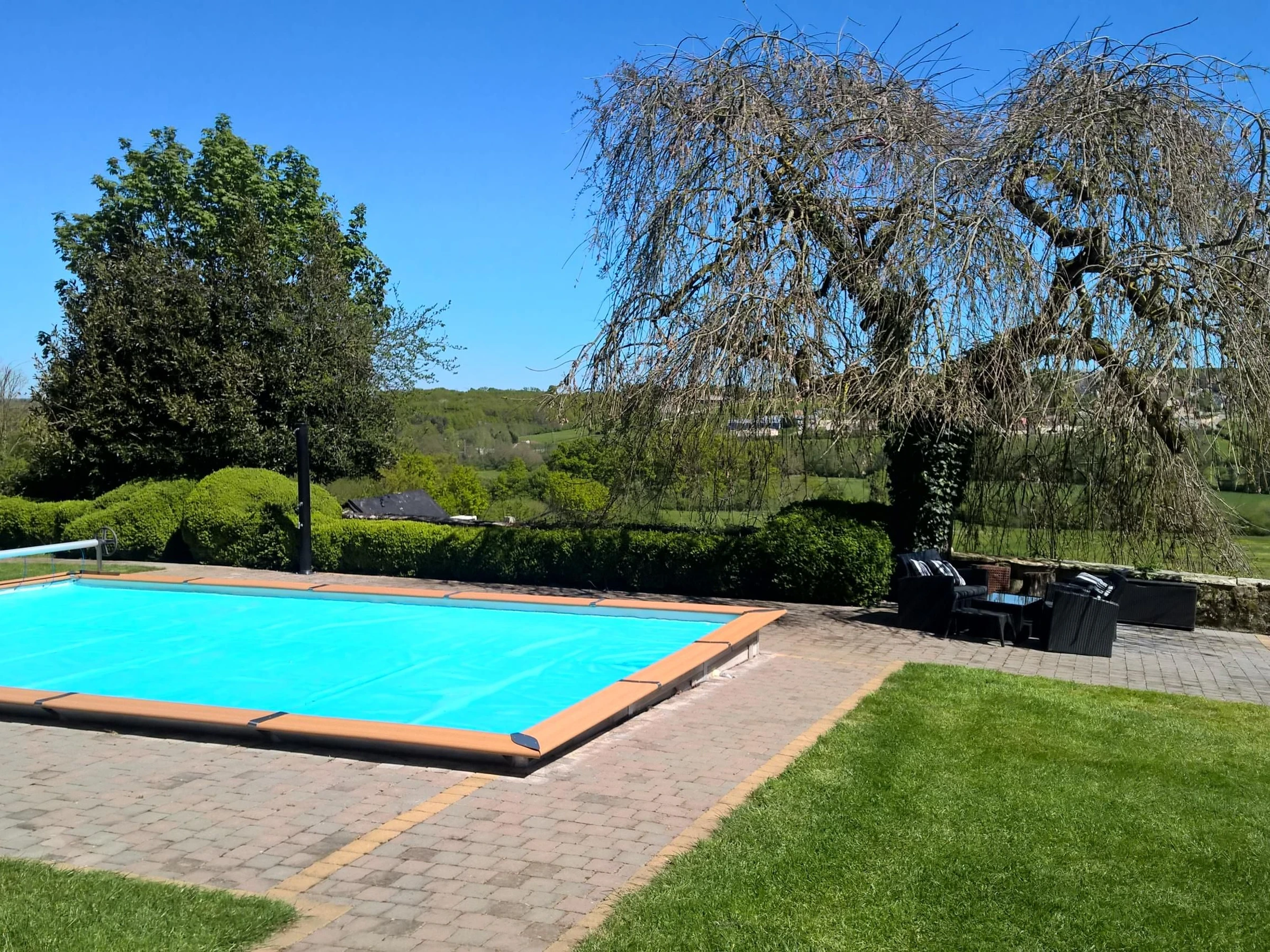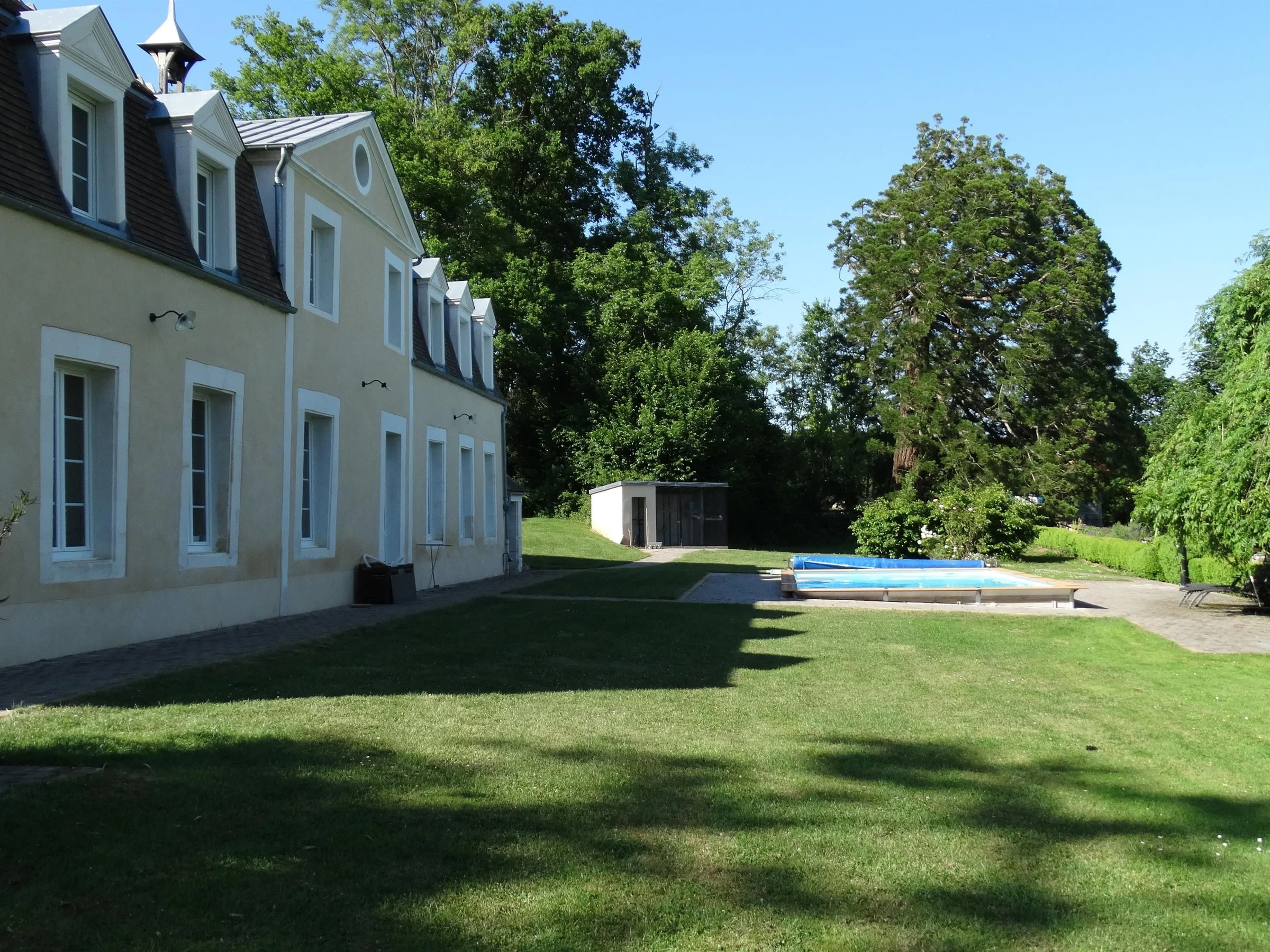 La propiedad cuenta con 4500 m² de zonas verdes y jardines, una piscina climatizada (abierta de mayo a septiembre), un jacuzzi exterior (abierto todo el año), una mesa de ping-pong y seis plazas de aparcamiento dentro de la propiedad cerrada.