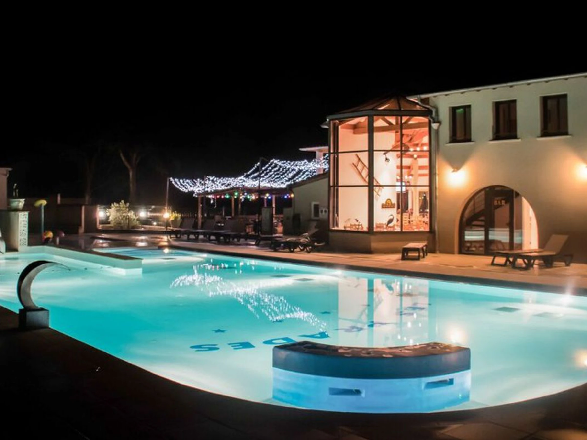 - Zona acuática de 200 m², piscina infantil, cascada, carril de hidromasaje, baño de burbujas