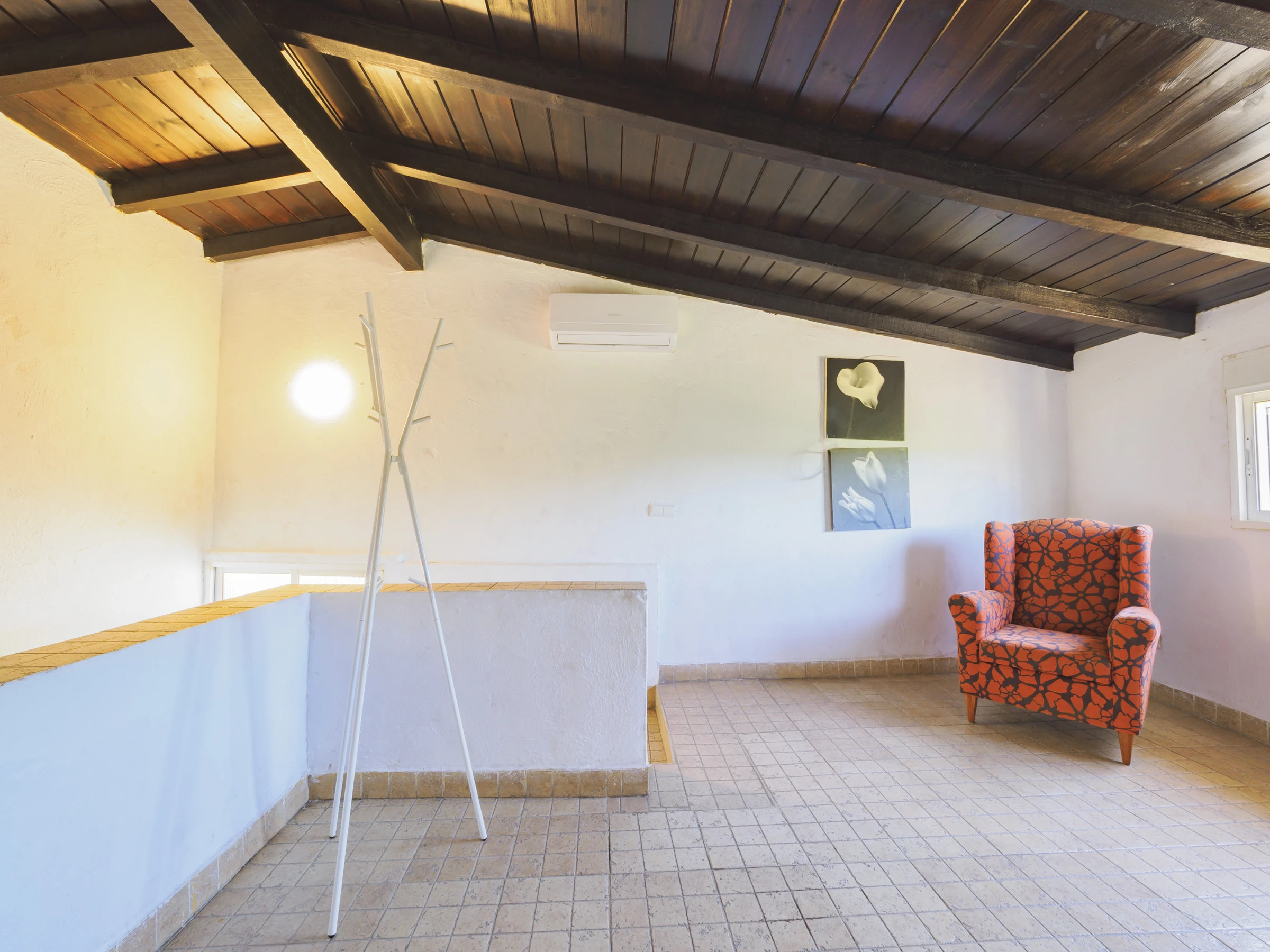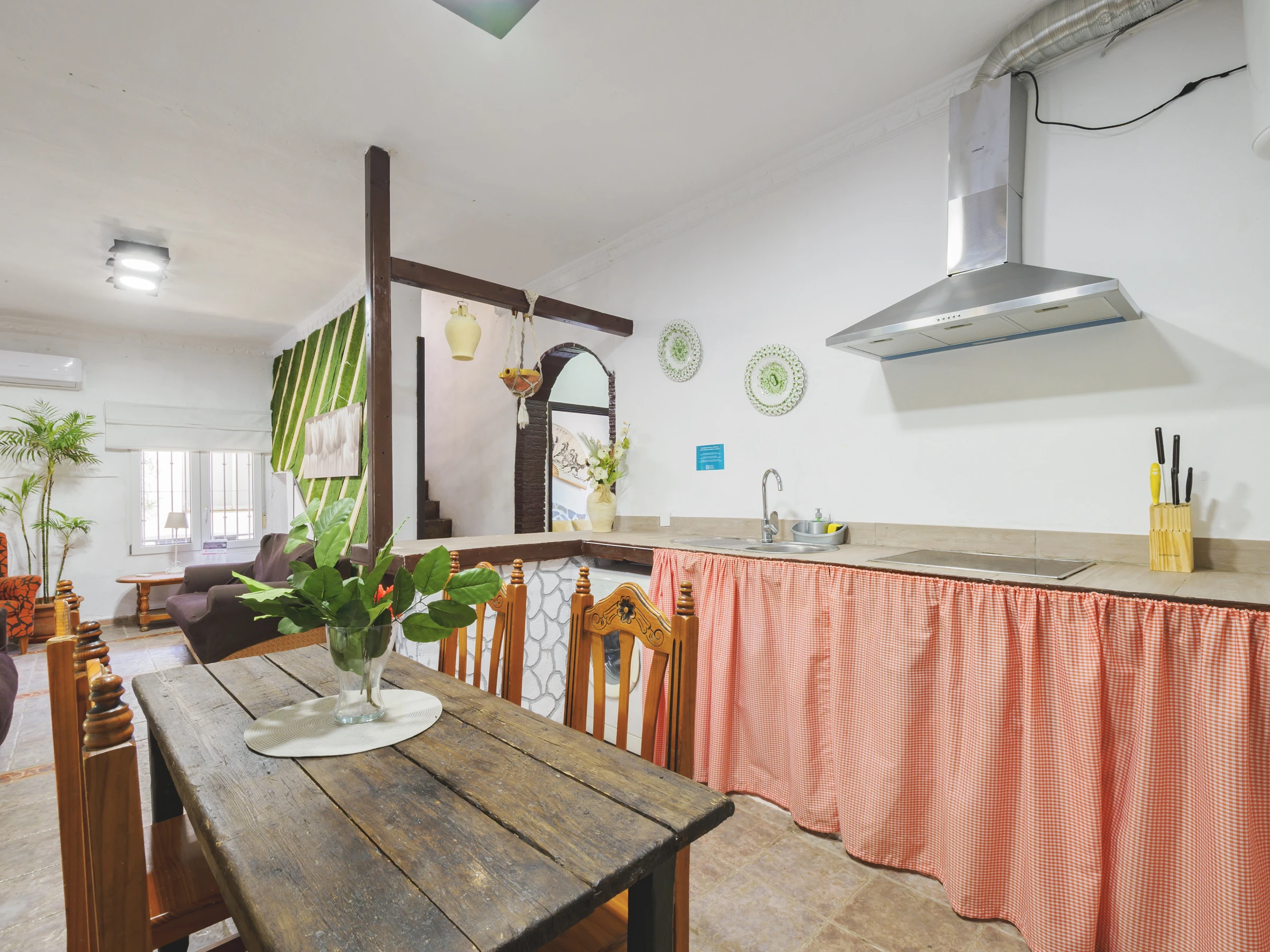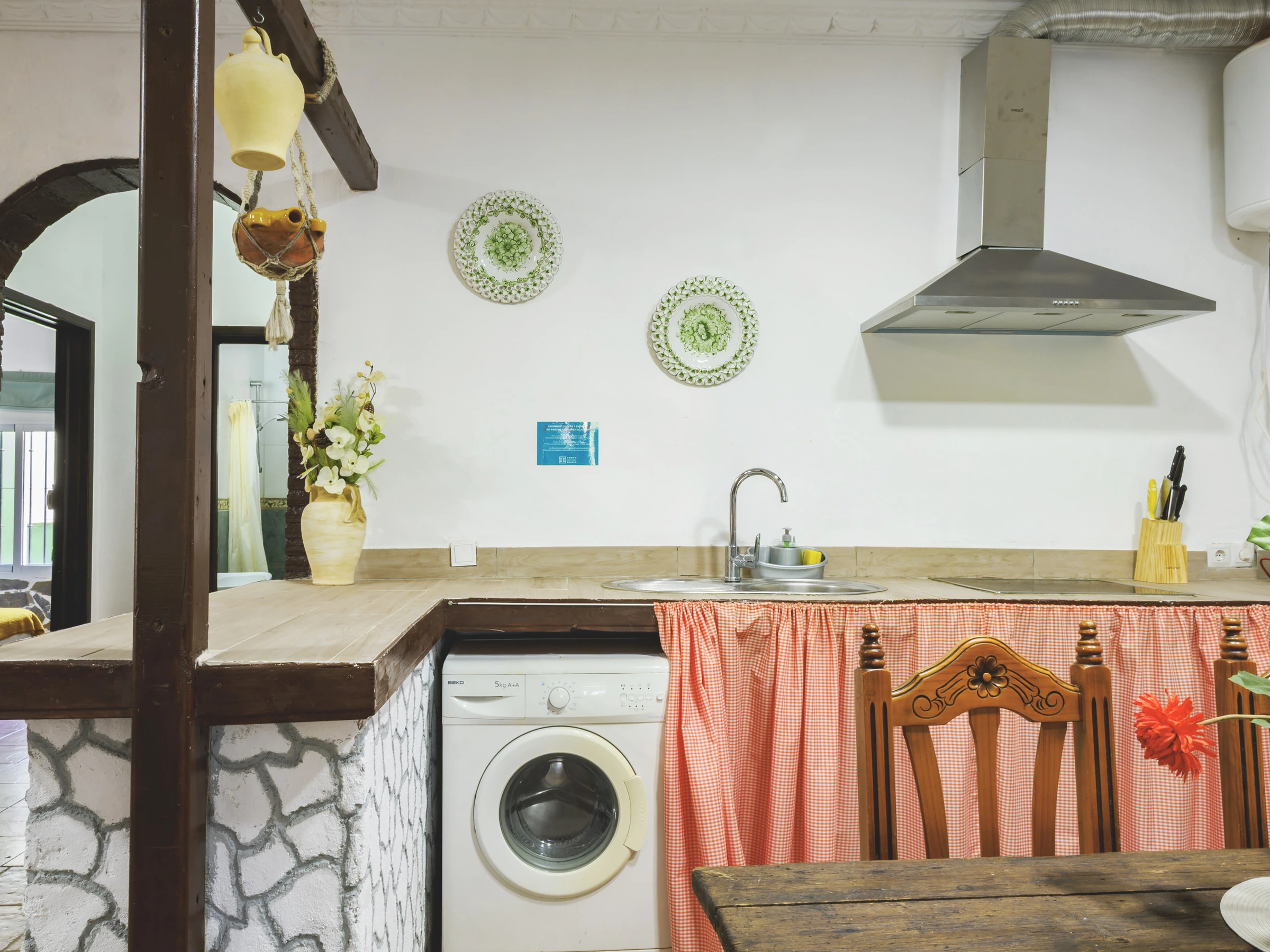 La cocina americana está equipada con vitrocerámica, nevera, microondas, congelador, cafetera, tostadora, hervidor y exprimidor, ofreciendo todo lo necesario para cocinar cómodamente, aunque no dispone de horno ni lavavajillas. Al lado de la cocina, un área de descanso con dos sofás crea un ambiente relajado y acogedor, donde además se encuentra la lavadora para mayor comodidad. El salón y el rellano de la planta superior disponen de aire acondicionado para mantener la temperatura ideal durante la estancia.