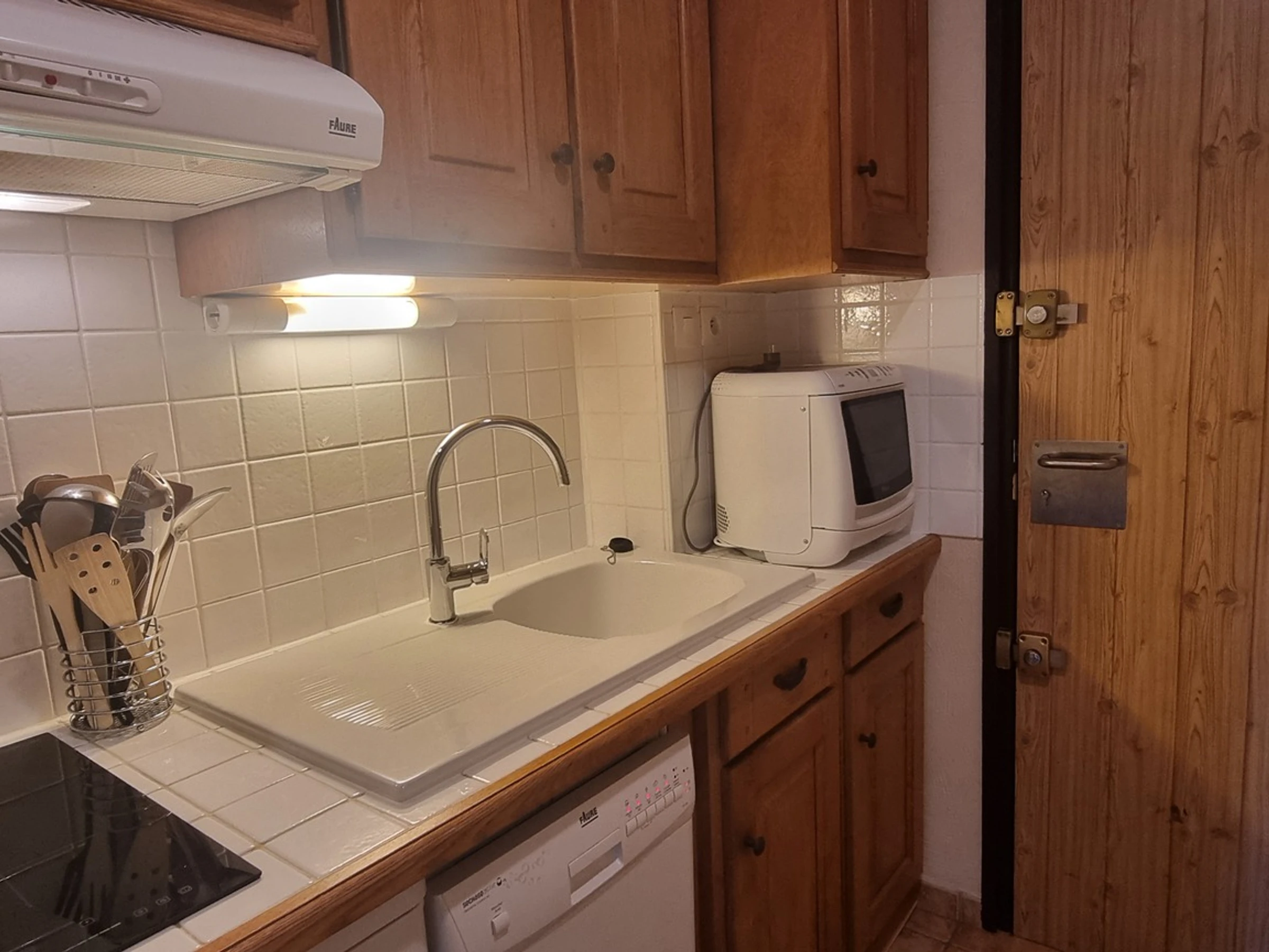La cocina, situada a la entrada del estudio, está equipada con microondas con grill, dos placas eléctricas, nevera y lavavajillas.