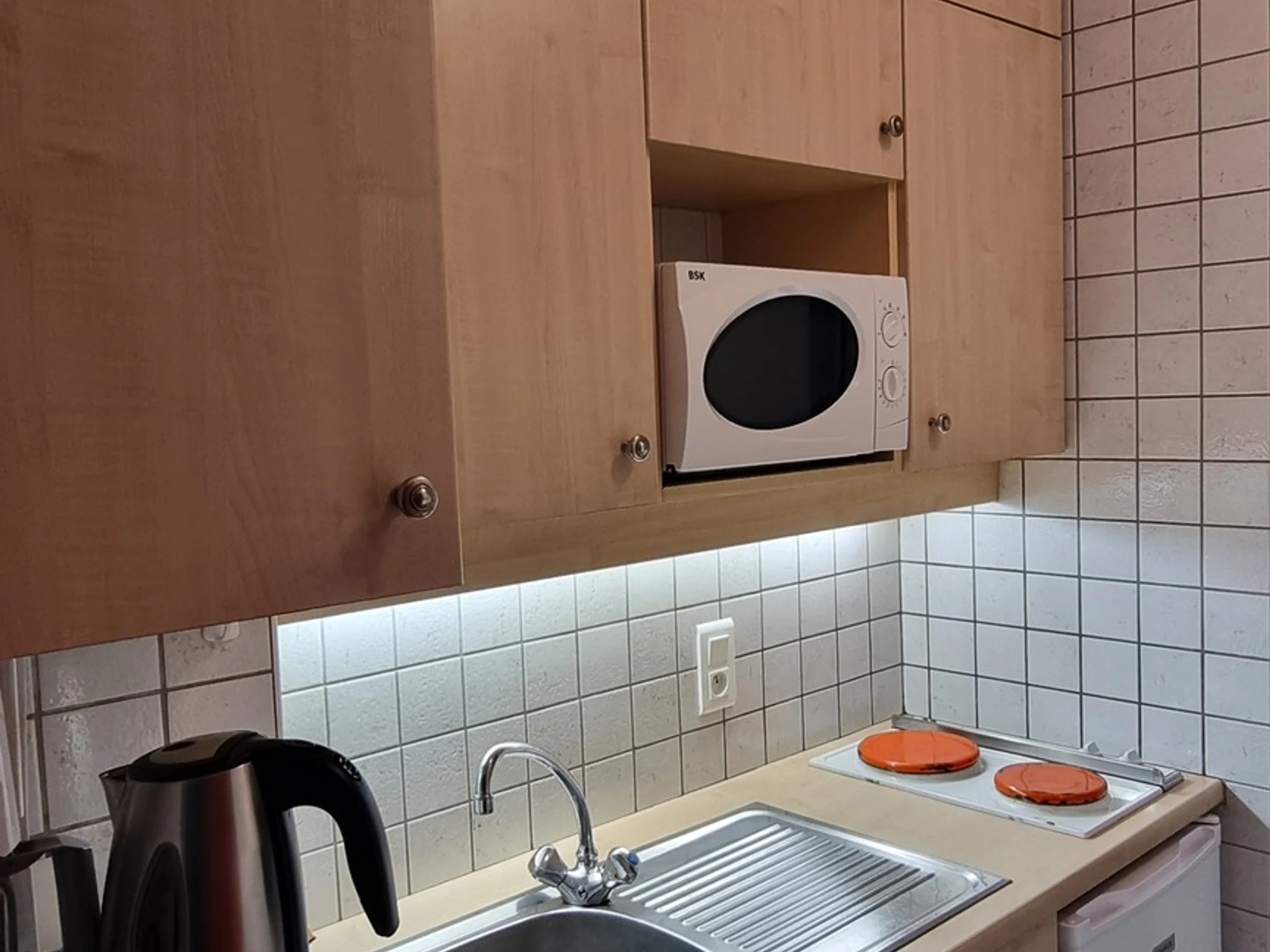 El salón está idealmente distribuido para 3 o 4 personas e incluye dos sofás cama individuales y un televisor de pantalla plana. Para mayor comodidad, el apartamento también dispone de una cama esquinera con dos literas.