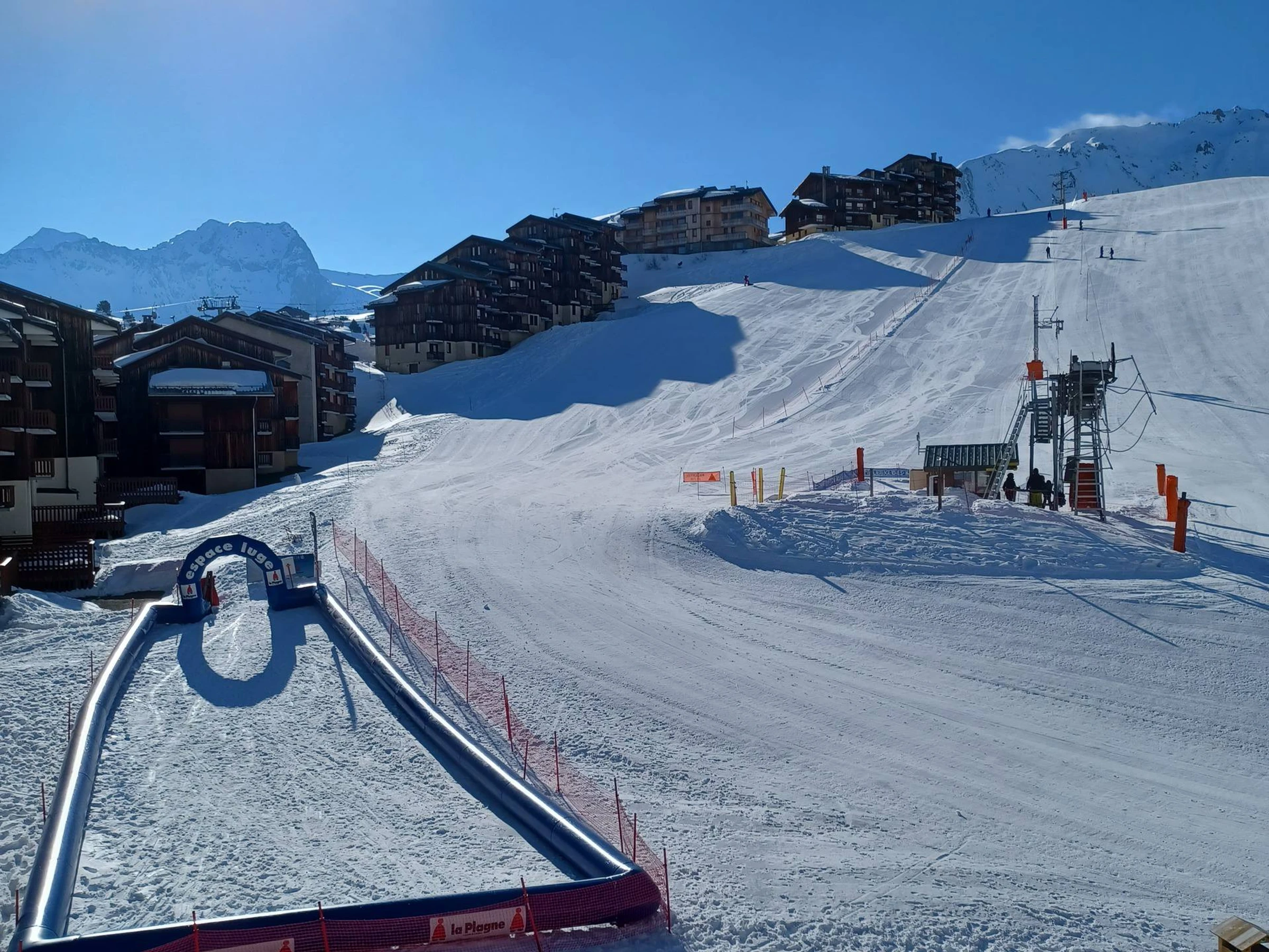 Ubicado en la residencia Les Hameaux I en Plagne Villages. Estudio con altillo para 4 personas, 28 m², en la 4.ª planta, con acceso directo a las pistas y balcón con vistas a las pistas.
