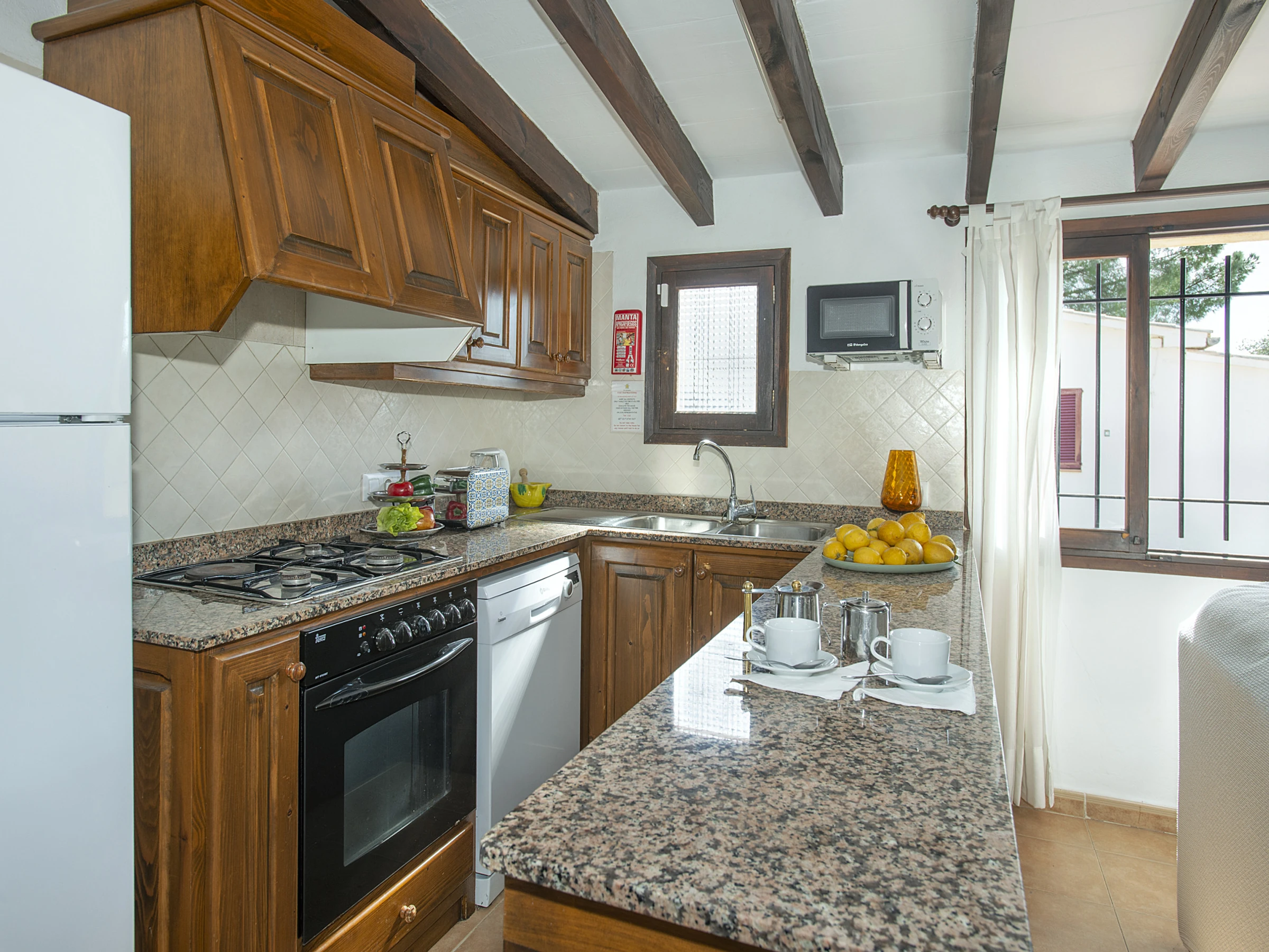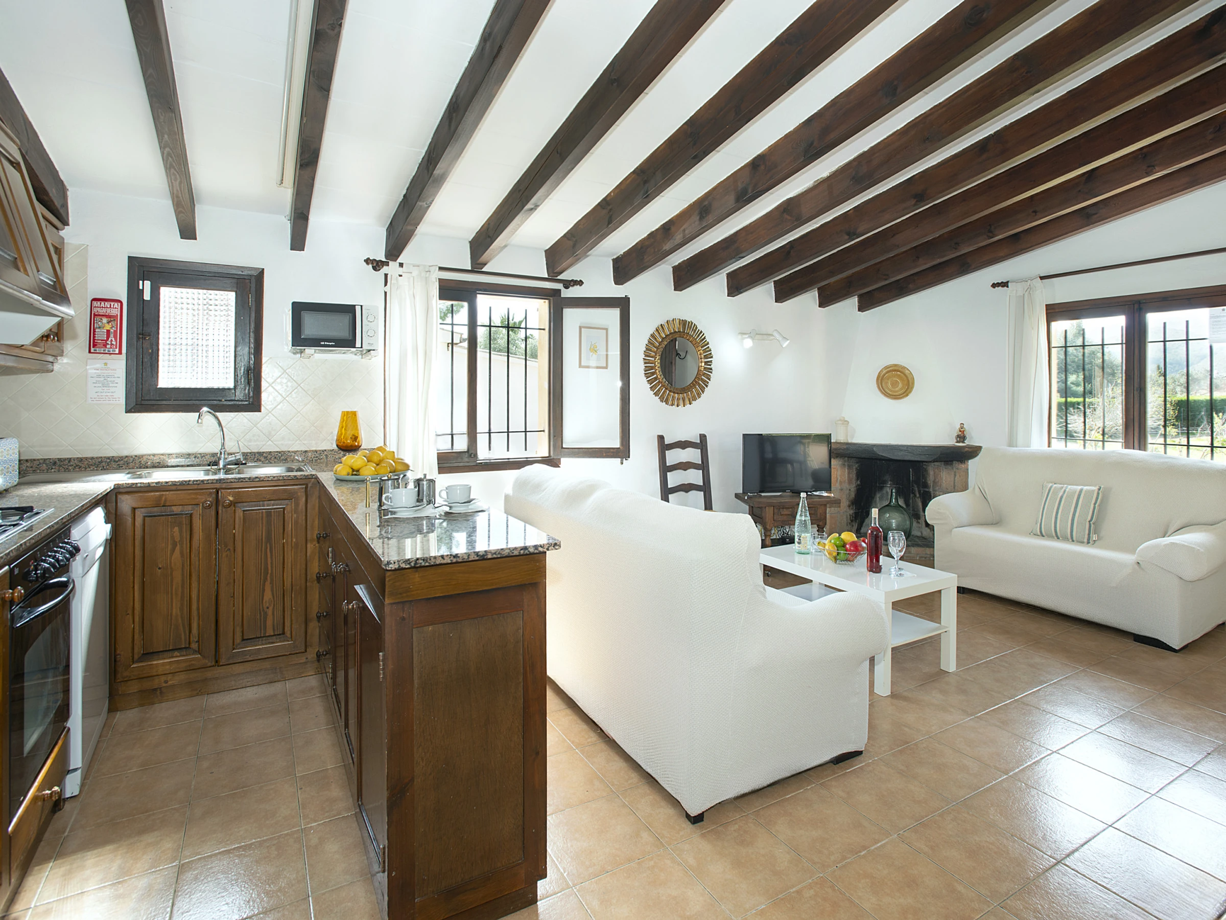 El interior de la vivienda destaca por su ambiente acogedor, con techos de vigas de madera y una decoración en tonos claros que aporta luminosidad y serenidad. El salón dispone de cómodos sofás y una Smart TV, creando un espacio perfecto para relajarse tras un día de excursiones. La cocina, abierta al salón, está completamente equipada y ofrece todas las facilidades necesarias para cocinar cómodamente durante la estancia.