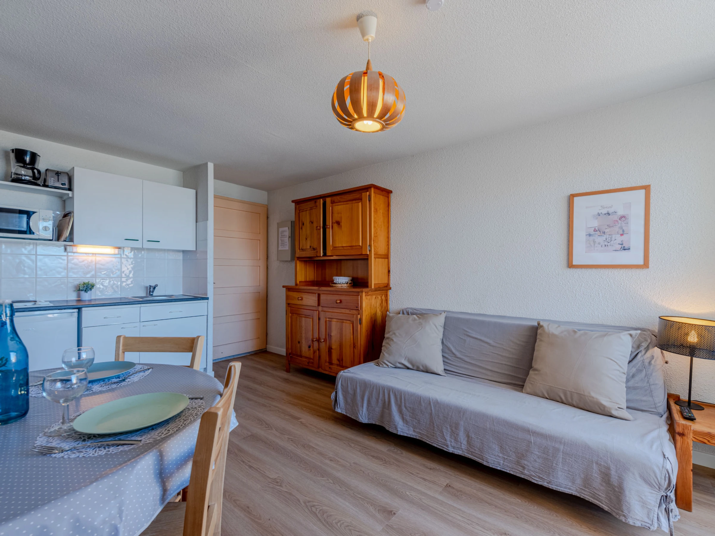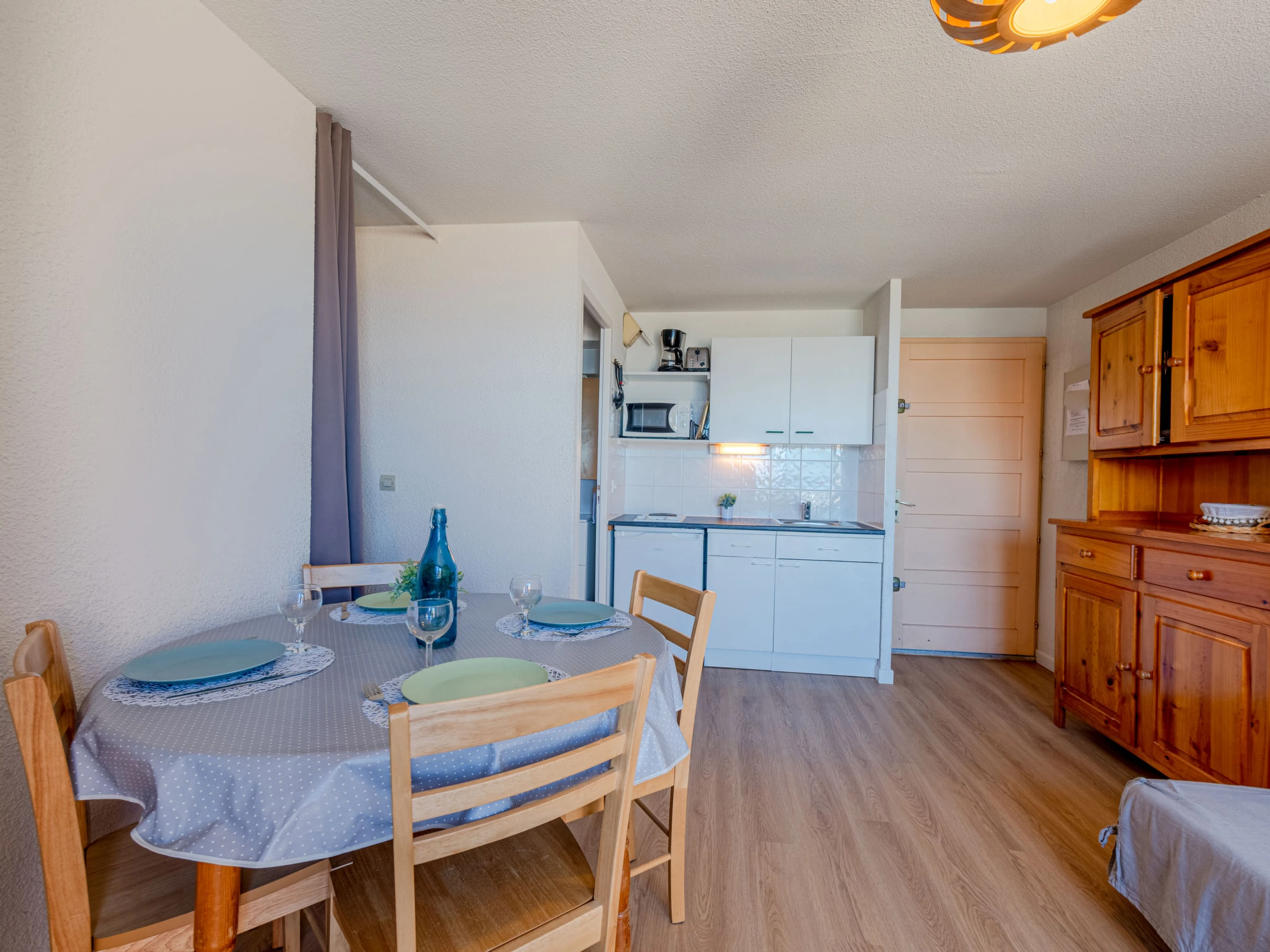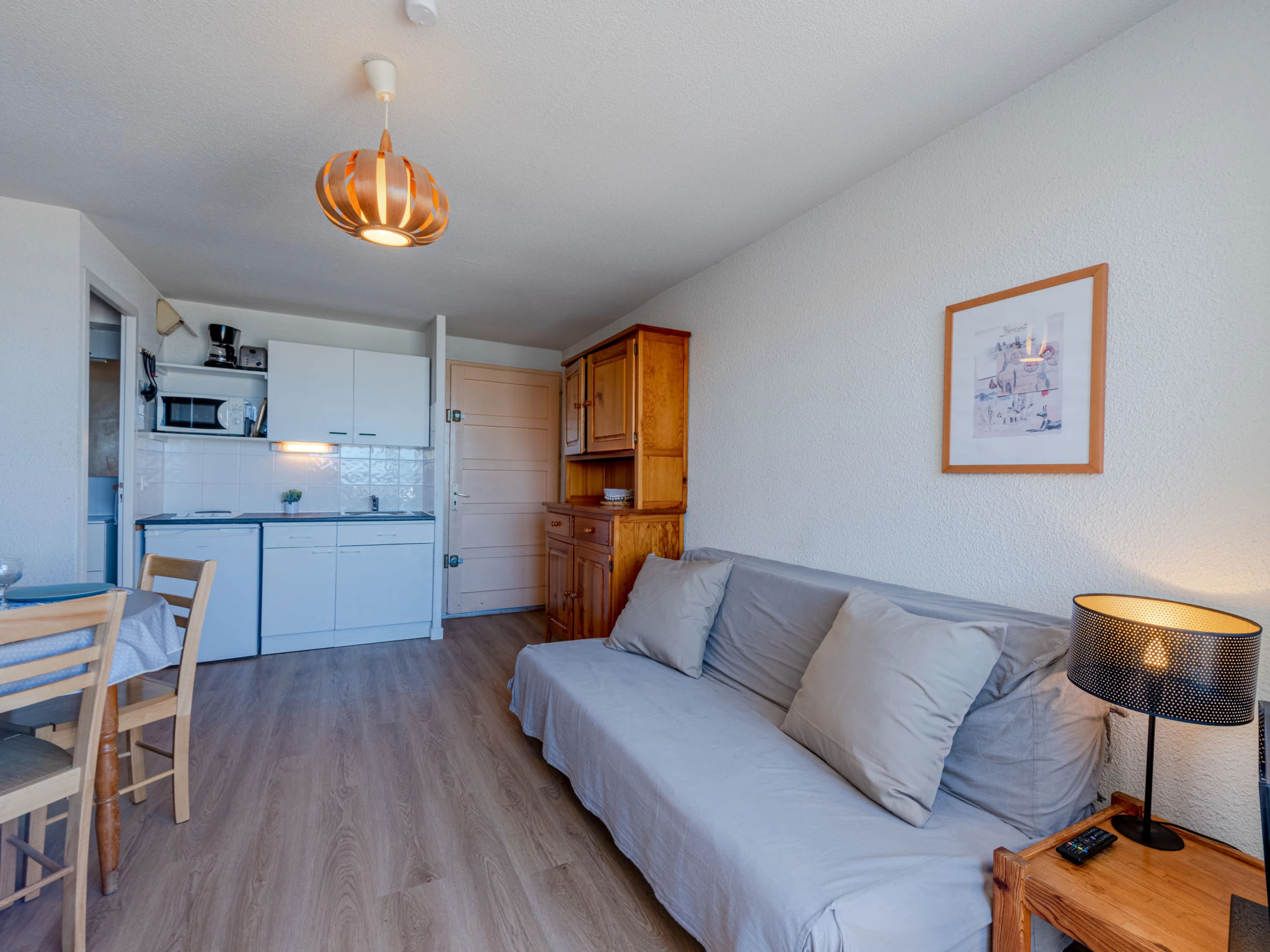 Apartamento de 2 estancias 32 m2 en el 3° piso. Salón-comedor con TV. 1 dorm. con 1 cama de matrimonio (1 x 140 cm). Cabina abierta con 1 x 2 literas (80 cm). Rincón-cocina (2 fogones, microondas, cafetera eléctrica). Ducha/WC. Ningún tipo de calefacción. Balcón pequeño 4 m2. Muebles de terraza. Vista bonita al mar. El alojamiento dispone de: Internet (Wifi, extra). Plaza de aparcamiento. A tener en cuenta: detector de humo. En lugar de un dormitorio cerrado, algunos espacios para dormir están situados en una zona diáfana (galería, alcoba, etc.).