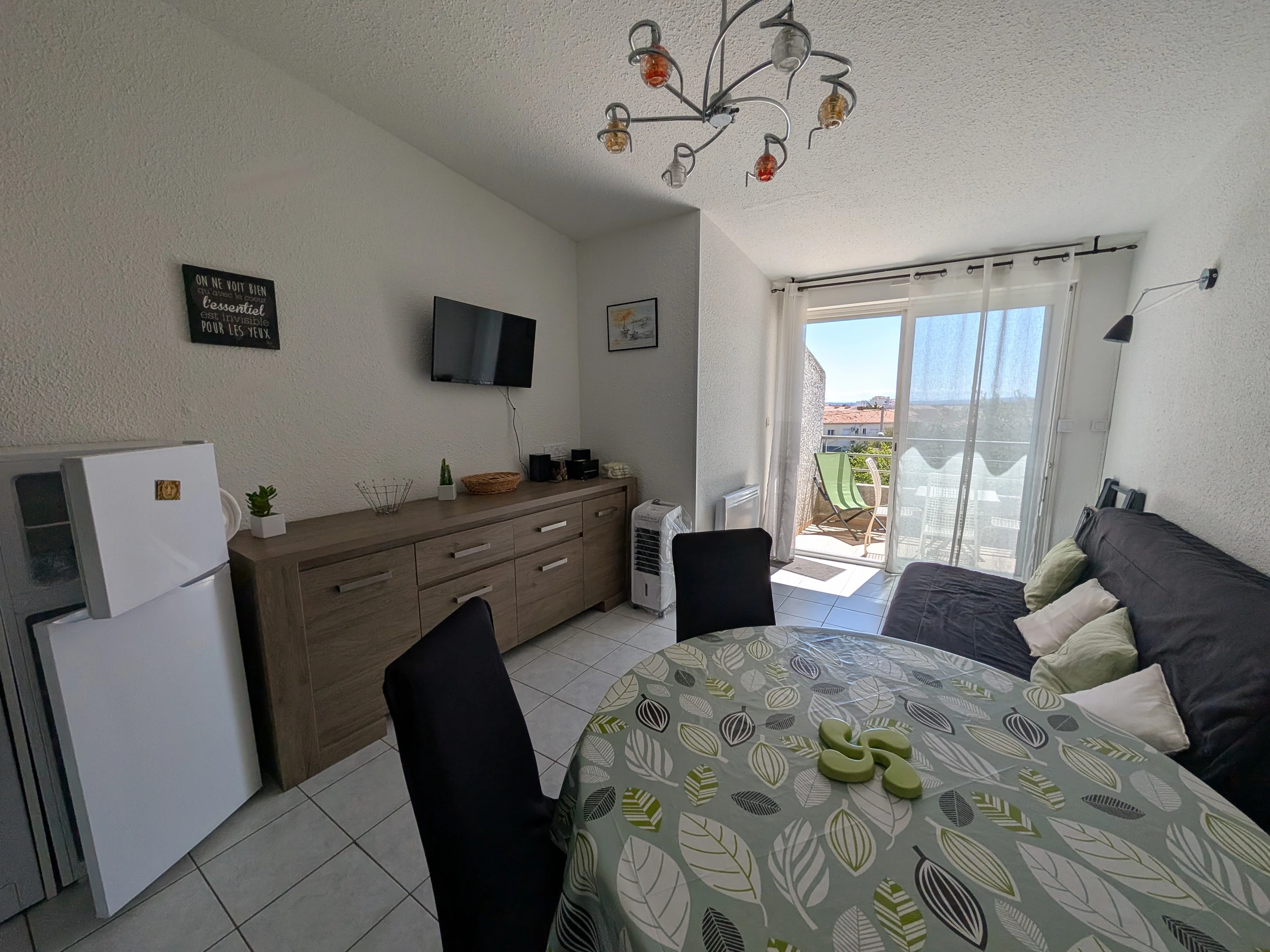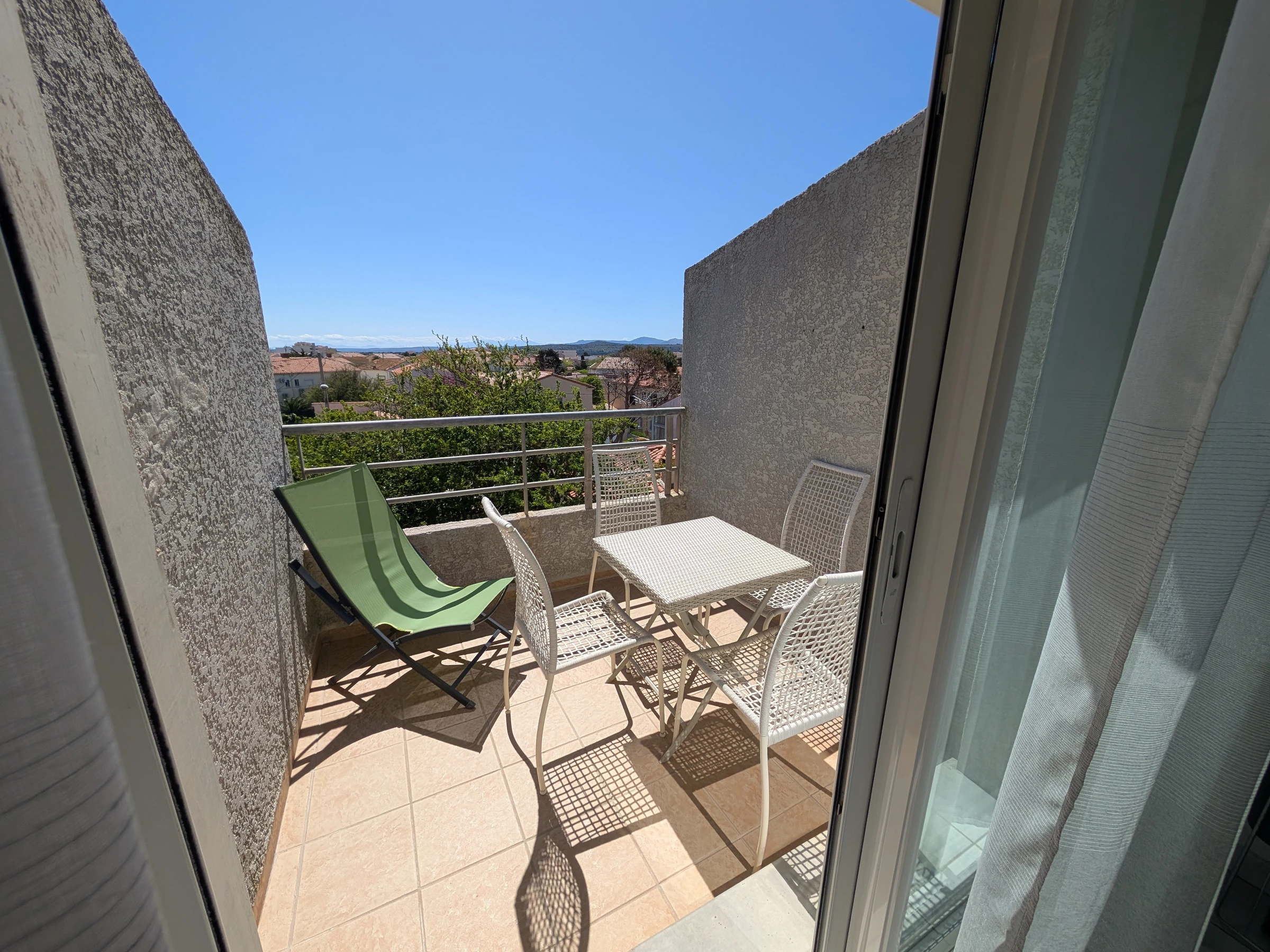 Lado sur bien expuesto. Ofrece una hermosa sala de estar (sofá cama) en un agradable balcón, vista lateral a la playa.