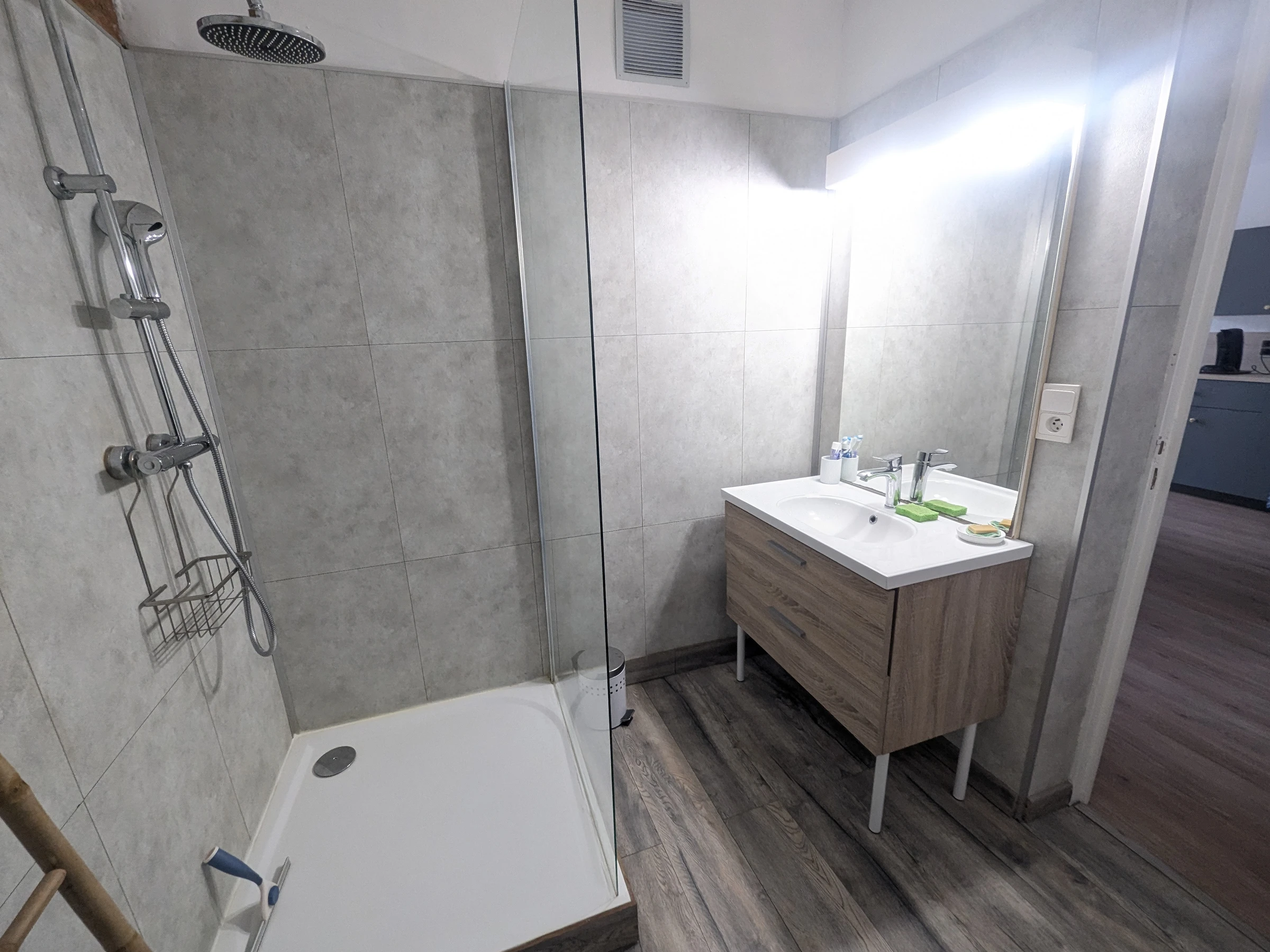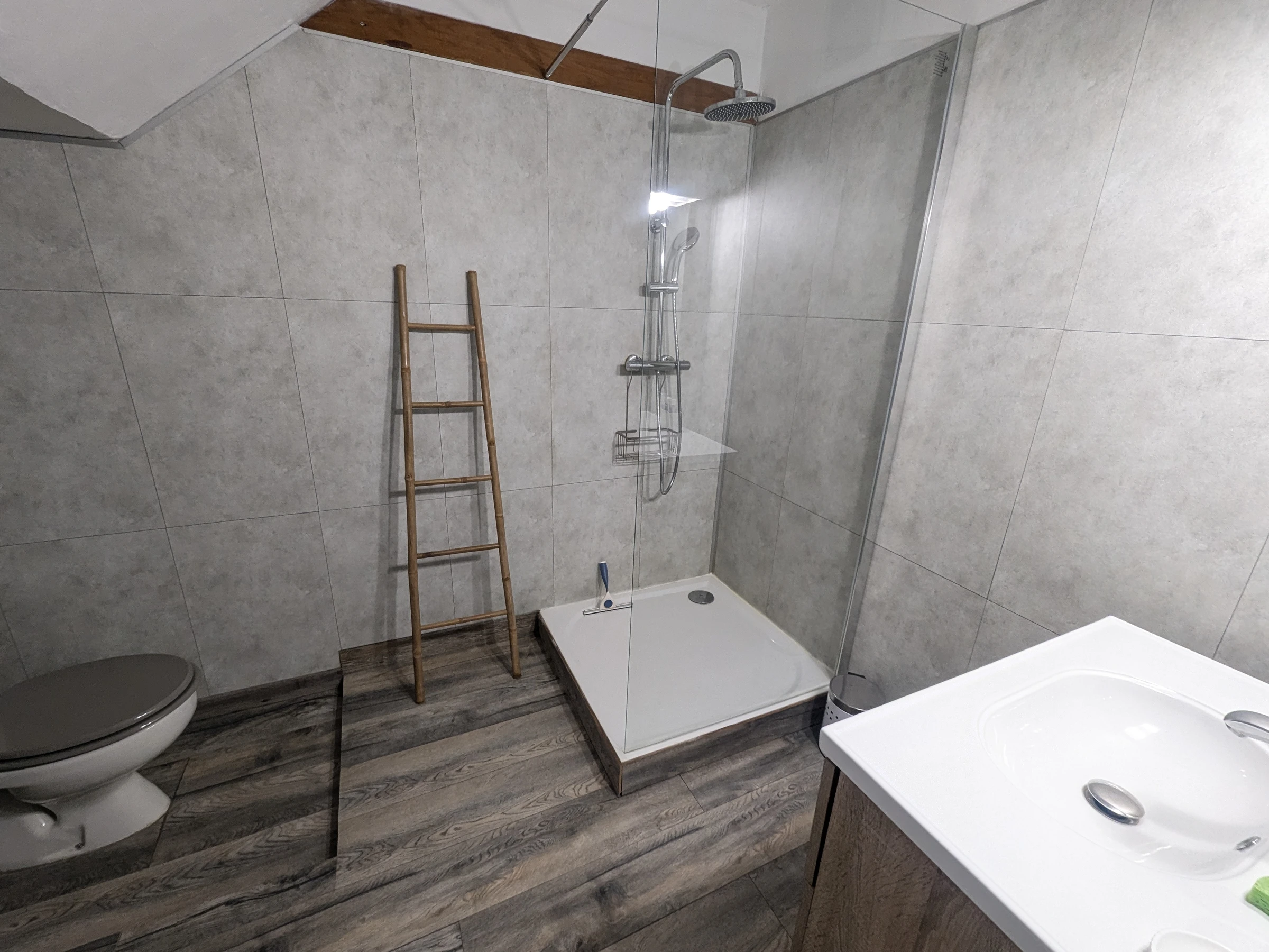 Zona de cocina amplia y bien equipada. 1 dormitorio en la planta baja, 1 cama doble, baño con ducha espacioso y moderno.