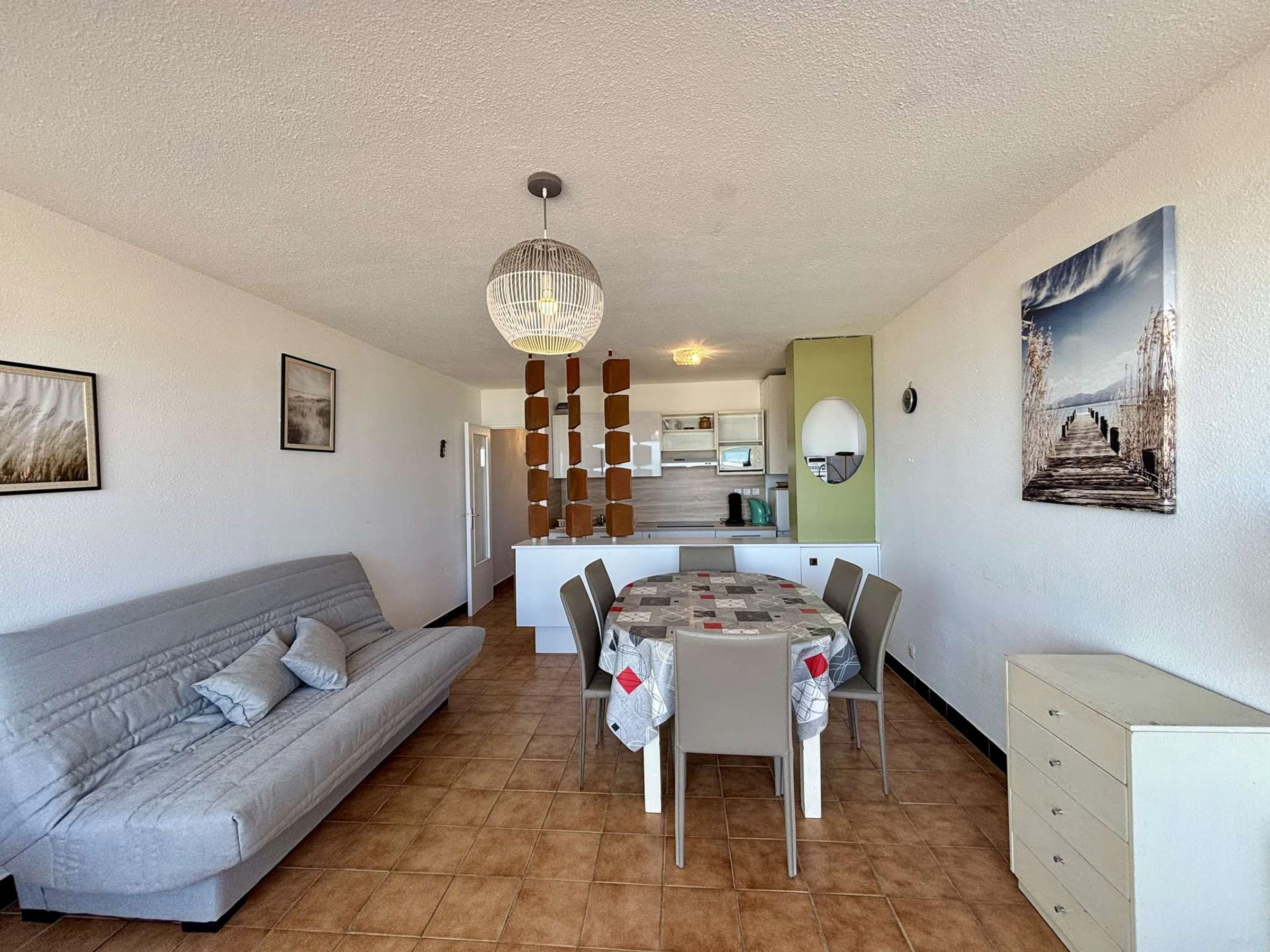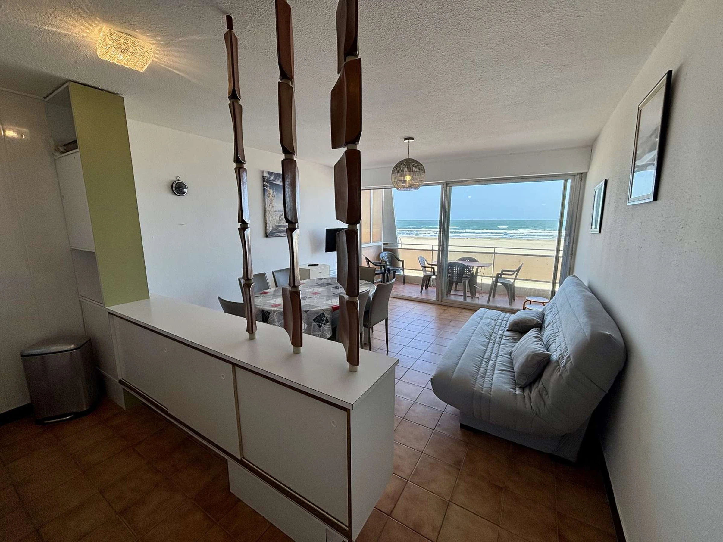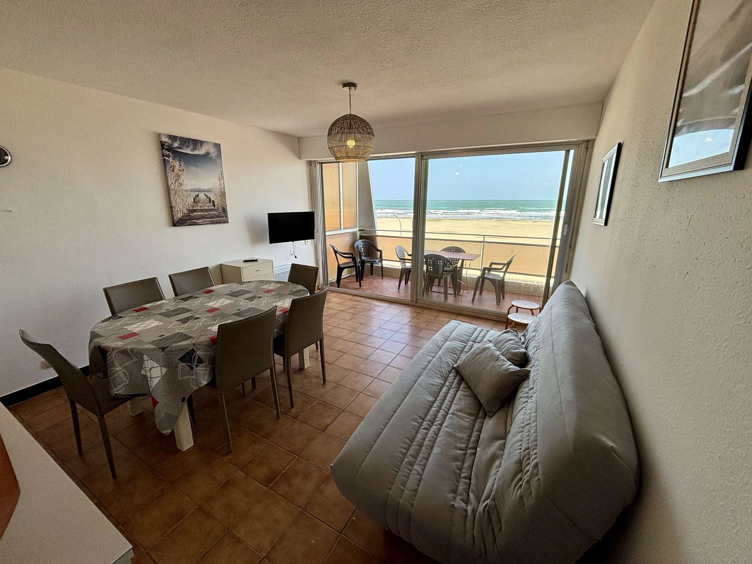 Este alojamiento junto al mar, ubicado en la 3.ª planta, incluye un salón con sofá cama doble y televisión, una cocina americana totalmente equipada, un dormitorio con cama doble (140 cm), un segundo dormitorio con cama doble (140 cm), un baño y un aseo independiente.