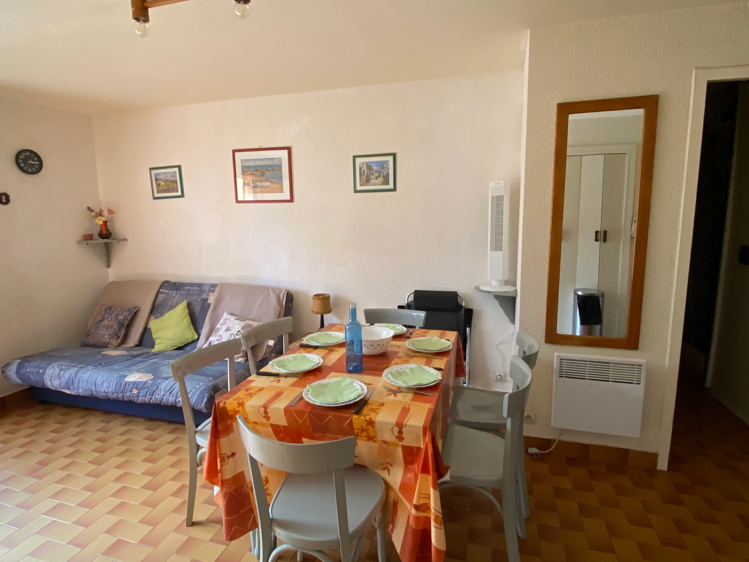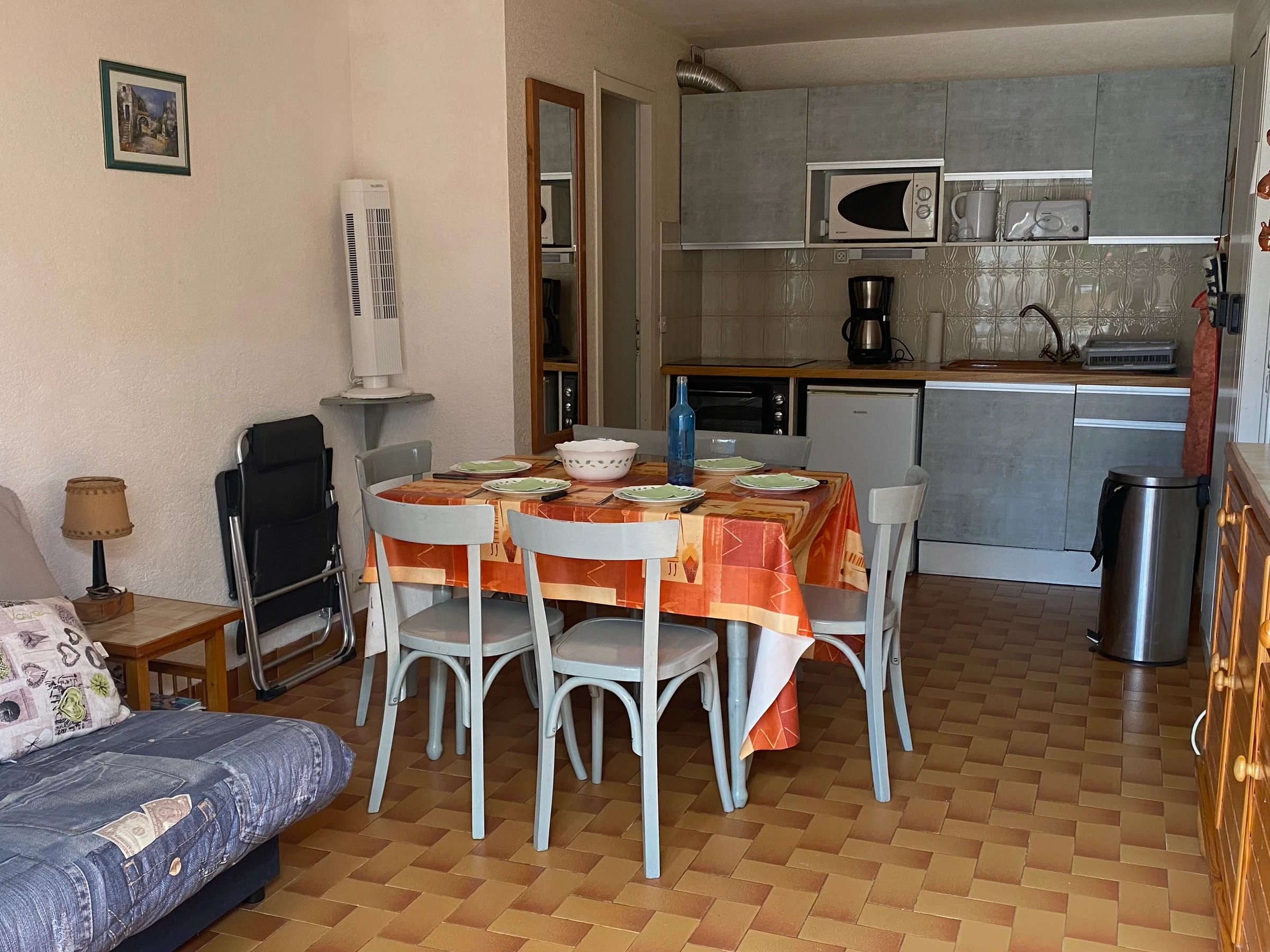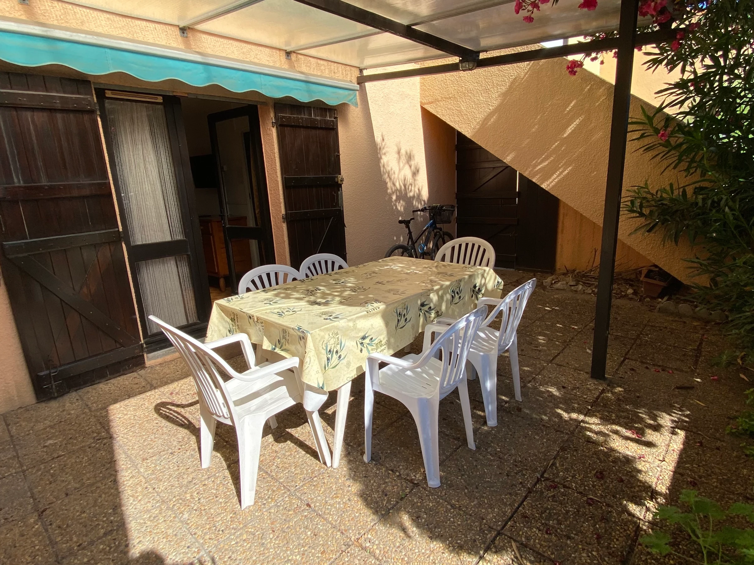 Residencia Les Maisons des Sables III. Capacidad para 6 personas. Amplio apartamento de 35 m², de una sola planta y dos dormitorios, en una residencia tranquila y arbolada. Amplia terraza arbolada, amplio salón (sofá cama) con acceso a la cocina totalmente equipada, un dormitorio infantil (dos literas individuales + una cama individual), un dormitorio (una cama doble) y un baño con WC.