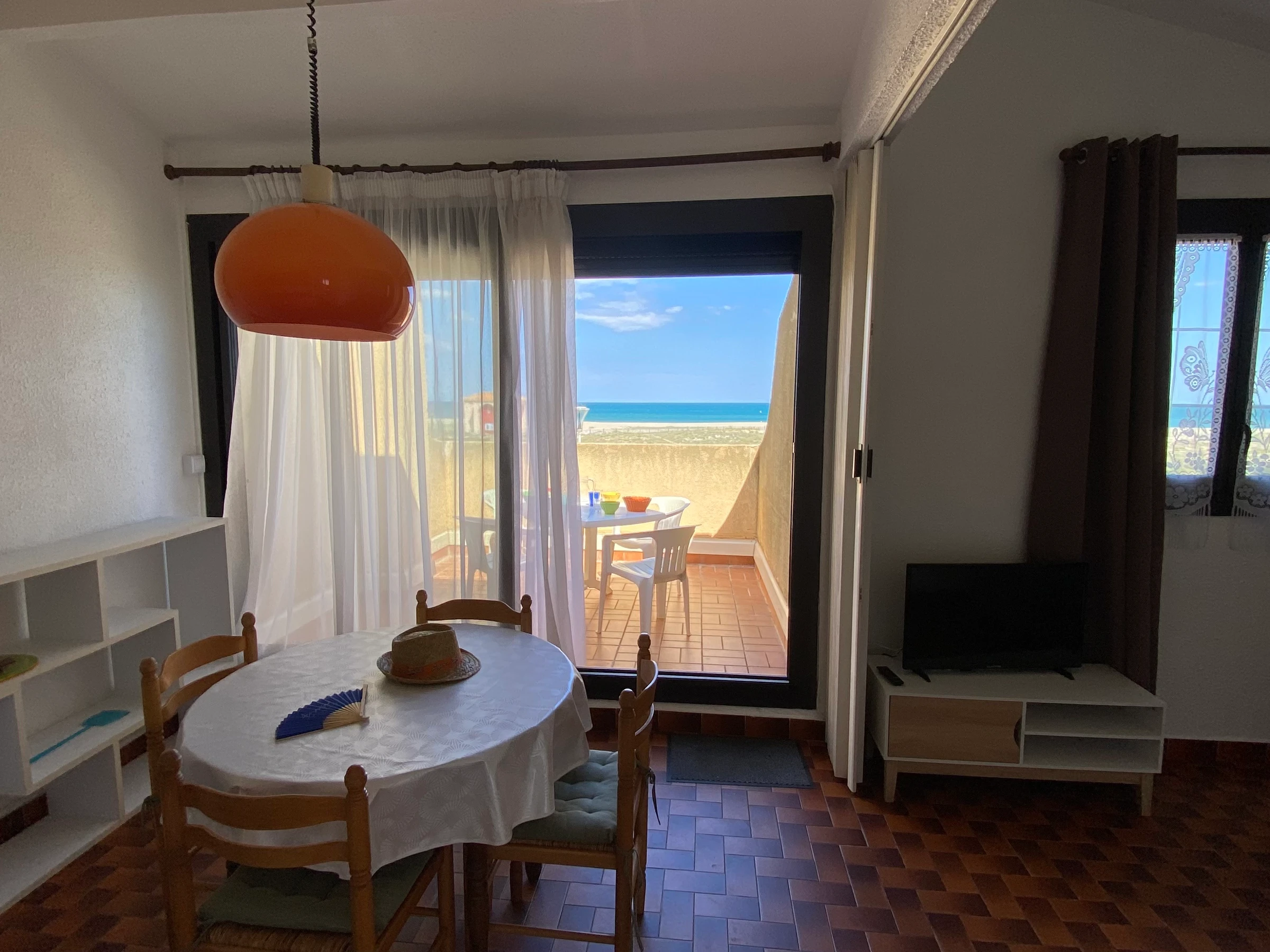 Agradable terraza con impresionantes vistas al mar. Amplio salón con aire acondicionado, salón (sofá cama), cocina americana equipada, una habitación (dos camas individuales), un baño y un aseo independiente.