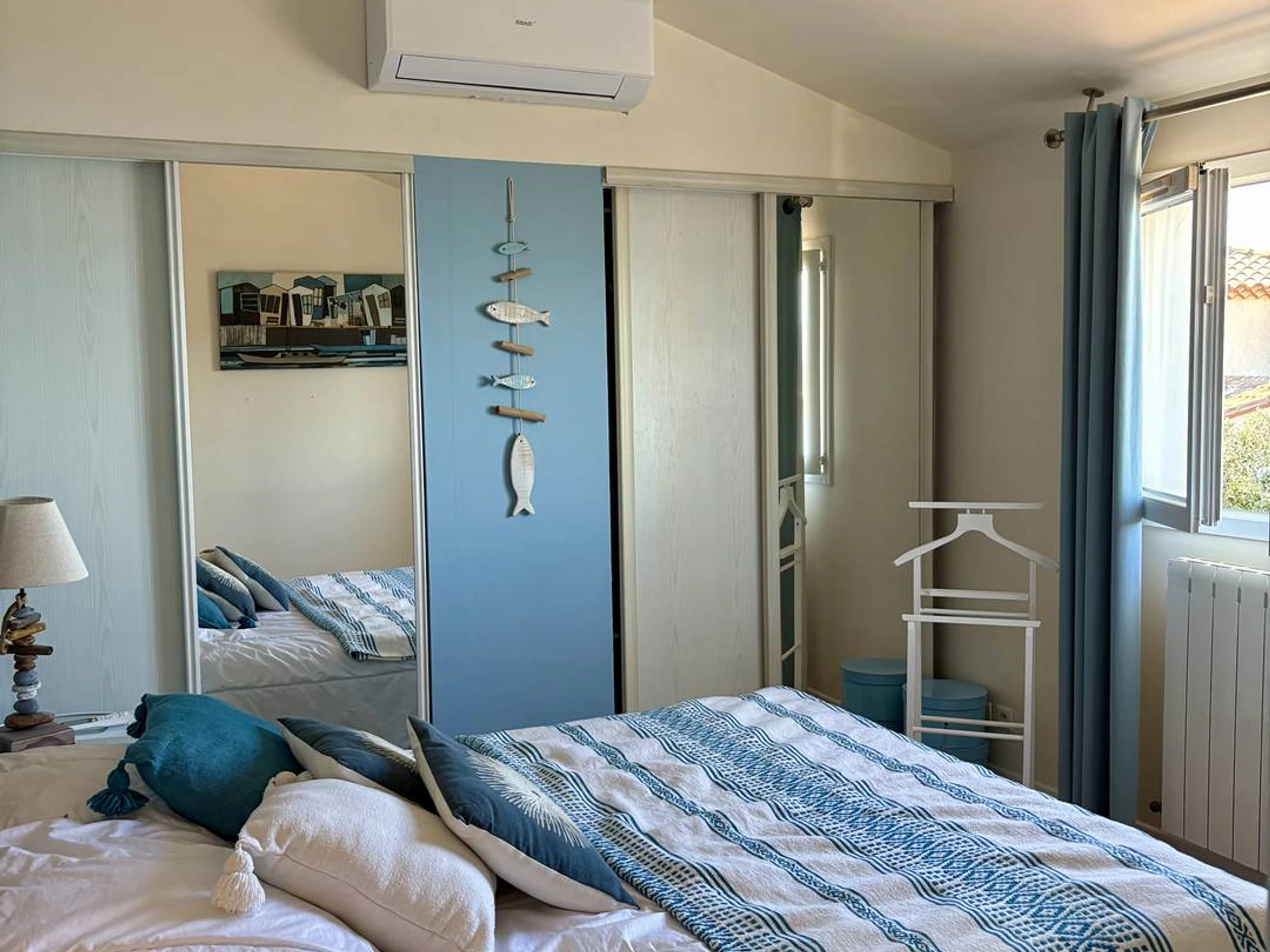 un dormitorio con una cama doble (160 cm), también con aire acondicionado y un amplio armario.