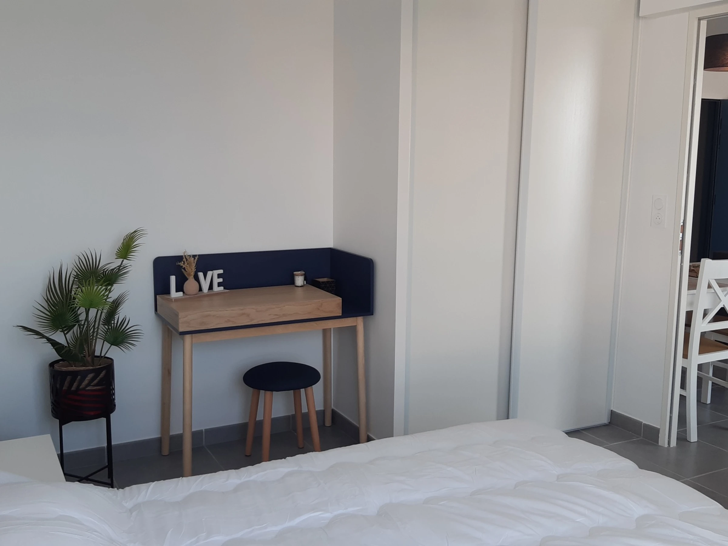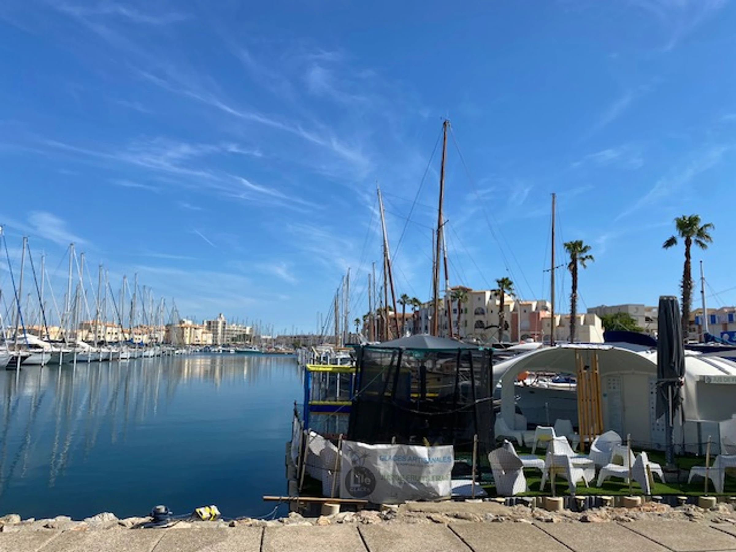 Residencia Les Voiles Blanches. Precioso apartamento de un dormitorio situado en la segunda planta con ascensor, con orientación noroeste. Ideal para 4 personas. Alojamiento moderno, decorado con gusto y muy bien equipado para satisfacer a nuestros huéspedes. Luminoso salón con aire acondicionado (sofá cama, TV, Wi-Fi, Orange Livebox, Canal+) que da a una cocina americana muy bien equipada (nevera grande, lavavajillas, horno) y a una agradable terraza con vistas al canal de la laguna de agua salada y vistas parciales al puerto (sillones, tumbonas). Un dormitorio (cama doble, TV, escritorio pequeño) y un baño completo con lavadora.