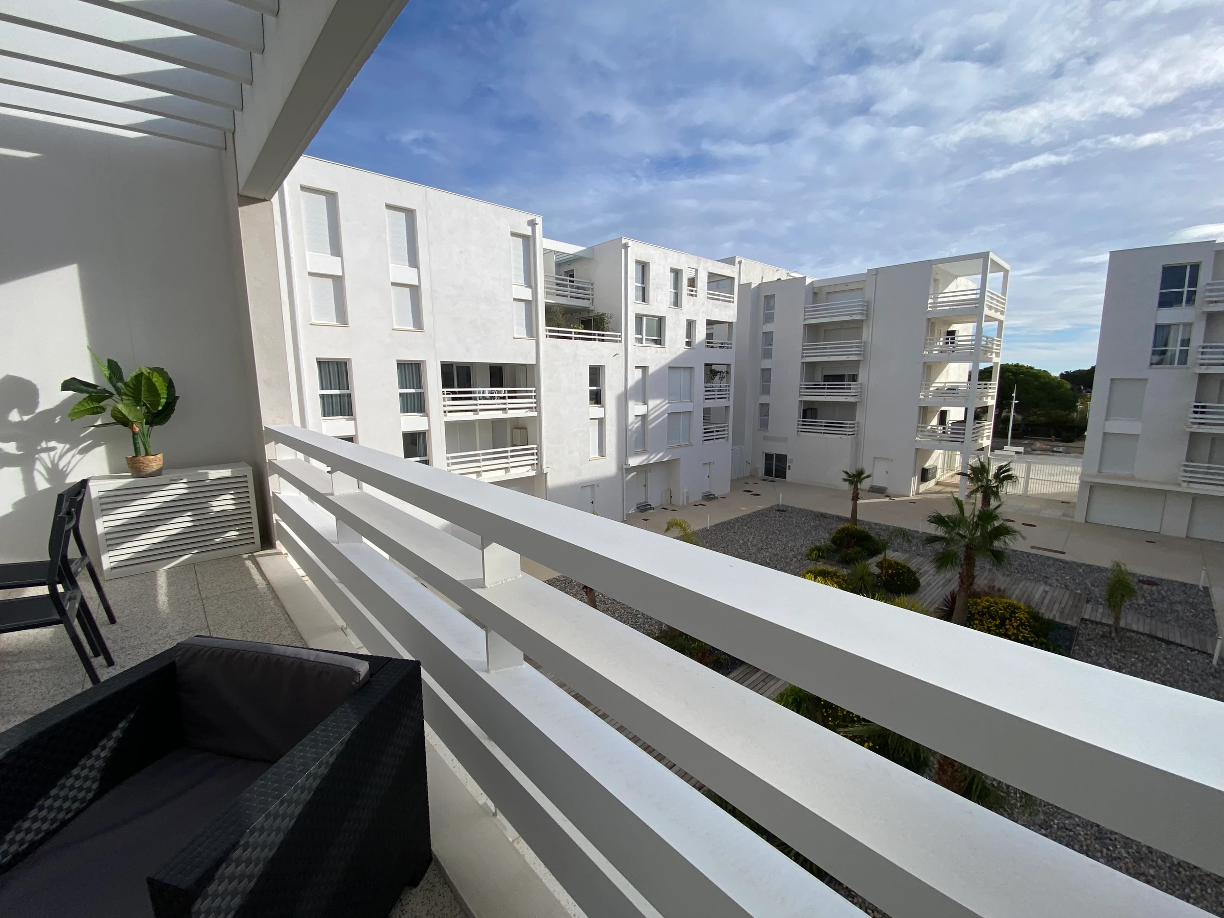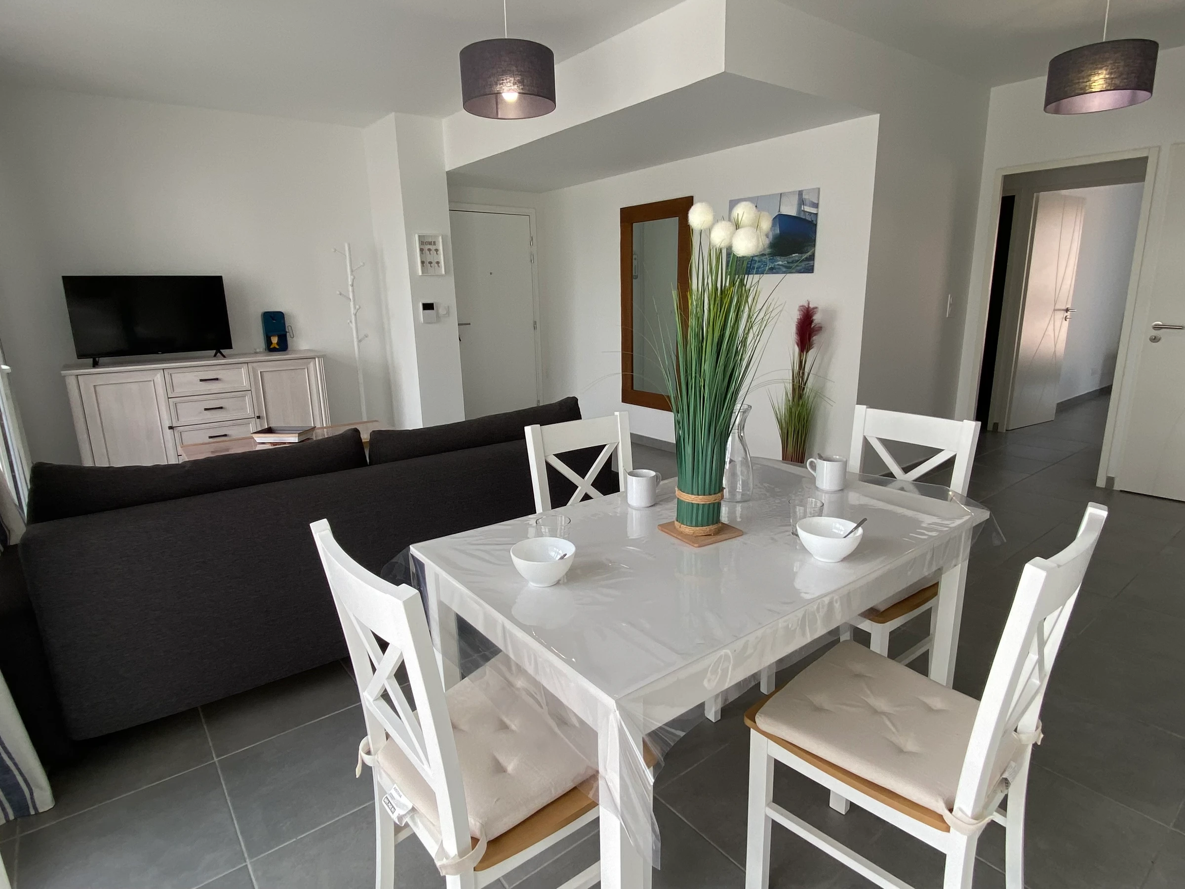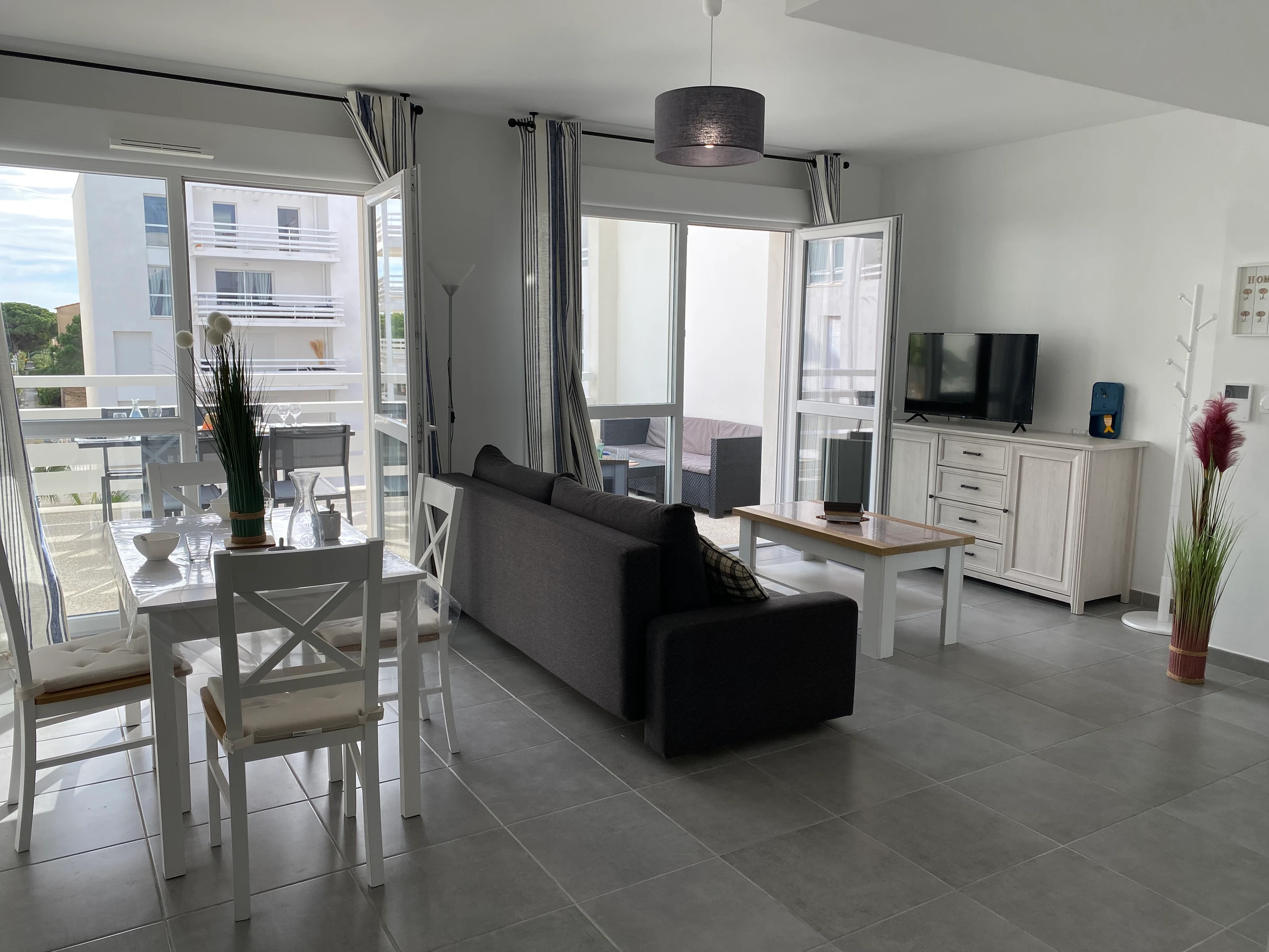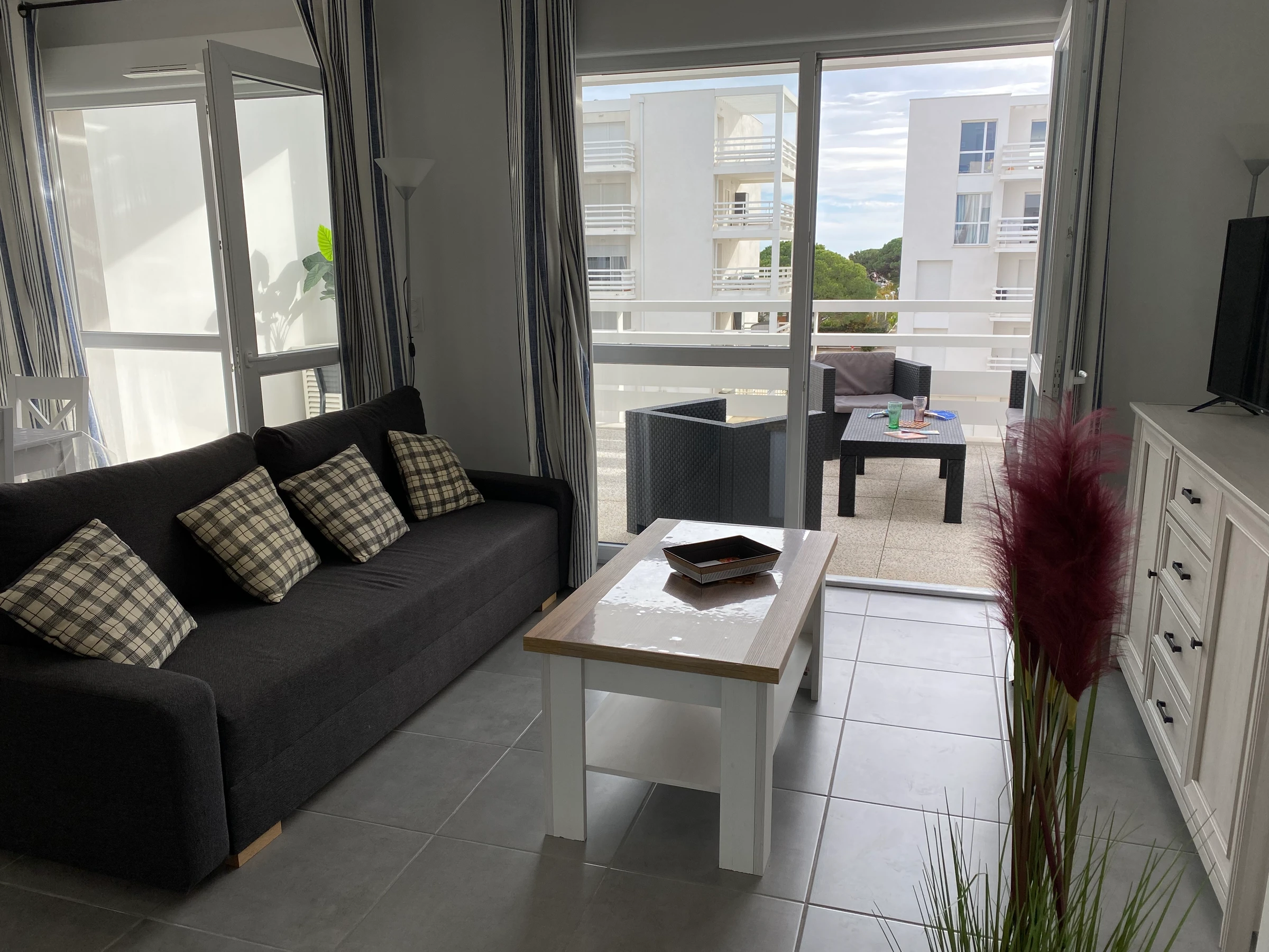 Puerto Leucate. Residencia Les Voiles Blanches. Precioso apartamento de 2 dormitorios ubicado en la 2.ª planta con ascensor, con orientación sureste. Ideal para 6 personas. Luminoso salón con aire acondicionado (sofá cama, TV) que da a una cocina totalmente equipada (nevera grande, lavavajillas, horno) con acceso a una amplia terraza (muebles de jardín, banco, sillones), un dormitorio (cama doble), vestidor, un dormitorio (cama doble + cuna de viaje), vestidor, un baño con ducha (lavadora) y un aseo independiente. Ropa de cama y toallas incluidas durante su estancia. Servicio de limpieza incluido. Dispone de una plaza de aparcamiento en un garaje cerrado y seguro dentro de la residencia. No se admiten mascotas. A solo 400 m de la playa... Disfrute de interiores confortables y un agradable espacio exterior... ¡Bienvenido a bordo!
