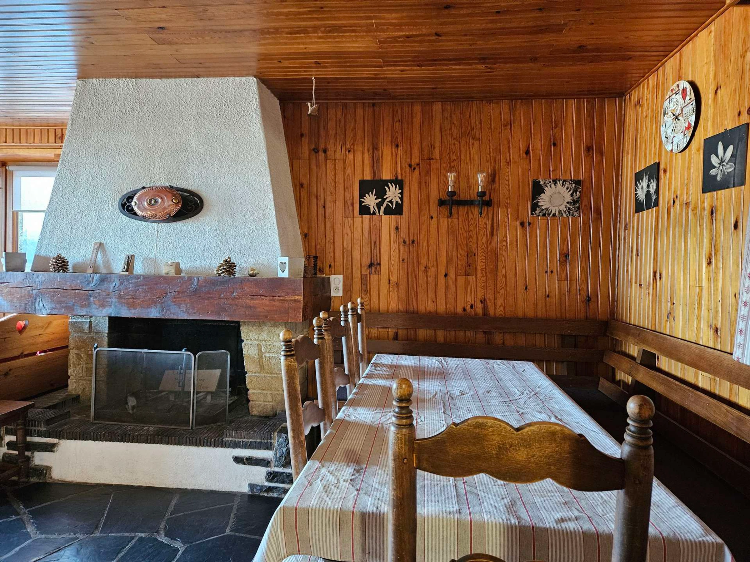 * Salón: TV, rincón comedor, chimenea decorativa, muebles rústicos, sillones, acceso al balcón;