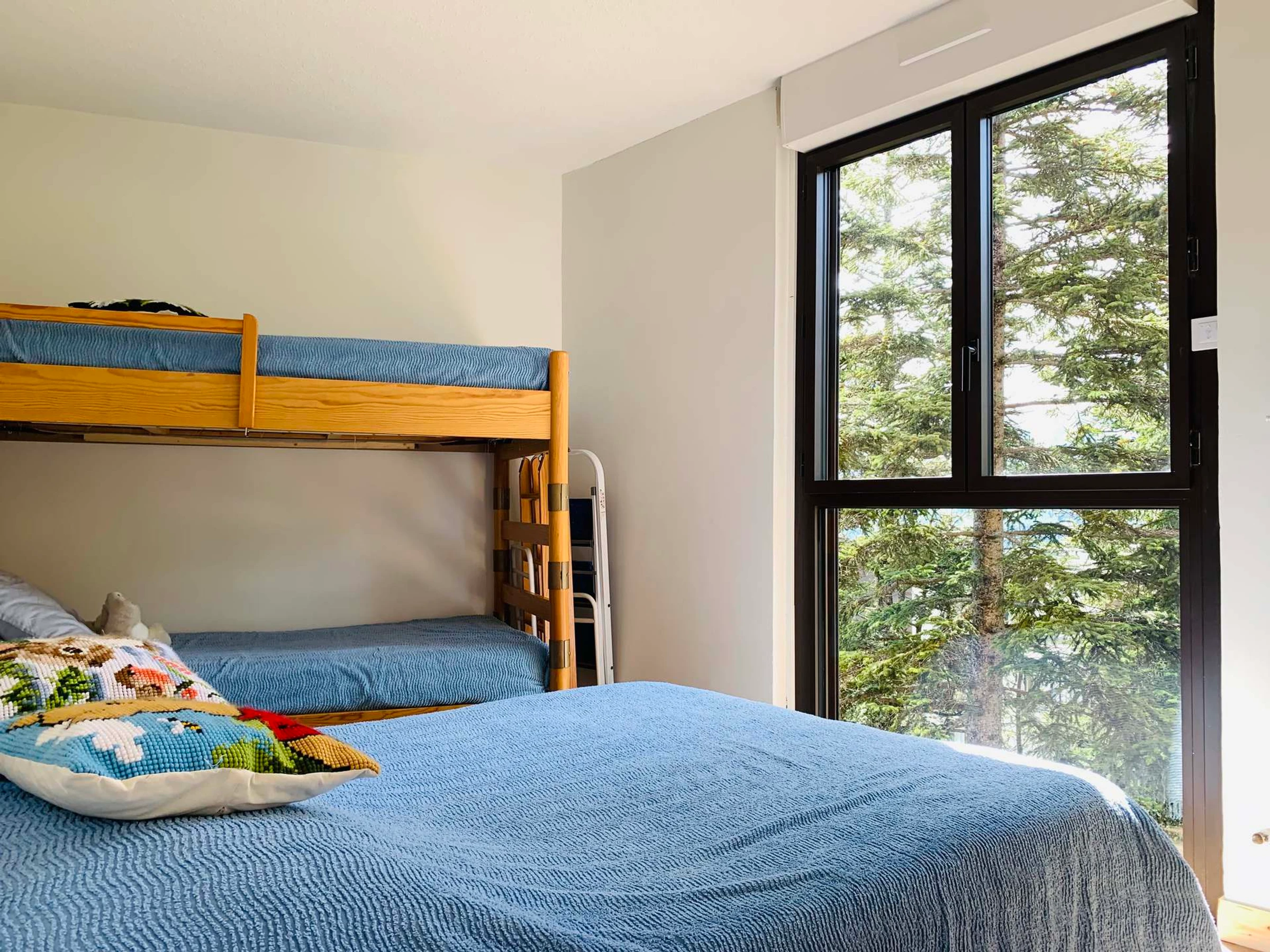 * Dormitorio 2: 1 cama doble (140 x 190 cm), 2 literas individuales (90 cm), pequeño lavabo, armario, ventana de doble acristalamiento con persiana eléctrica;