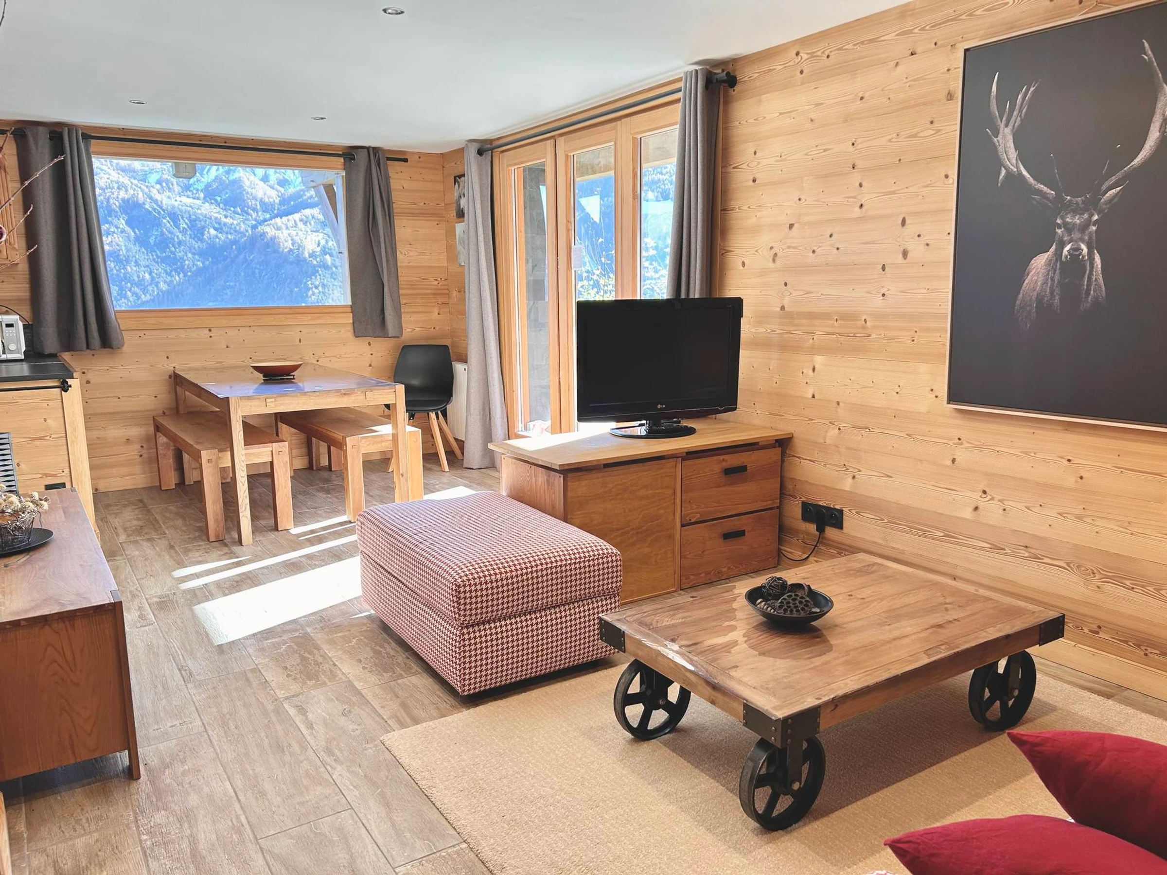 * Salón: TV HD, sofá cama Rapido de 140 cm, acceso a la terraza, comedor con mesa para 8 personas y persianas de madera;