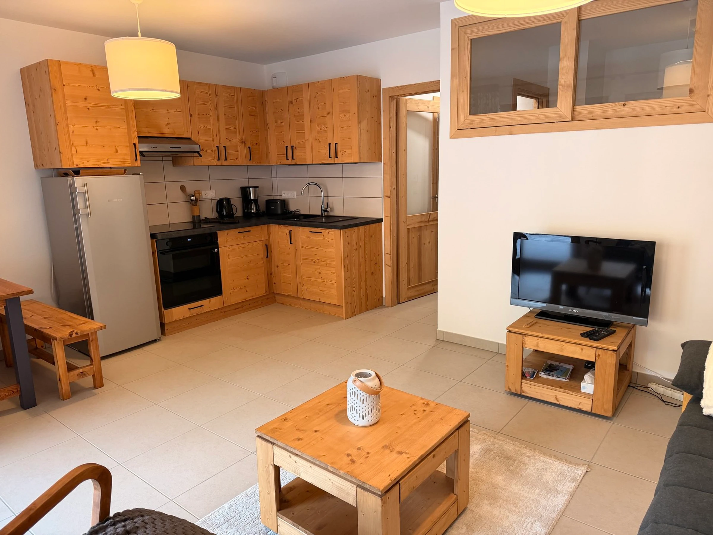 Salón-cocina (horno, frigorífico, lavavajillas, vitrocerámica, sofá, televisión).