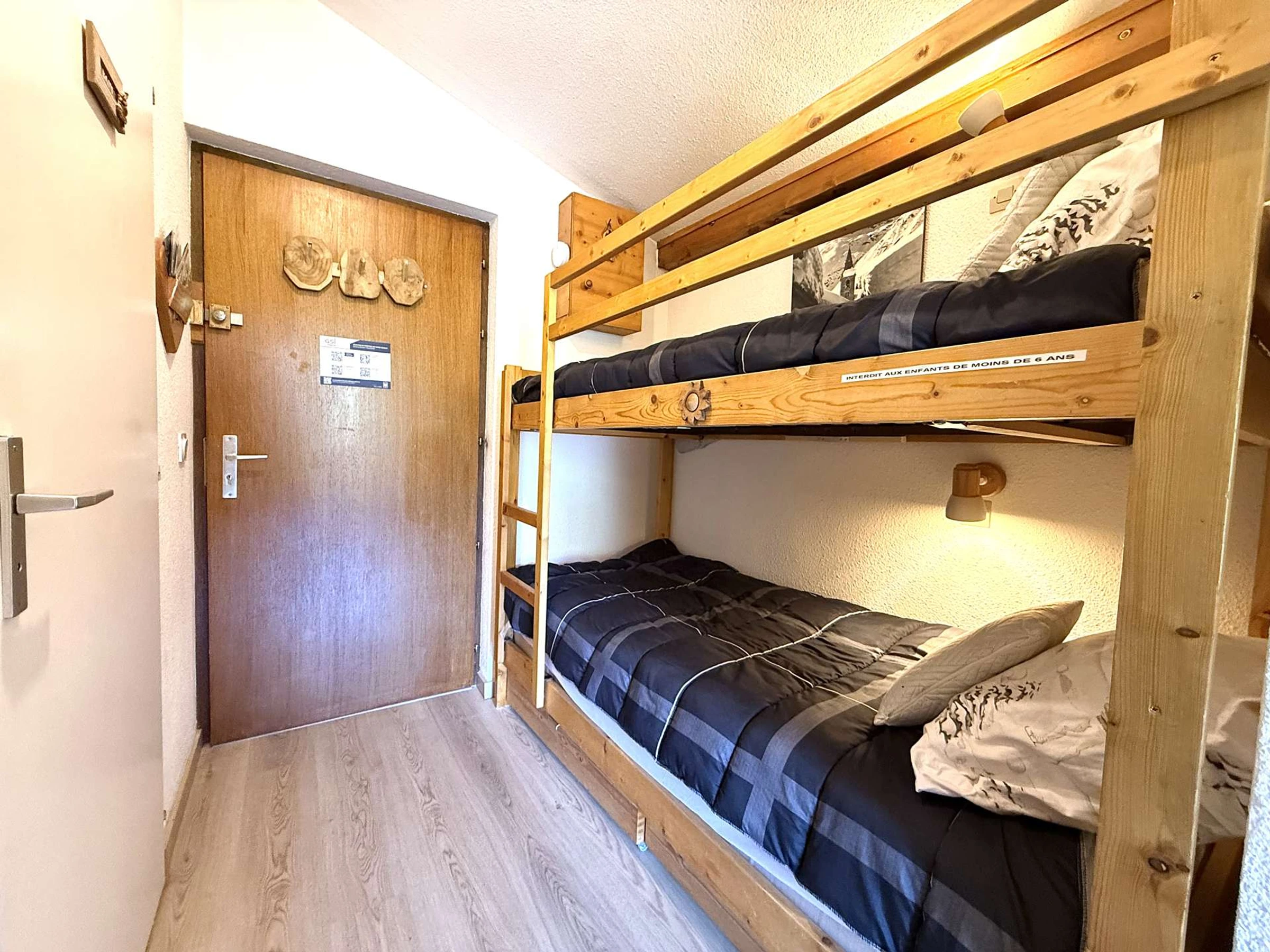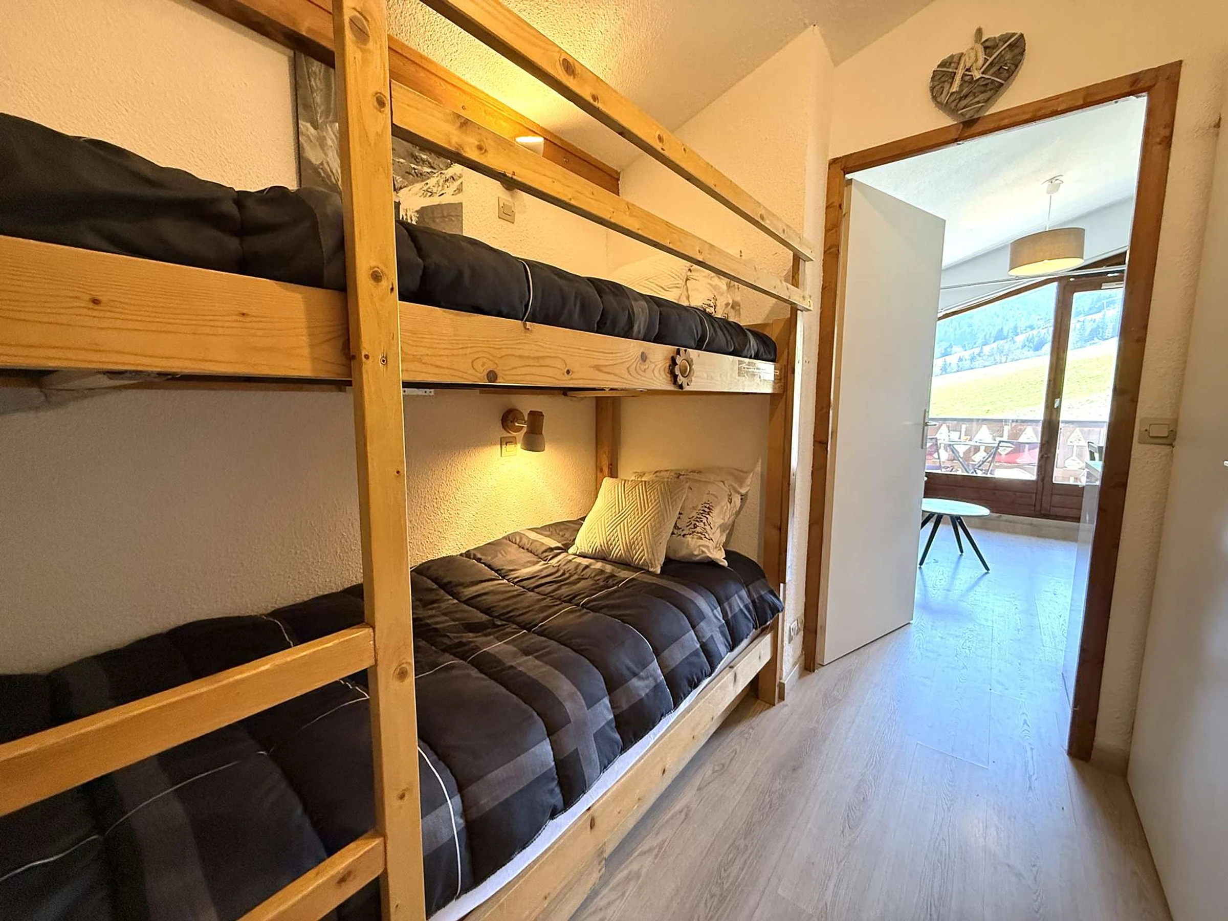 Este apartamento de dos habitaciones, ubicado en la segunda planta de la residencia (sin ascensor), incluye un recibidor con una litera doble, un salón-comedor con sofá cama, una cocina americana totalmente equipada, un dormitorio con una cama doble en el ático, un baño y un aseo independiente.