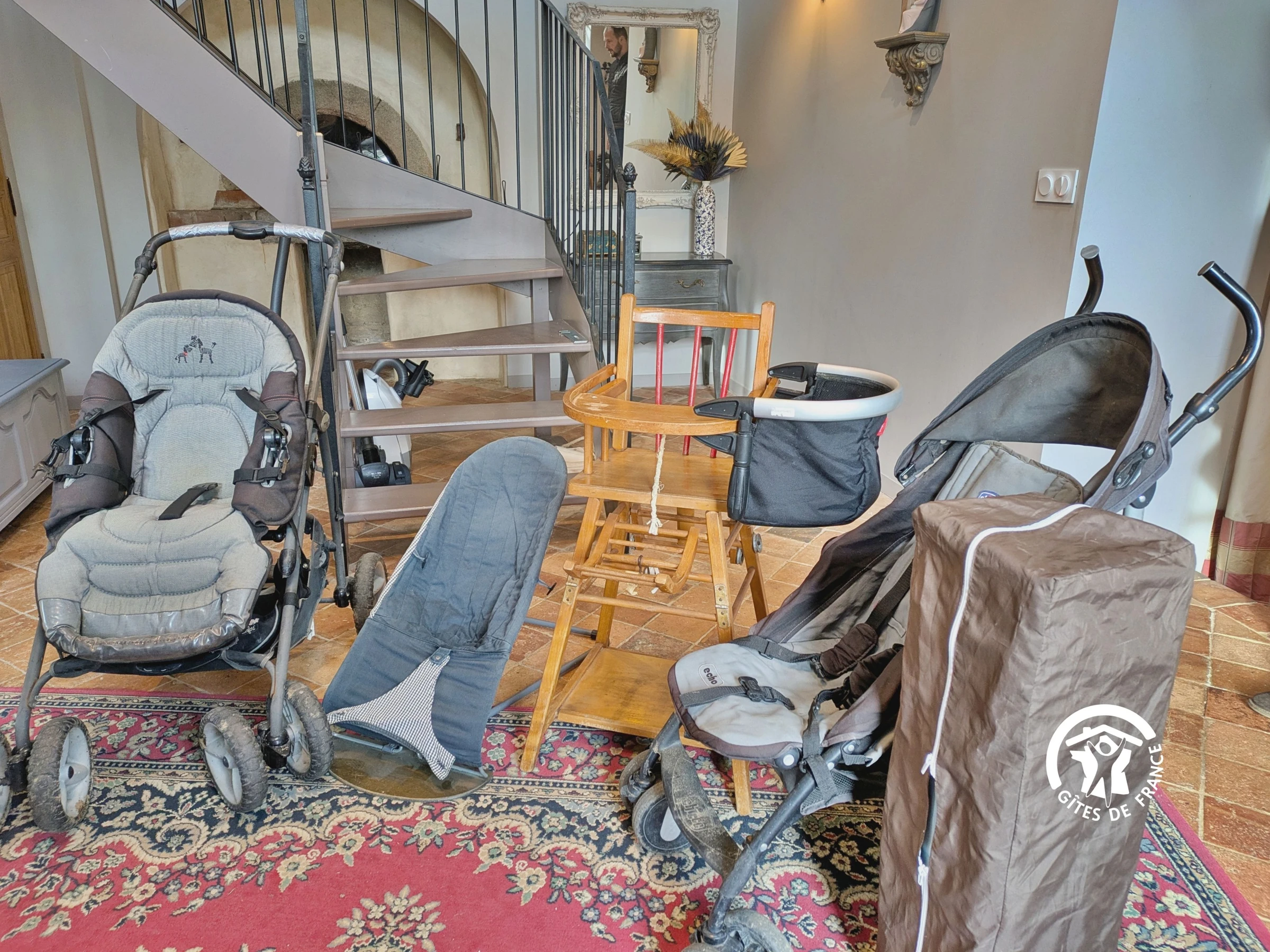 Para bebés: 1 cuna de viaje - 1 cuna para recién nacidos - 1 trona y 1 elevador - 1 batidora de vaso - 1 cambiador - 2 taburetes - 1 bañera para bebés - 2 cochecitos (uno todoterreno y otro ligero) - 1 parque infantil - 1 hamaca para bebés.