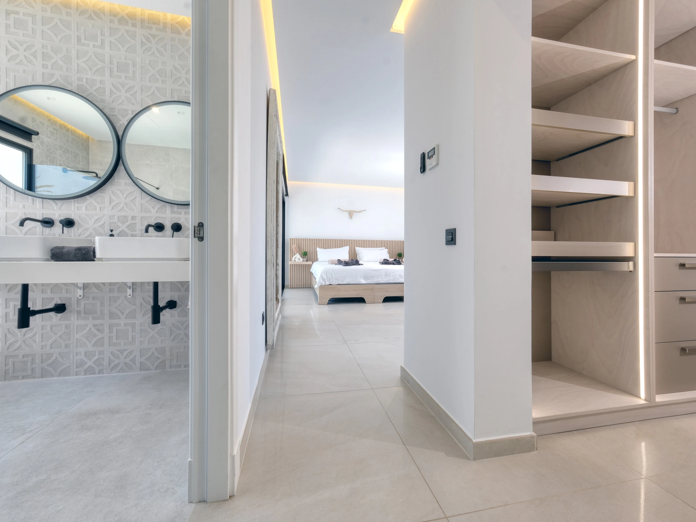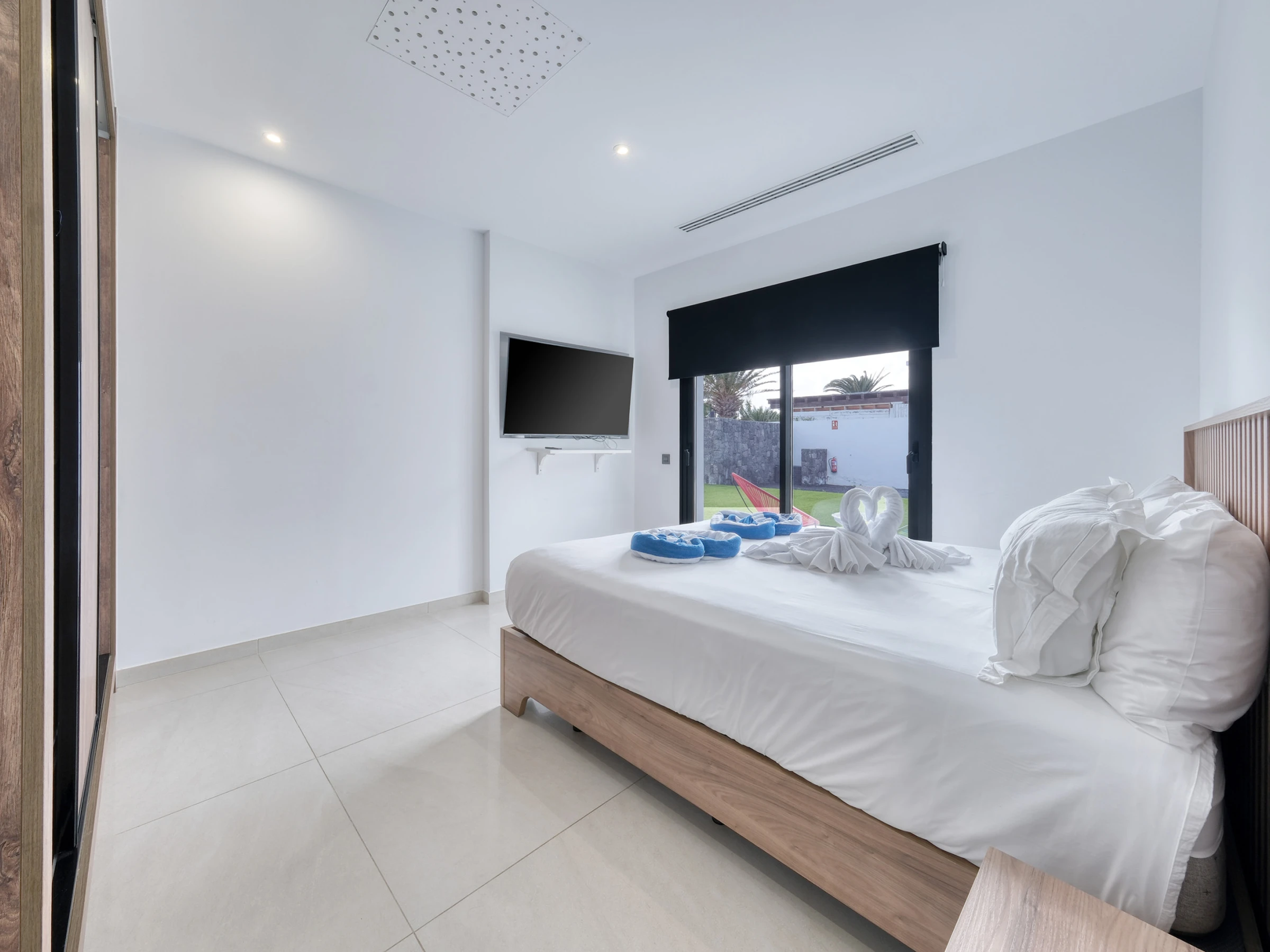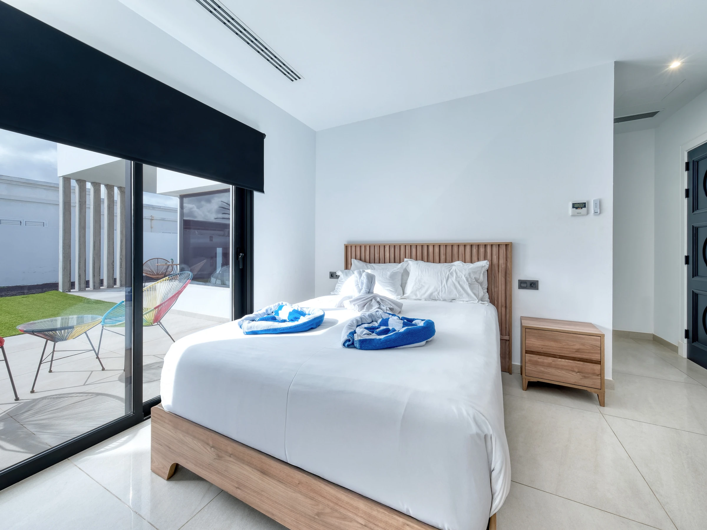 La villa dispone de cuatro elegantes habitaciones dobles con camas de matrimonio y tres baños completos con ducha. Uno de ellos cuenta además con una bañera con vistas al exterior, donde cada detalle ha sido cuidadosamente seleccionado.