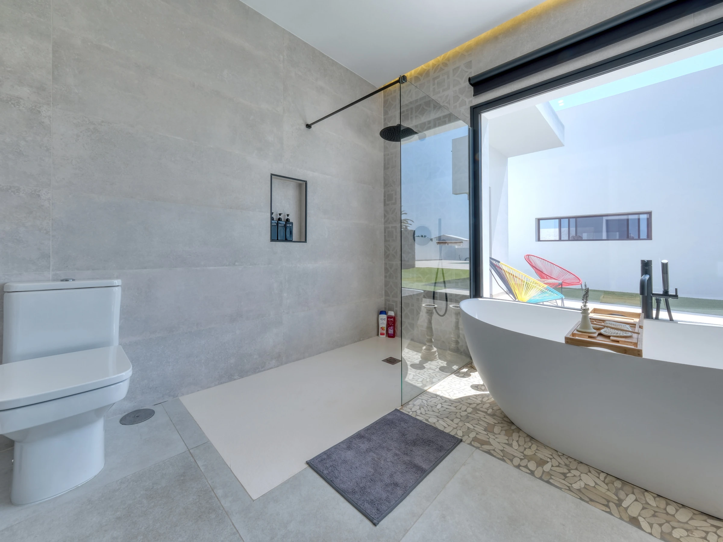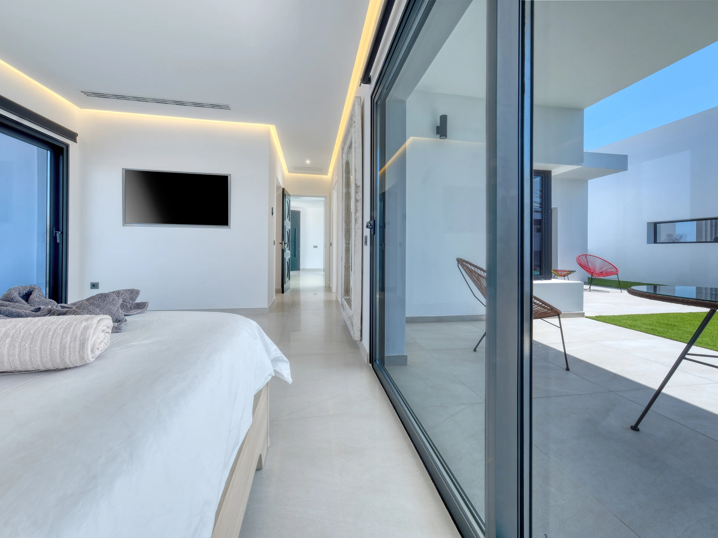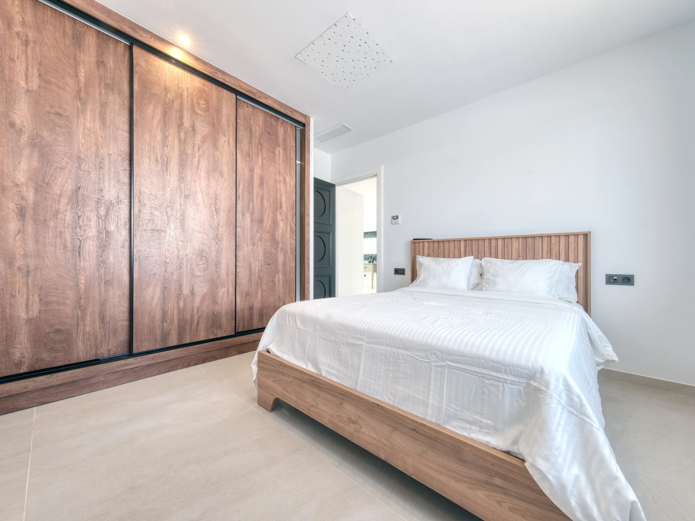La villa dispone de cuatro elegantes habitaciones dobles con camas de matrimonio y tres baños completos con ducha. Uno de ellos cuenta además con una bañera con vistas al exterior, donde cada detalle ha sido cuidadosamente seleccionado.