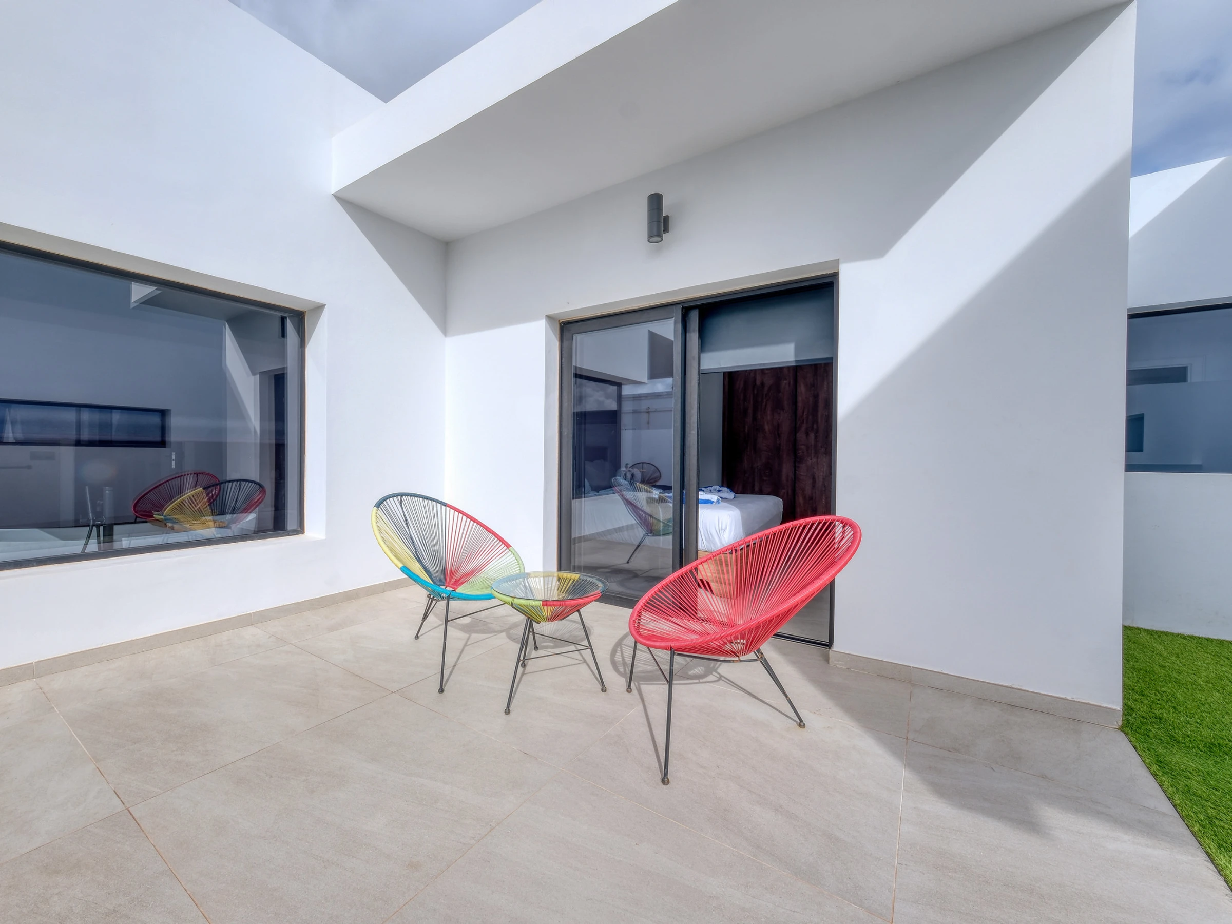 En la planta alta, un segundo solárium ofrece espectaculares vistas al mar, a la isla de Fuerteventura y a las montañas de Lanzarote. Esta terraza superior se convierte en el rincón perfecto para contemplar el amanecer o despedir el día con una copa al atardecer, rodeado de belleza natural en todas direcciones.