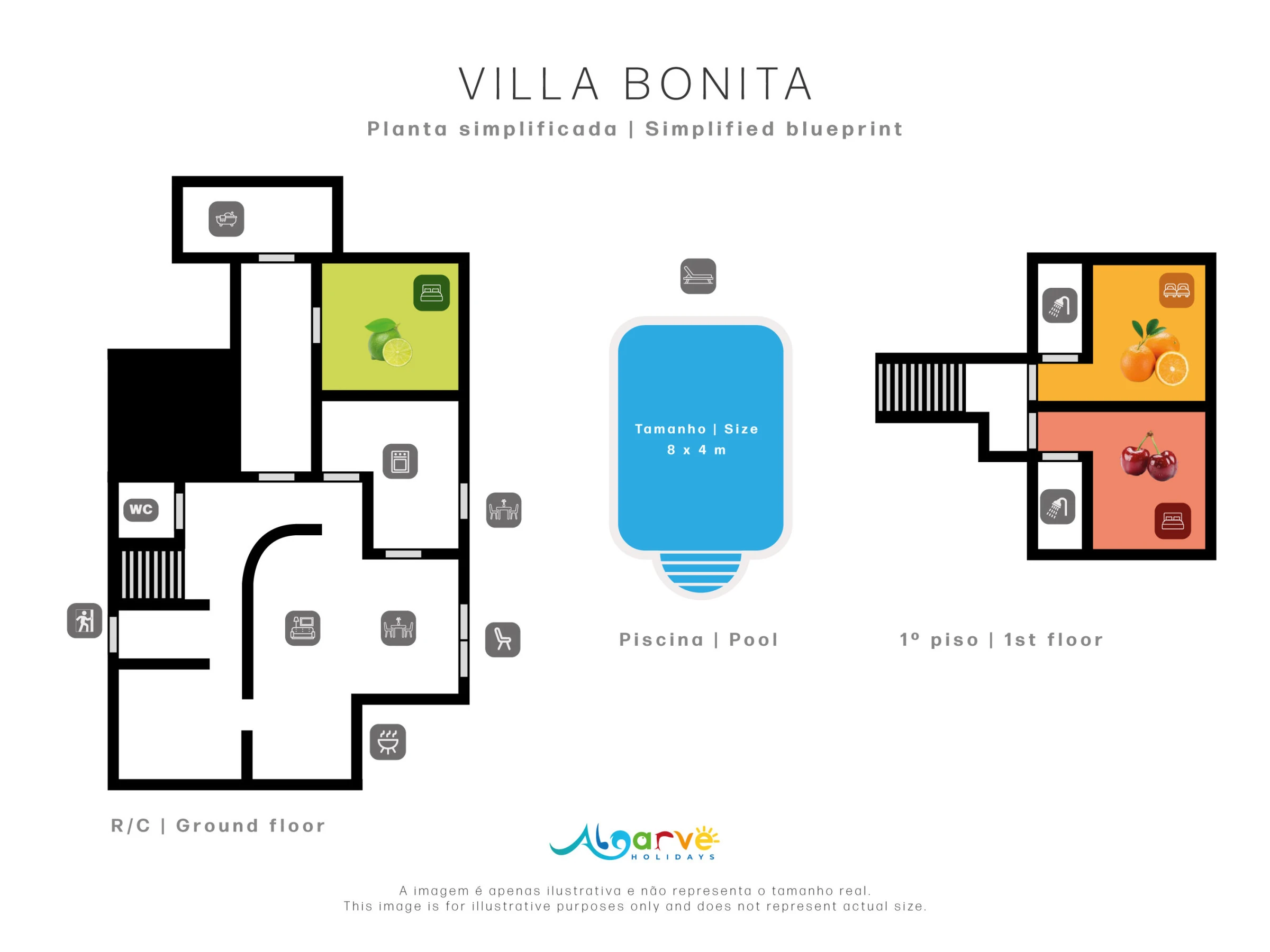 Entre y descubra tres dormitorios con aire acondicionado y baño en suite: dormitorio doble en planta baja con vista a la piscina, dormitorio doble principal en primera planta con terraza privada, y dormitorio de dos camas con balcón, todos espaciosos con gran luminosidad, ofreciendo a todos un espacio privado cómodo.