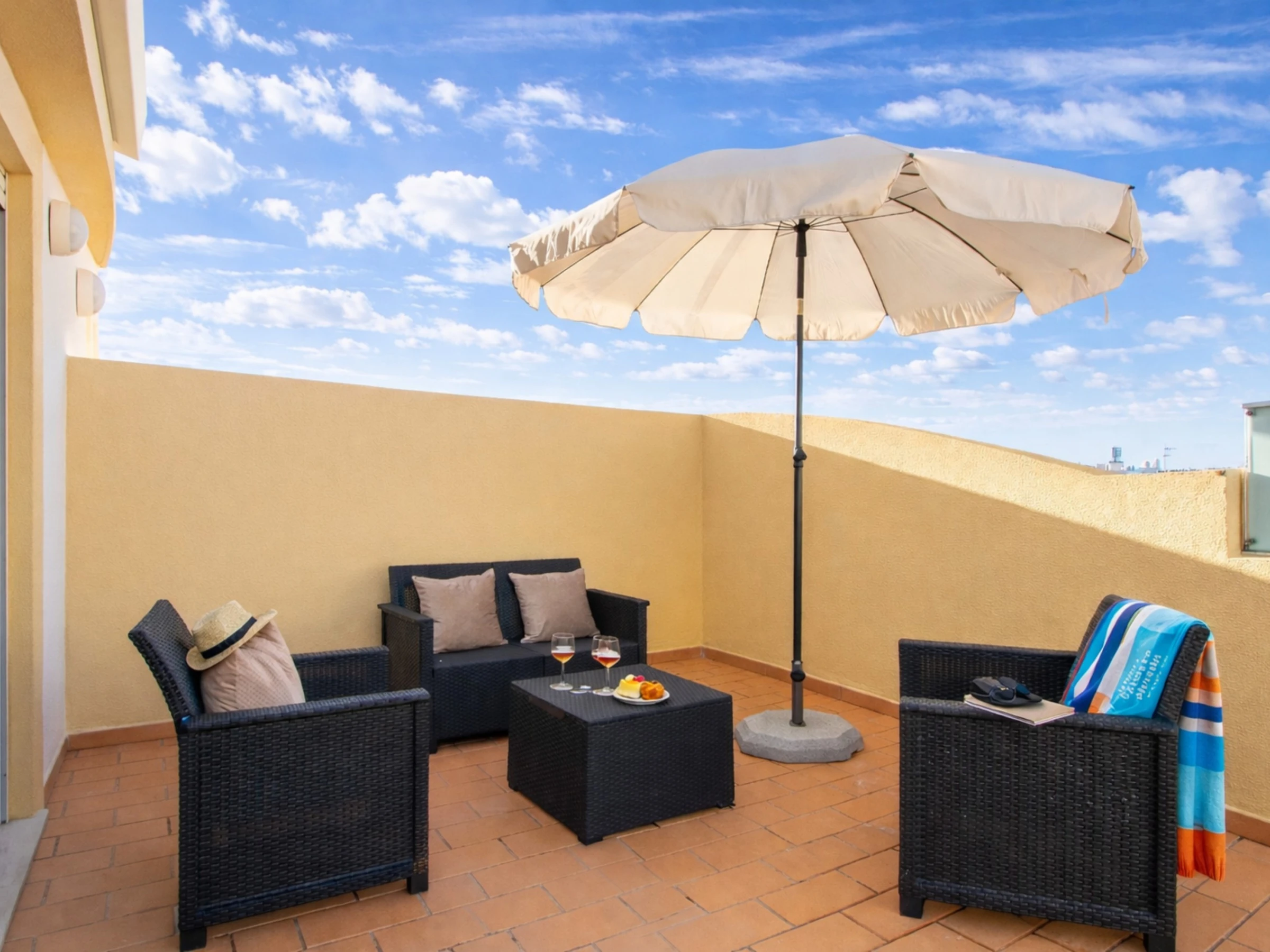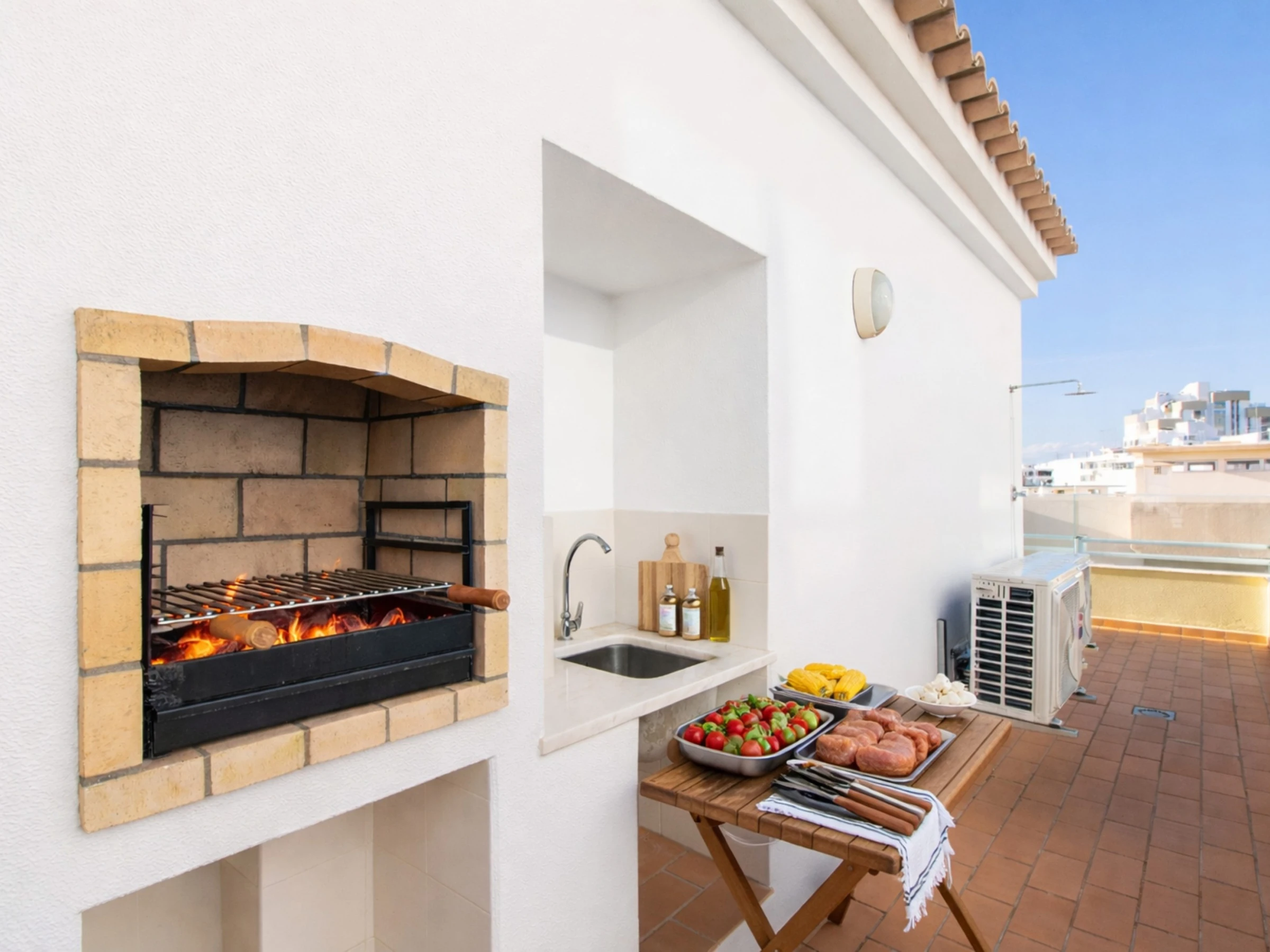 El balcón envuelve gran parte del apartamento y cuenta con mesa de comidas, sofás de exterior, barbacoa y lavavajillas, siendo un espacio muy valorado por los huéspedes.