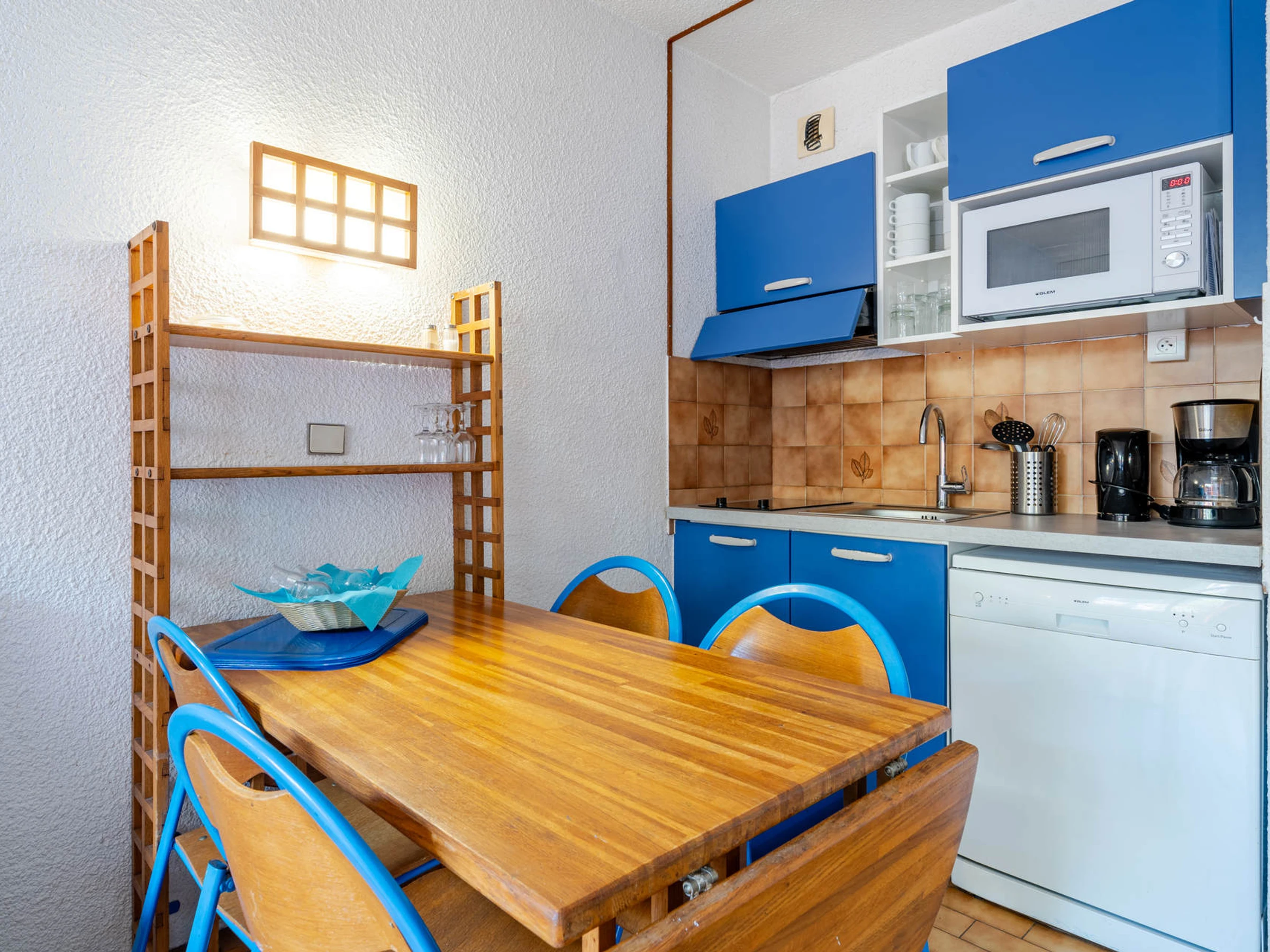 Cocina americana totalmente equipada: lavavajillas, microondas, frigorífico-congelador, tostadora, hervidor de agua y cafetera de filtro.
