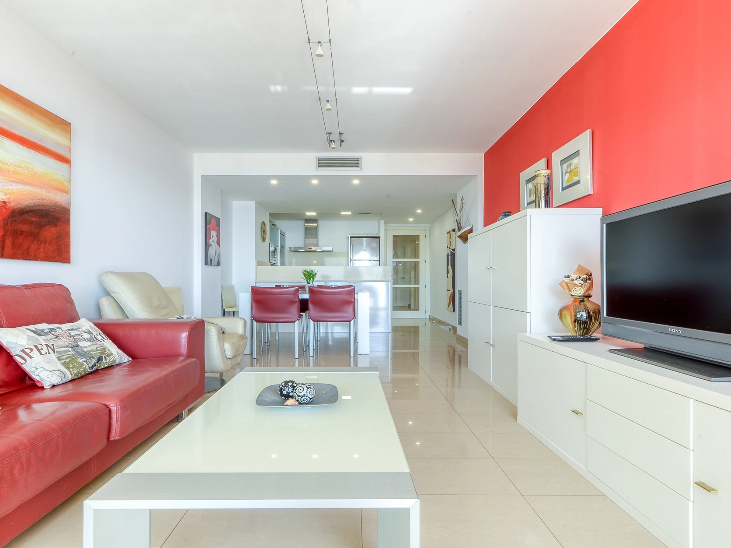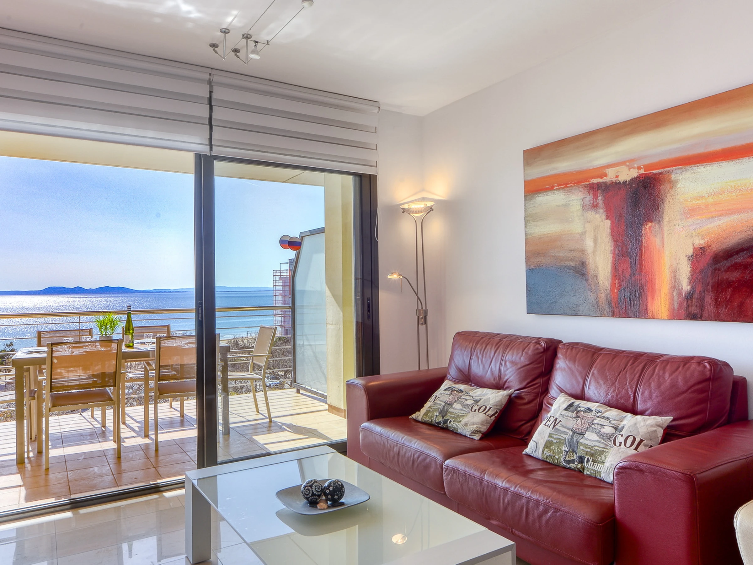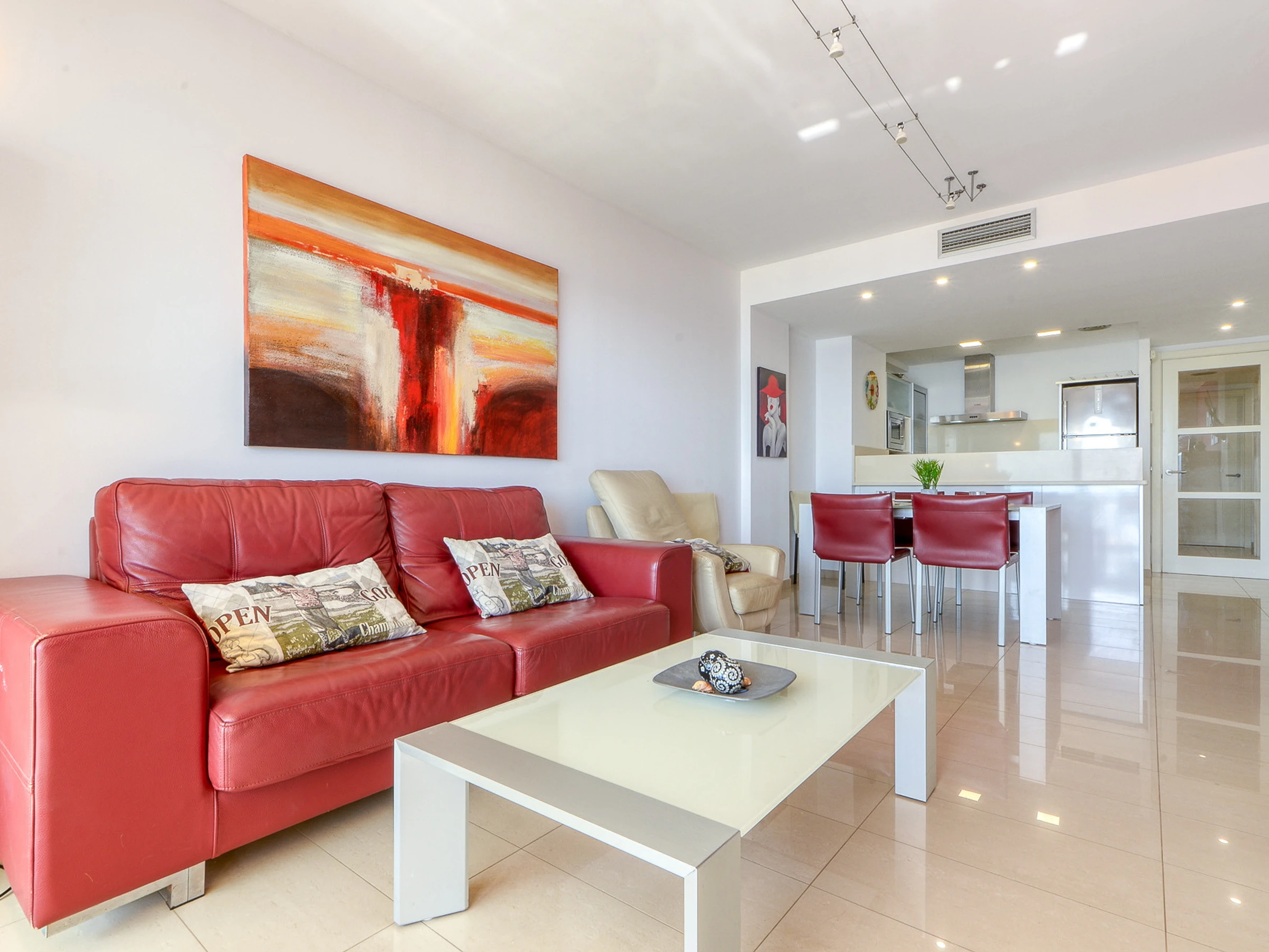 - Muy lindo living comedor con gran ventanal que da a la terraza con vista panorámica al mar, dos sofás, mesa, 6 sillas, aparador y mesas auxiliares. Cómoda. TV Satélite (canales en todos los idiomas). DVD.