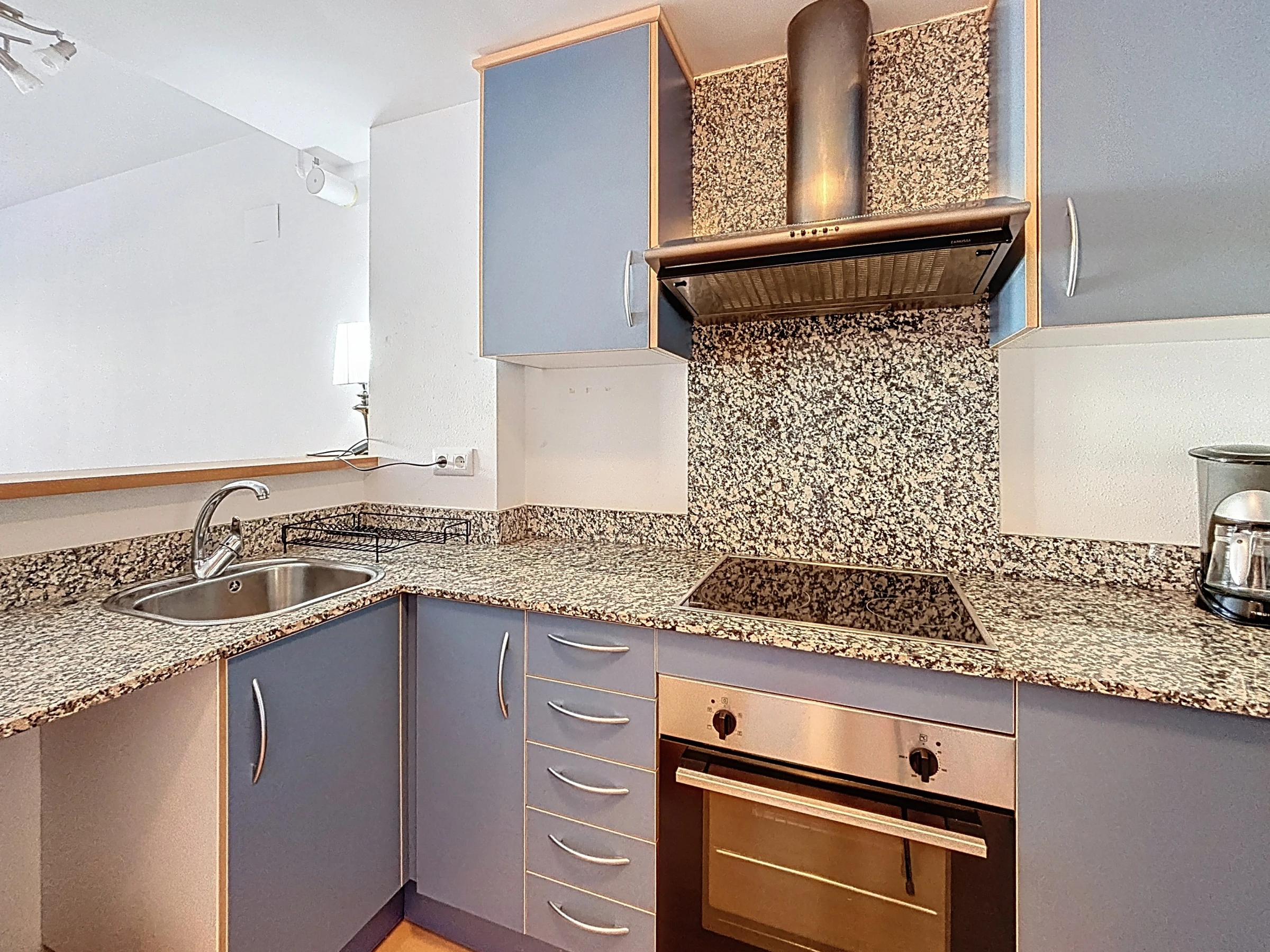 La cocina americana está completamente equipada: frigorífico-congelador, horno, microondas, placas de cocina, cafetera, tostadora, vajilla y utensilios necesarios.
