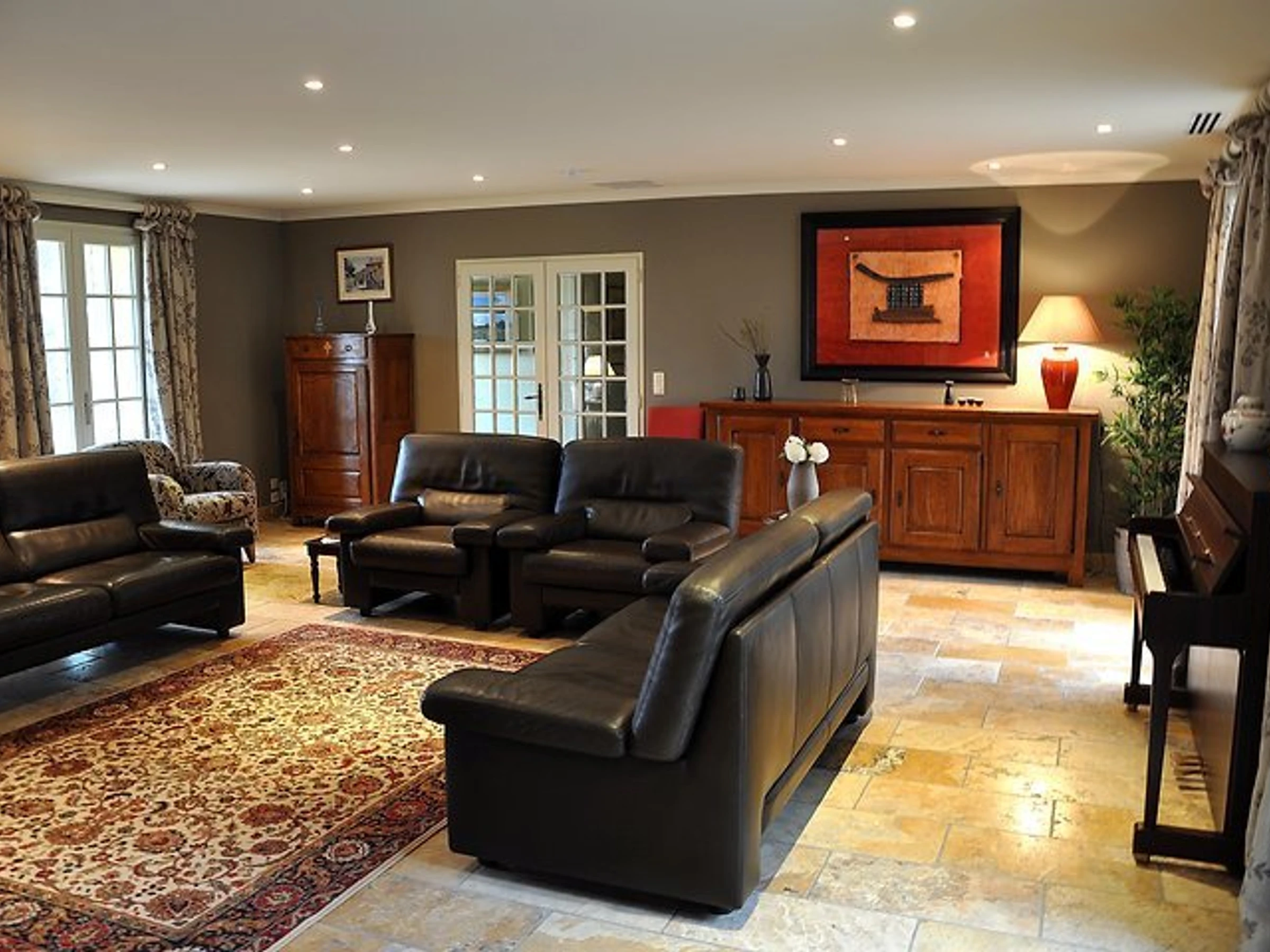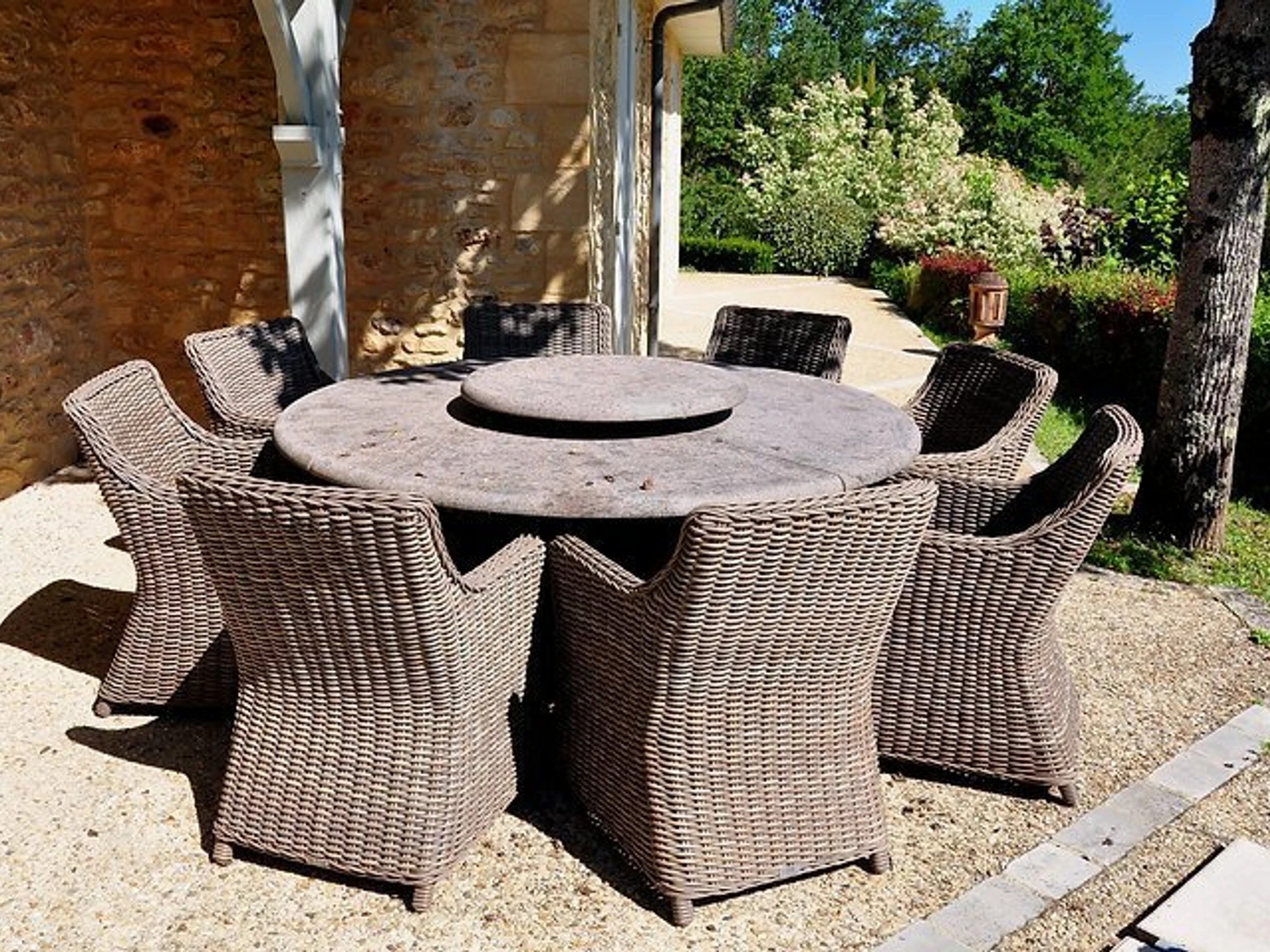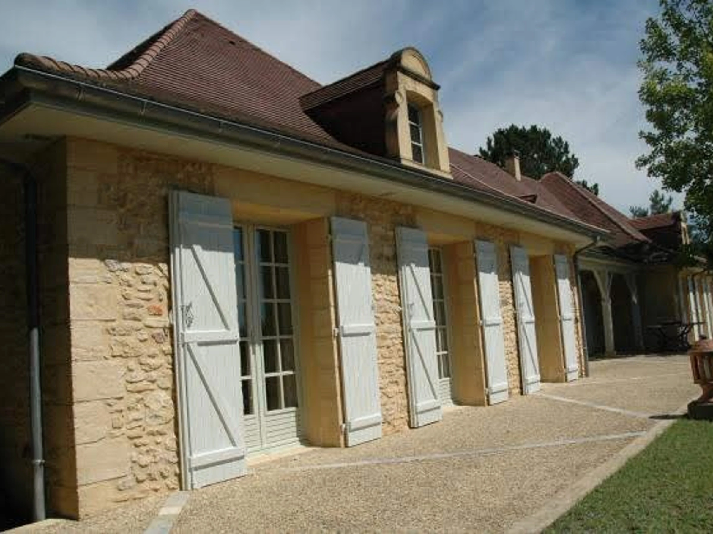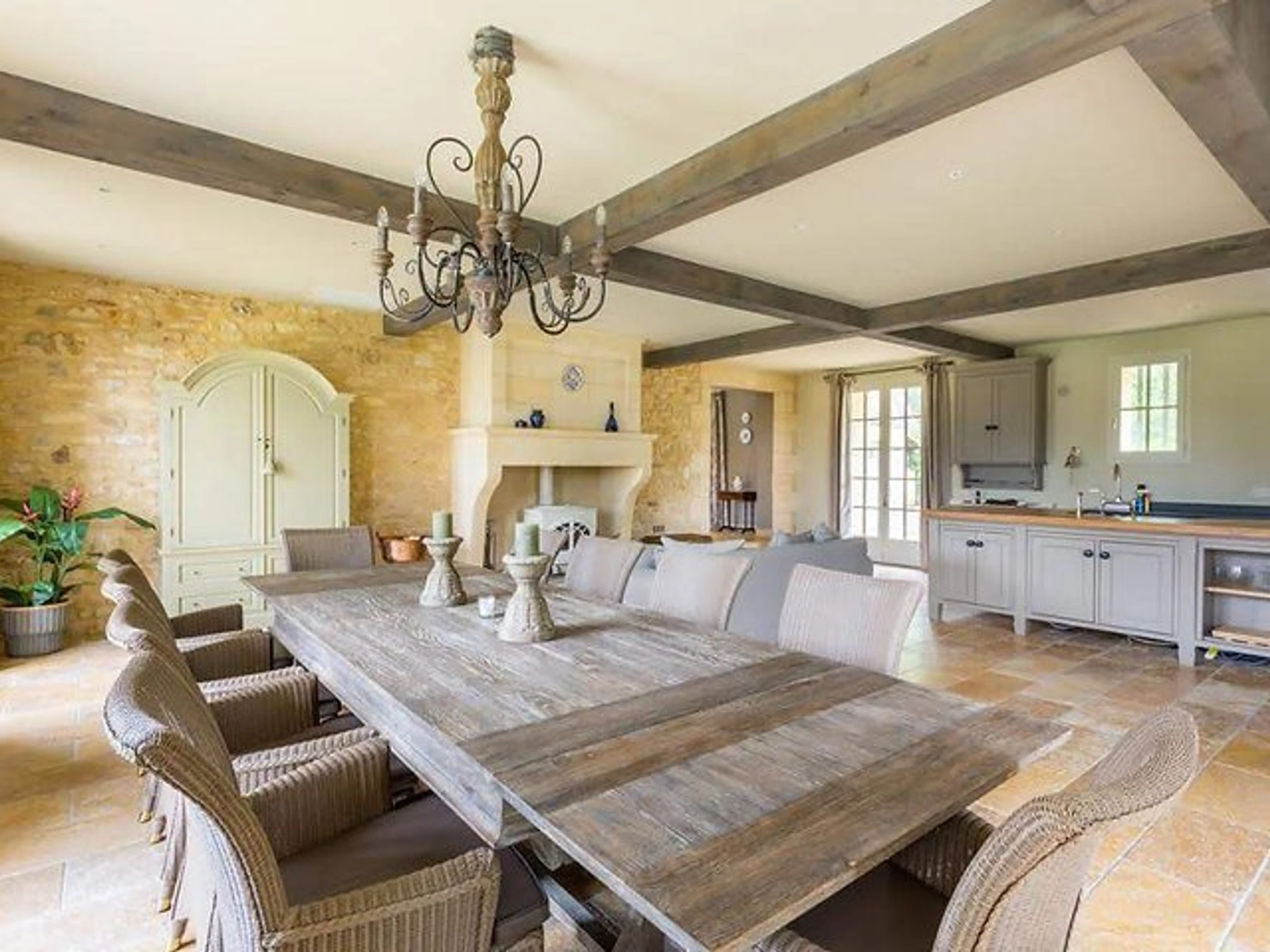 Todas las habitaciones de la casa principal cuentan con atractivas puertas francesas que dan a una larga terraza parcialmente cubierta que se extiende a lo largo de la parte delantera de la propiedad y ofrece vistas impresionantes al jardín, convirtiéndola en un lugar ideal para relajarse y disfrutar de la tranquilidad de la campiña del Périgord.