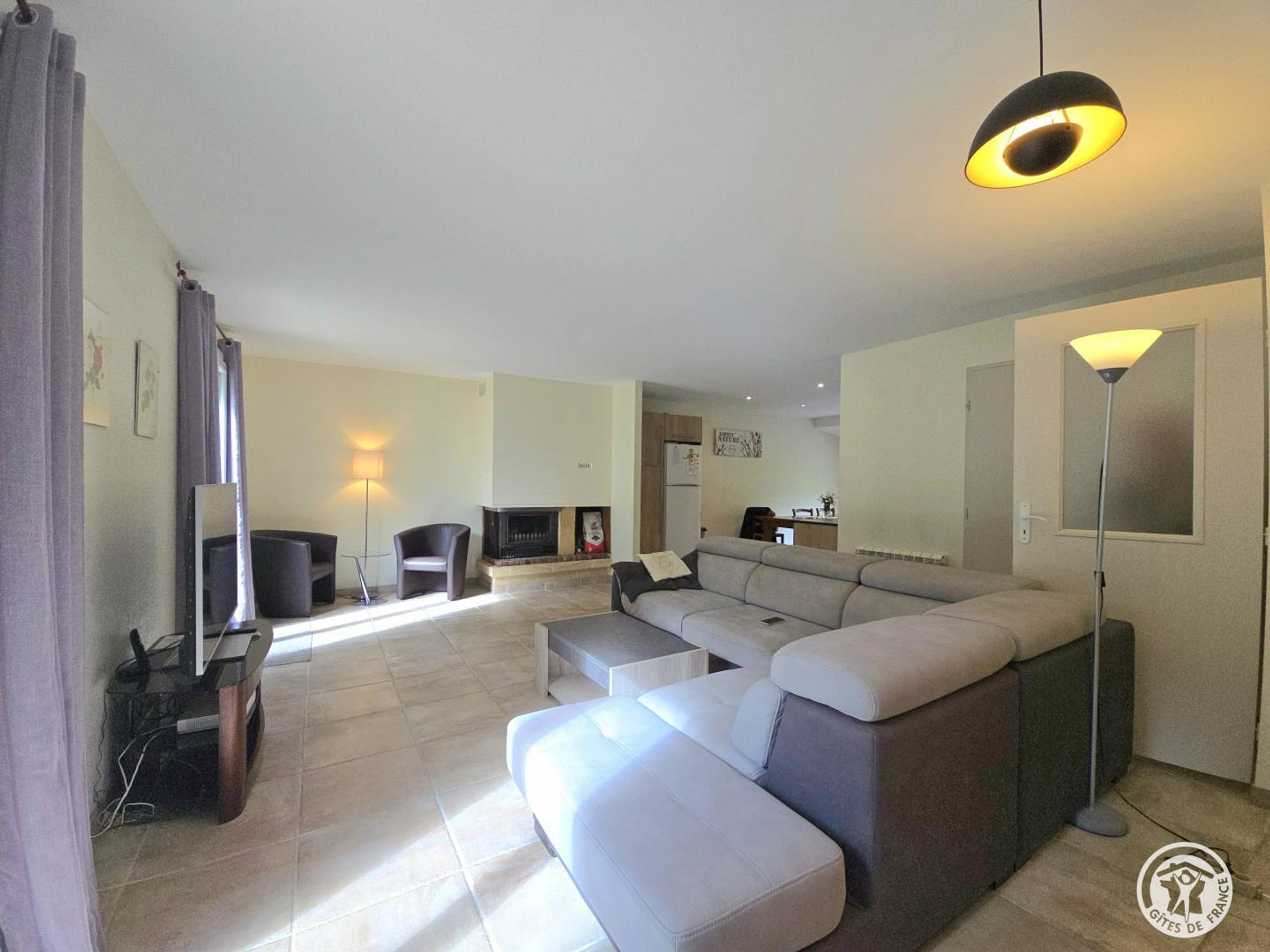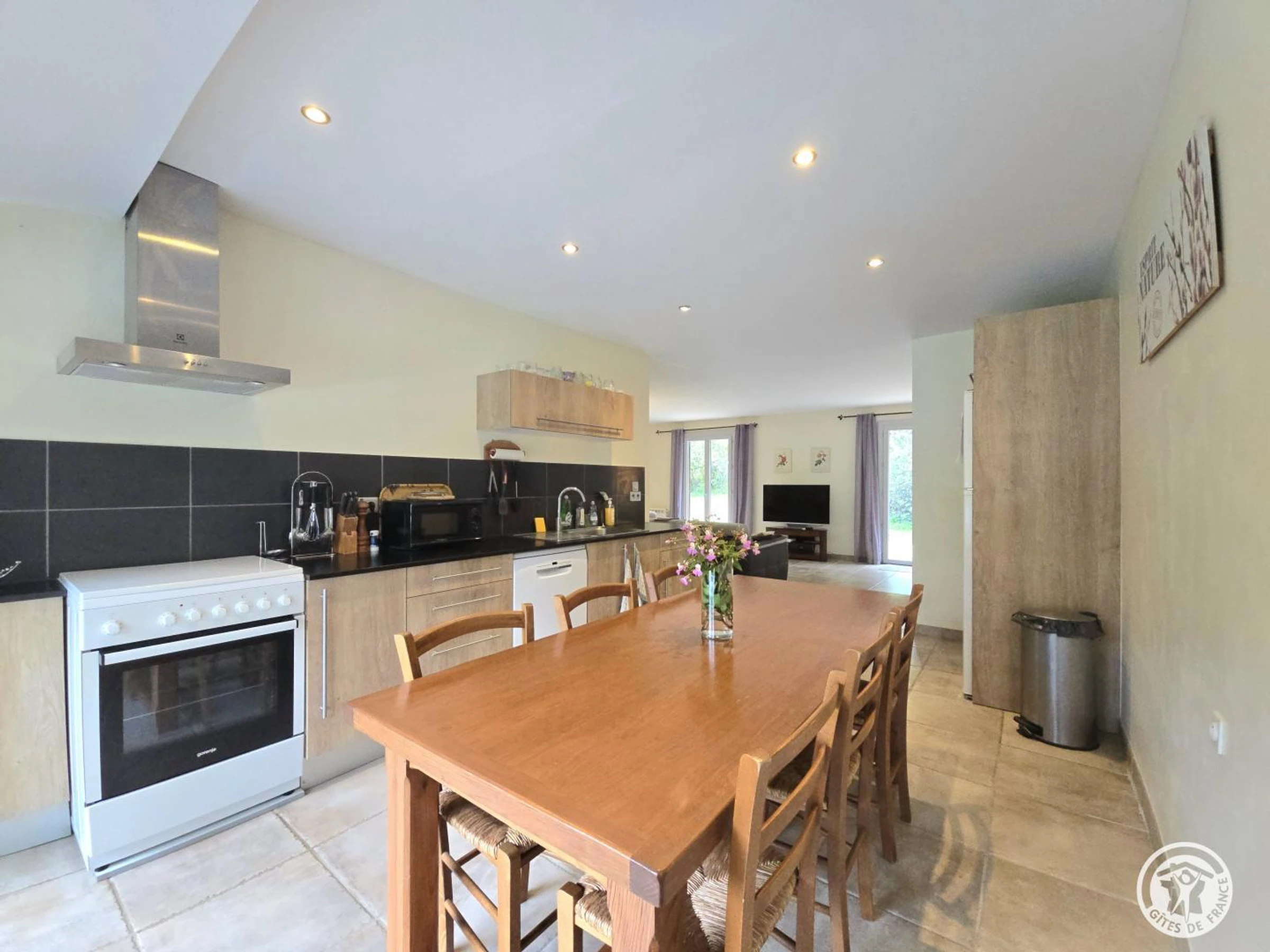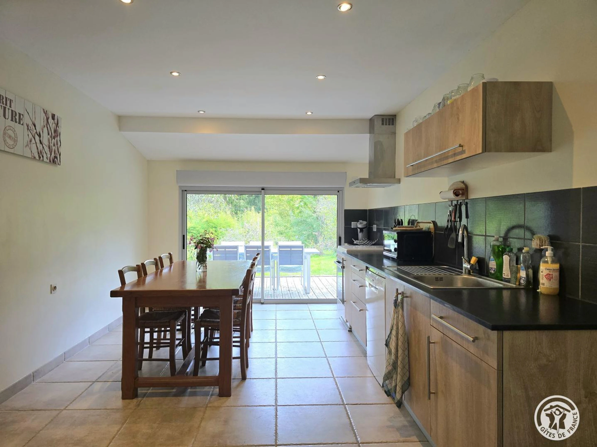 Casa con un amplio salón con zona de estar (TV, Wi-Fi, chimenea decorativa), cocina totalmente equipada con comedor para 8 personas. Un dormitorio con cama de matrimonio (160x200 cm), un dormitorio con cama de matrimonio (140x190 cm), un dormitorio con dos camas individuales (90x190 cm) y dos dormitorios con una cama individual cada uno (90x190 cm). Un baño completo con ducha, inodoro y lavadora. Un aseo independiente. Tendrá acceso a dos terrazas con mobiliario de jardín y barbacoa de carbón. El jardín, de aproximadamente 2000 m², sin vallar y compartido con el propietario (que vive en la propiedad), incluye un columpio.