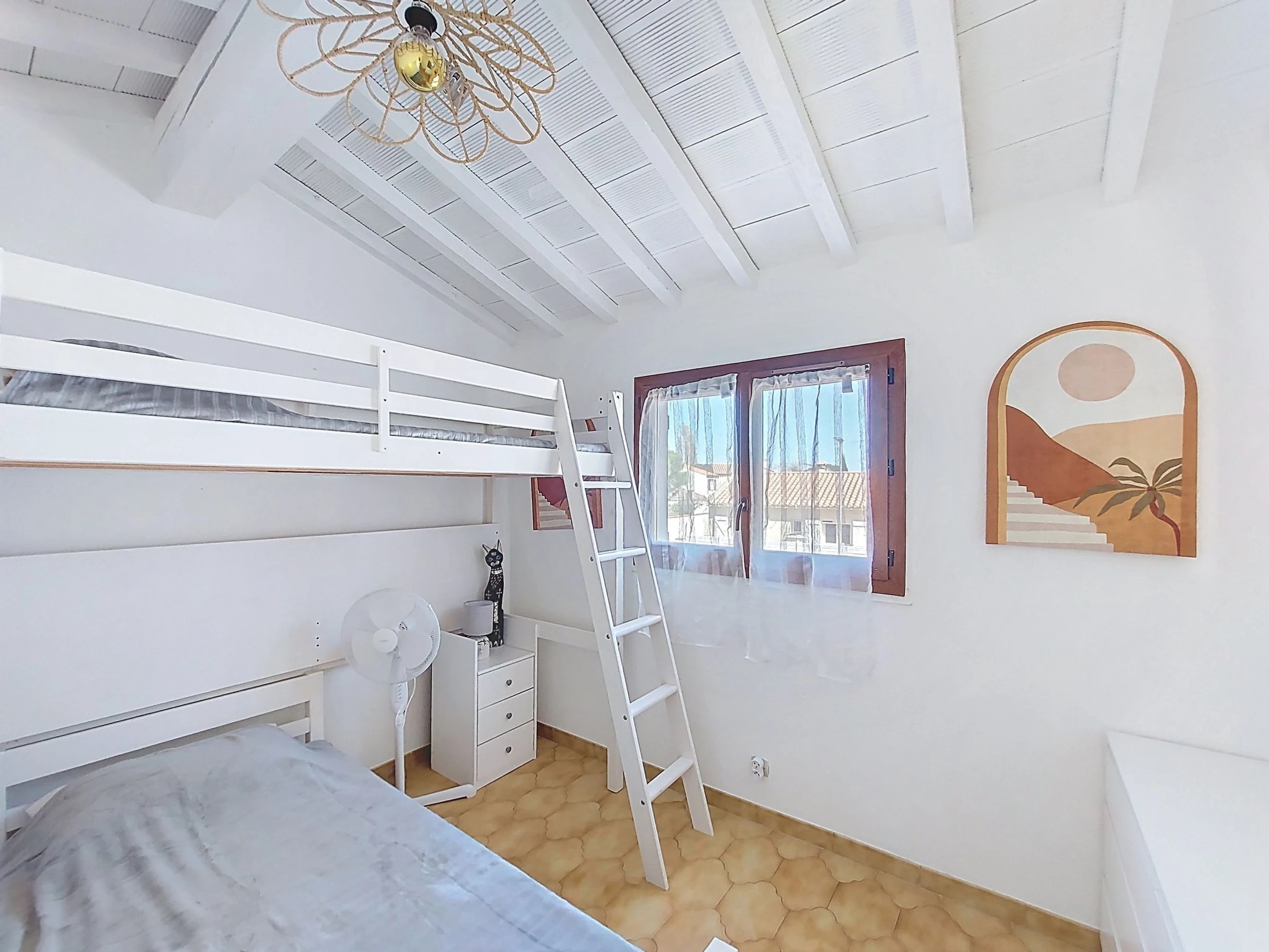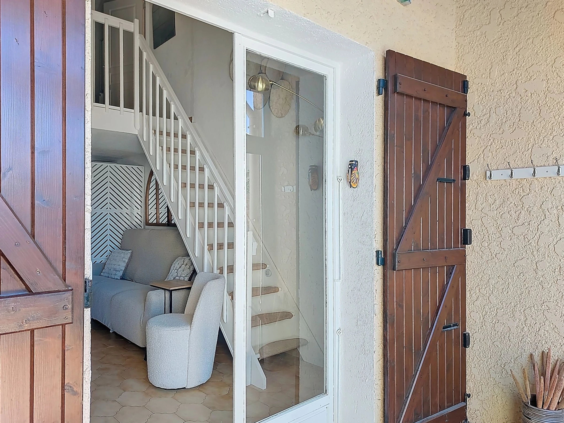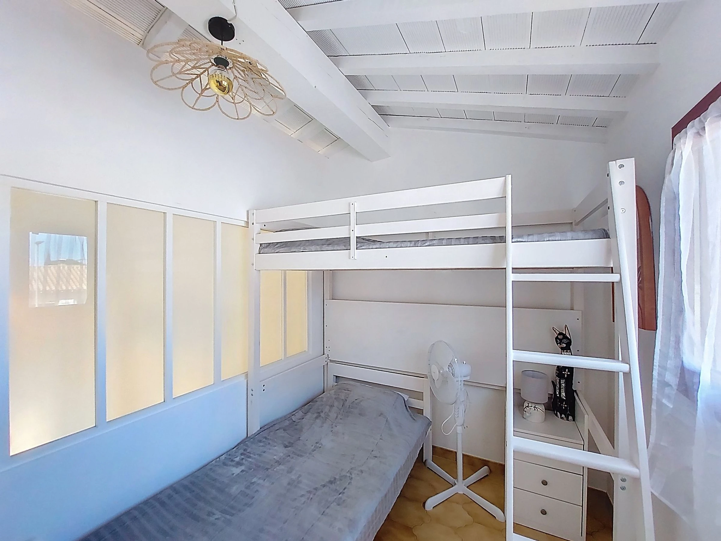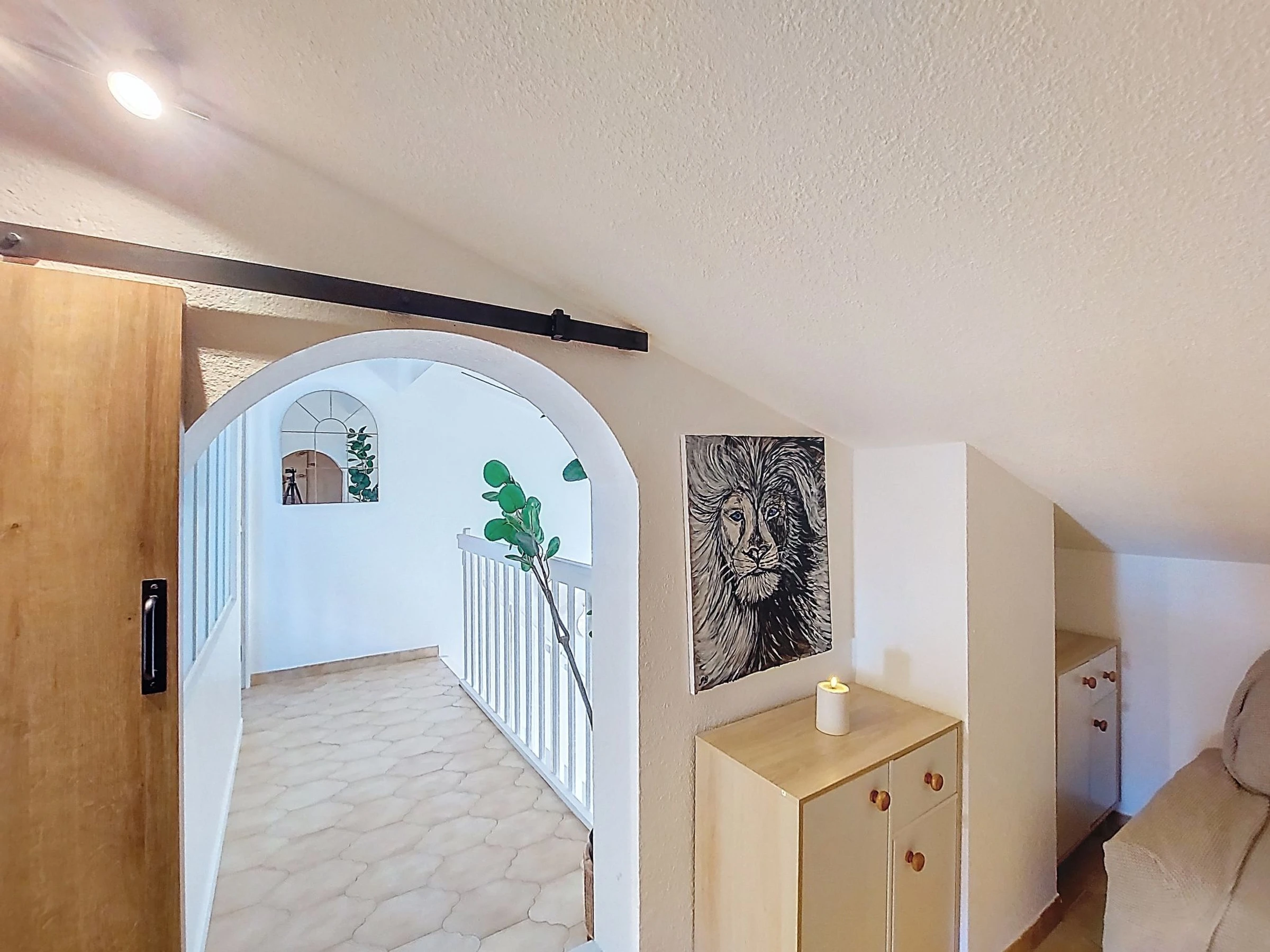 Casa adosada 3 estancias 80 m2 en 2 plantas. Con mobiliario bonito: salón-comedor con TV (pantalla plana), aire acondicionado. Salida a la terraza. 1 dorm. con 1 cama de matrimonio (180 cm, 200 cm de longitud), aire acondicionado. Salida a la terraza. Rincón-cocina (3 fogones, horno, lavavajillas, tostadora, hervidor de agua eléctrico, microondas, congelador, cafetera eléctrica, Cápsulas de café (Dolce Gusto) extra). Ducha, WC separado. Planta superior: 1 dorm. con 1 x 2 literas (90 cm, 190 cm de longitud), ventilador. 1 dorm., abuhardillado altura de techo 110 - 165 cm con 1 cama de matrimonio (160 cm, 200 cm de longitud), aire acondicionado. Terraza 40 m2, orientación oeste. Muebles de terraza, barbacoa. El alojamiento dispone de: lavadora. Internet (Wifi, gratis). A tener en cuenta: detector de humo. Oferta de un particular según el art. 155, IV del CGI.