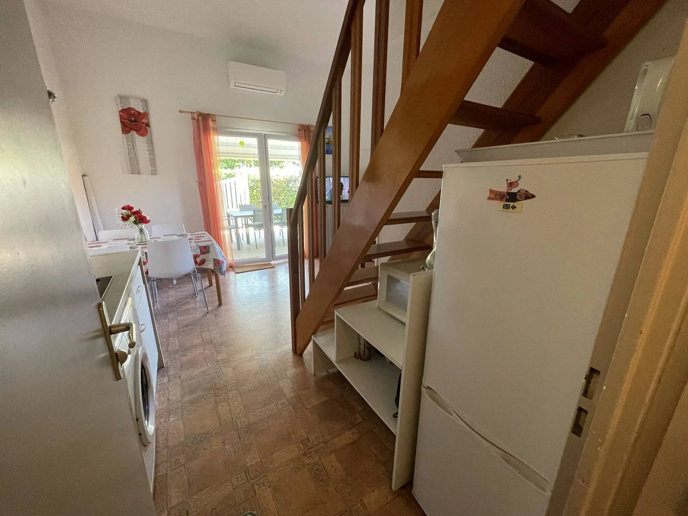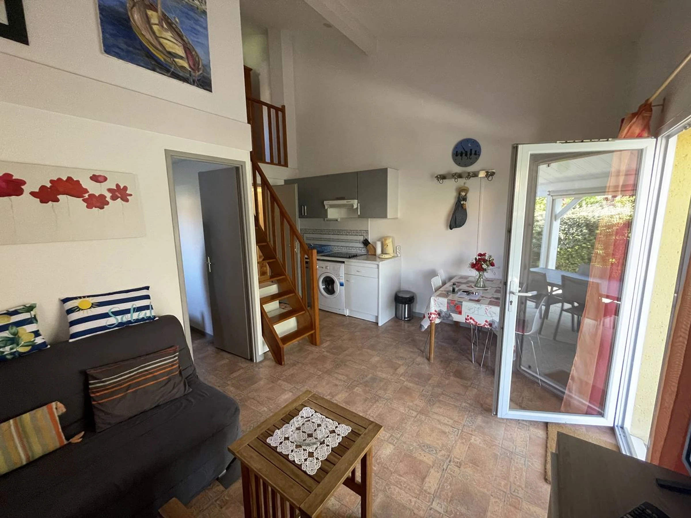 A la entrada del complejo, pabellón de esquina climatizado (34m2), situado a 200m de la playa y del mercado, residencia privada con excelentes comodidades (piscina y tenis). Terraza pavimentada y vallada (54m2) con zona semicubierta, barbacoa de obra, muebles de jardín, 2 tumbonas. En la planta baja, zona de cocina bien equipada: microondas, 4 placas vitrocerámicas, frigorífico-congelador, cafetera eléctrica, tostadora, lavadora, lavavajillas. Cuarto de ducha (cabina), WC semi-separado. Salón con TV, sofá cama de 120cm. 1 dormitorio con cama de 140cm + armario. Planta alta, entrepiso (gran armario), 1 dormitorio con 1 cama de matrimonio, cómoda. Estacionamiento seguro n°131. Soleado todo el día, funcional. Expo S/O. Cobertizo para bicicletas, tendedero, aspiradora, kit de planchado. A 100 m del campo de minigolf. RES. con PISCINA SEGURA, abierta del 1/6 al 30/9. CANCHA DE TENIS Y BOLOS. SE ADMITEN MASCOTAS.