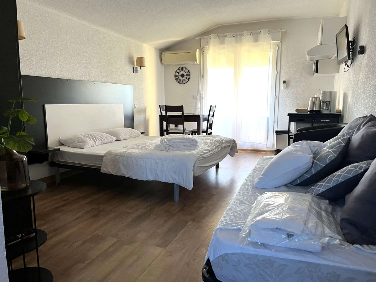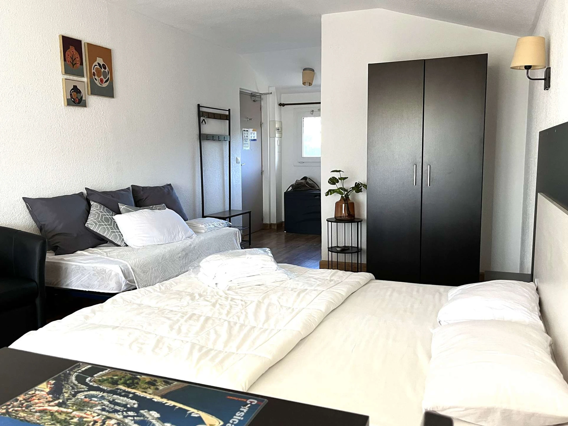Cerca del centro de Saint-Florent, en una residencia tranquila y verde, estudio climatizado de 26 m² (segundo piso sin ascensor) con sala principal equipada con zona de cocina (nevera superior, campana extractora, microondas, vitrocerámica), zona de comedor. , zona de noche con cama de matrimonio y cama individual con capacidad para 3 personas - Cuarto de baño con bañera y WC.