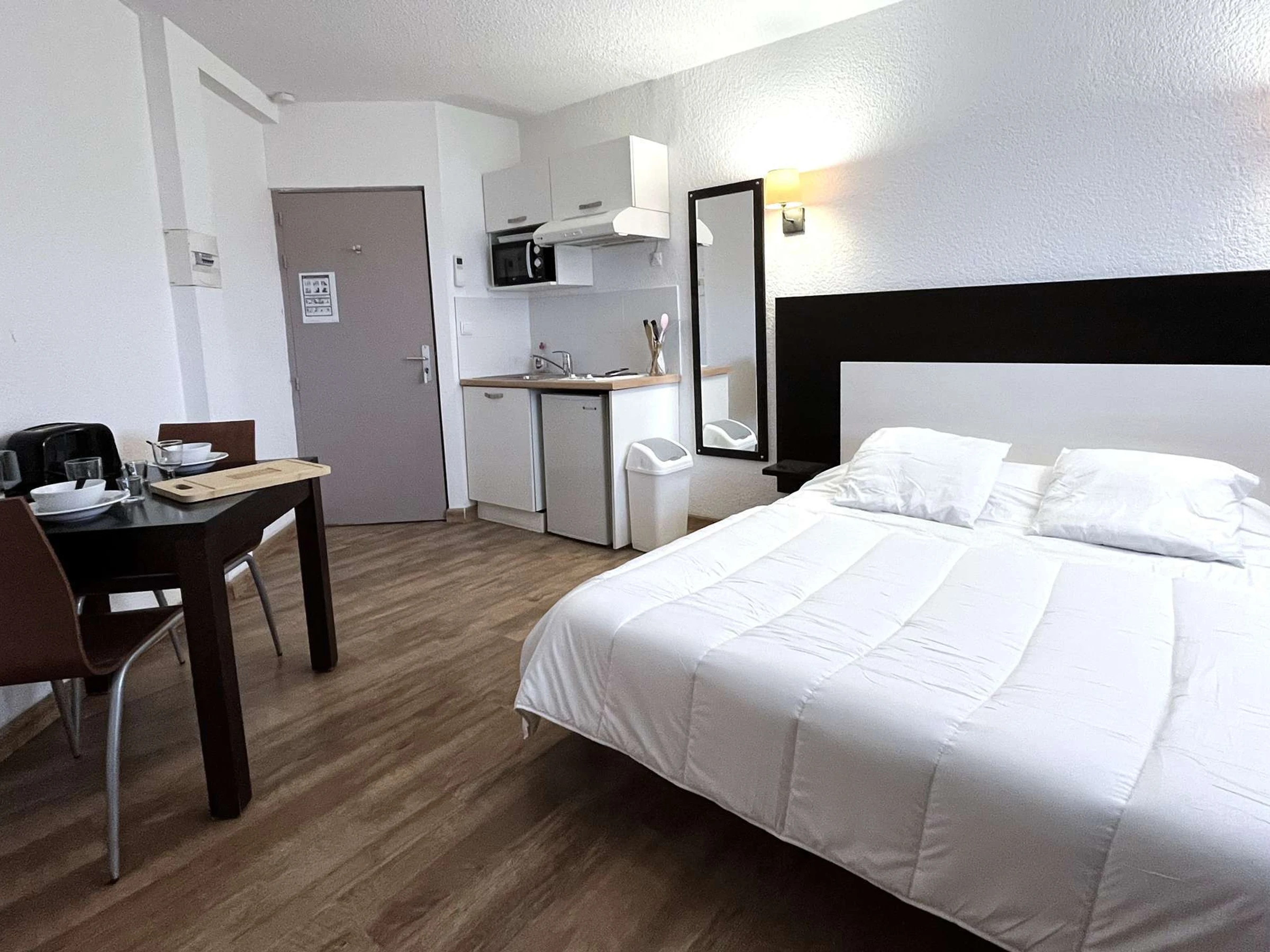 Dispondrá de todas las comodidades para una estancia agradable: cocina americana con comedor (nevera pequeña, placa de cocina y microondas), cama doble (140 cm) y baño con WC. Vistas a la piscina de la residencia y al mar.