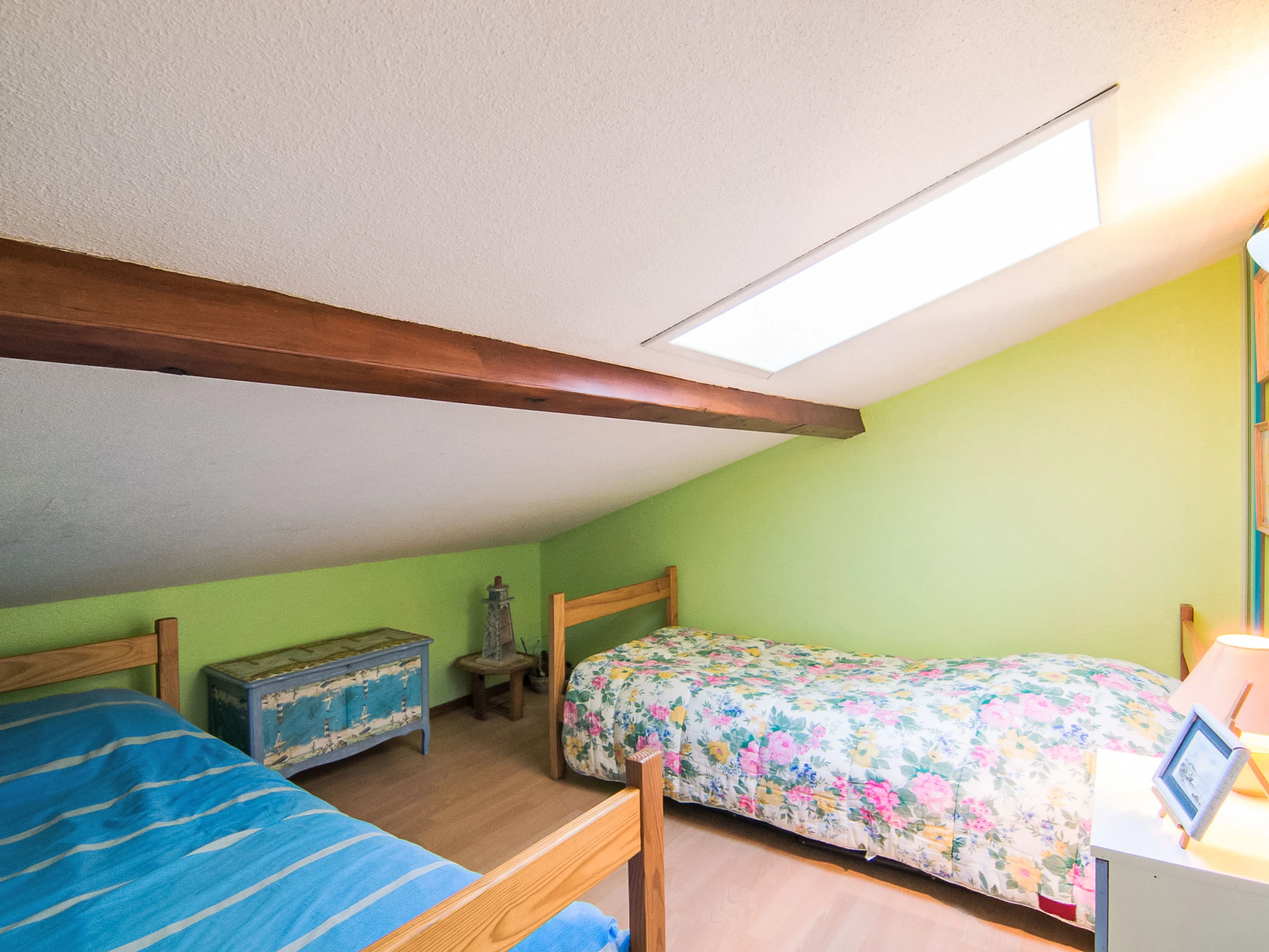 Casa adosada 3 estancias 40 m2 en 2 plantas. Vivienda adecuada para 2 adultos + 2 niños. Salón-comedor con TV. Salida a la terraza. Cocina abierta (2 fogones, lavavajillas, microondas). Ducha/WC. Calefacción eléctrica. Planta superior: (escalera empinada) 1 dorm. con 1 cama de matrimonio (1 x 140 cm, 190 cm de longitud). 1 dorm., abuhardillado altura de techo 170 - 70 cm con tragaluz con 2 camas (80 cm, 190 cm de longitud). Terraza 13 m2. Muebles de terraza. El alojamiento dispone de: lavadora. Internet (Wifi, extra). Plaza de aparcamiento n. 1. A tener en cuenta: permitido máximo 1 mascota / perro. Detector de humo.