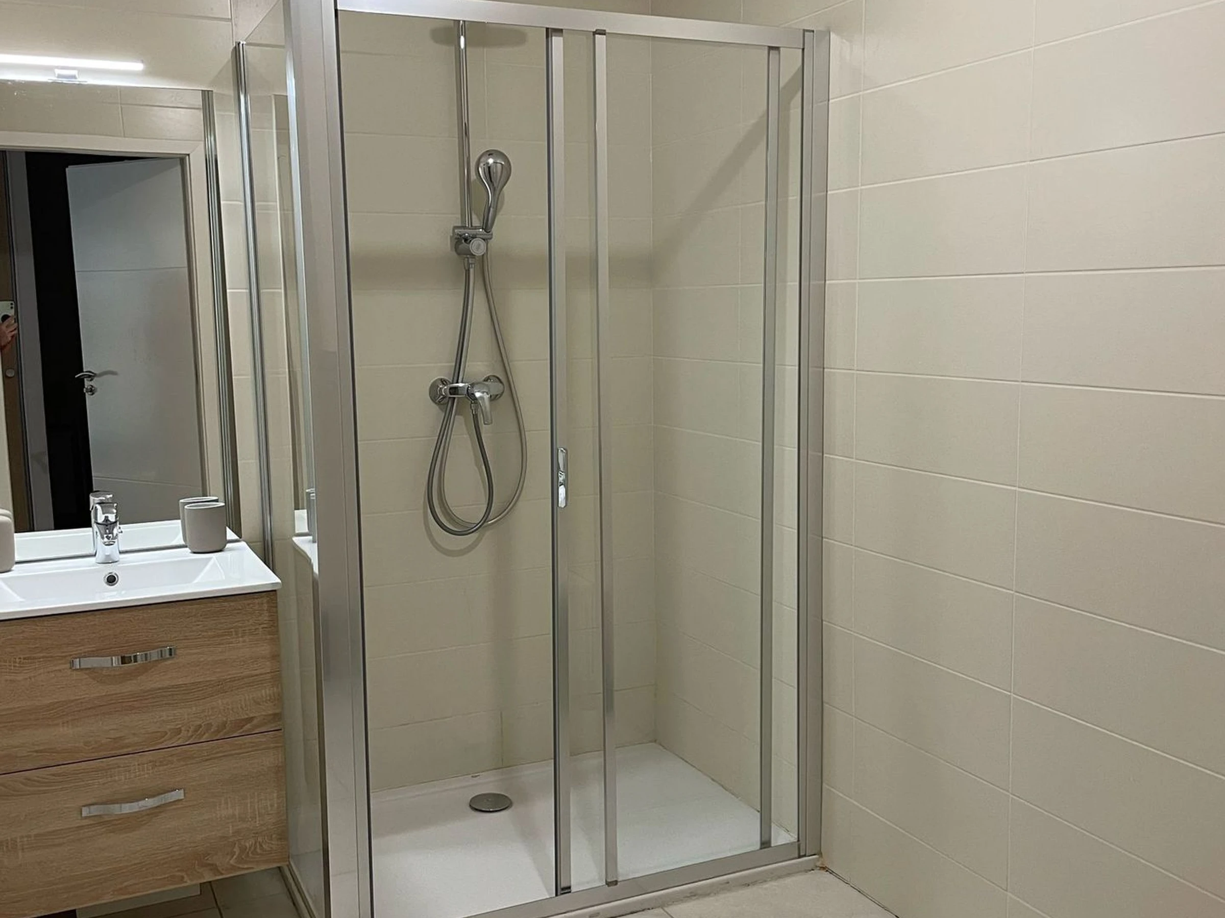 - 1 dormitorio con cama doble (160x200 cm), baño con lavabo, ducha grande y WC.