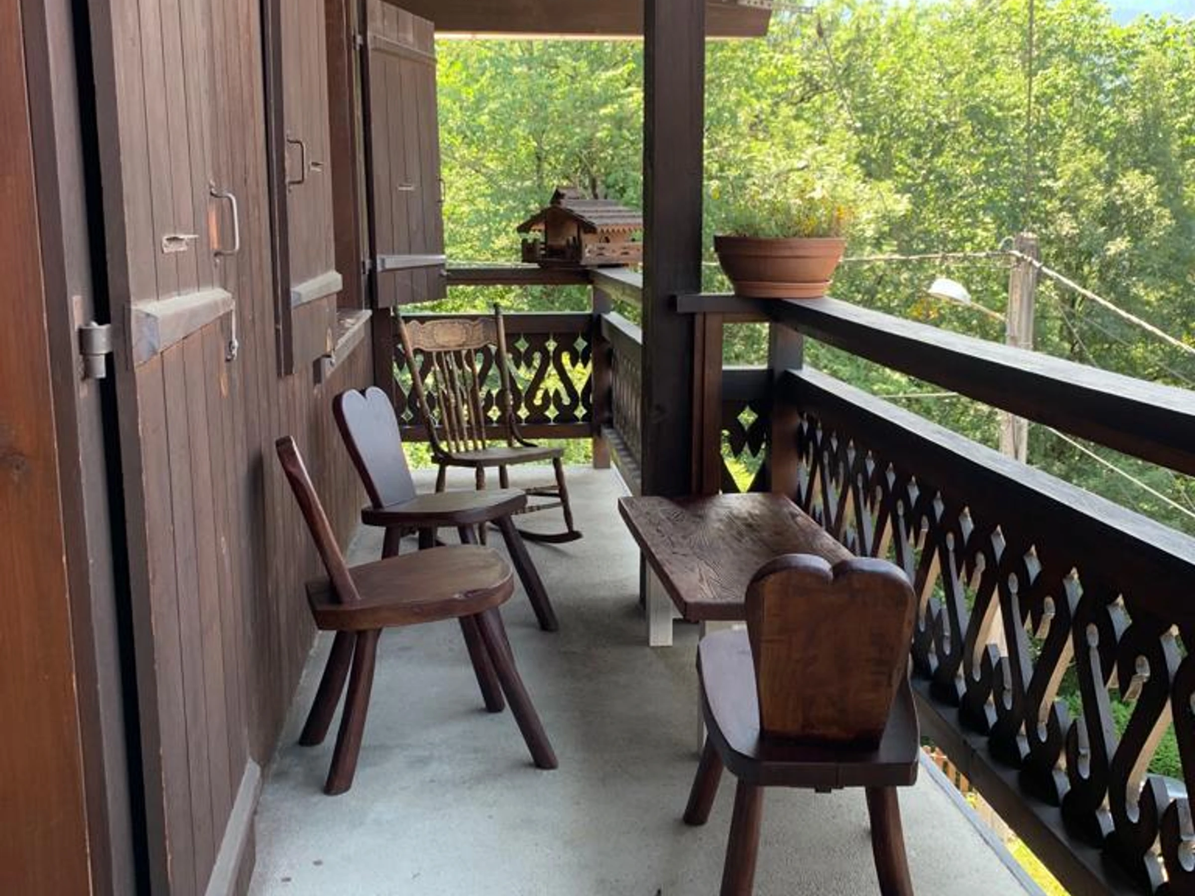 - Salón con sofá, televisión, comedor, estufa de leña y acceso al balcón.