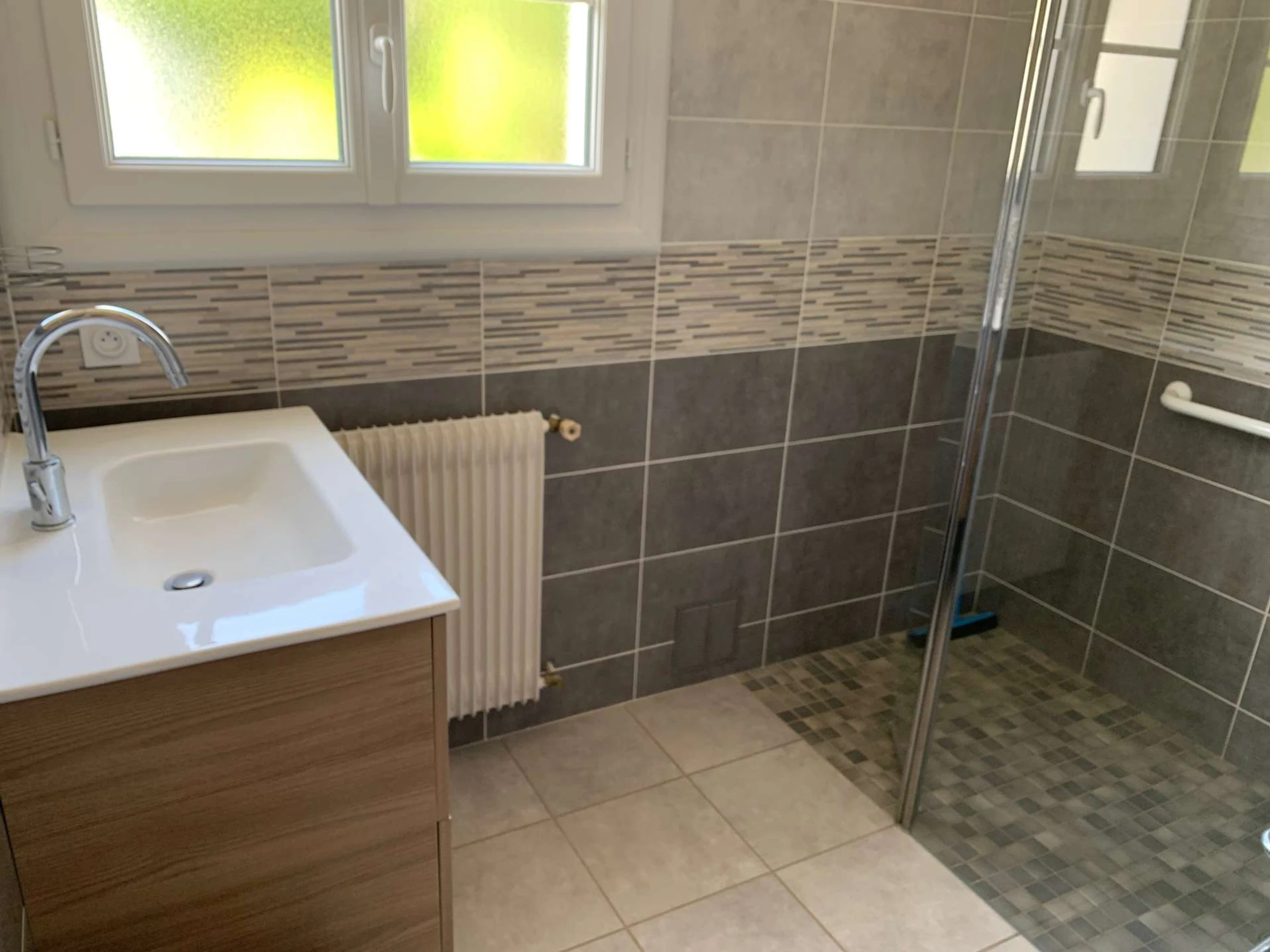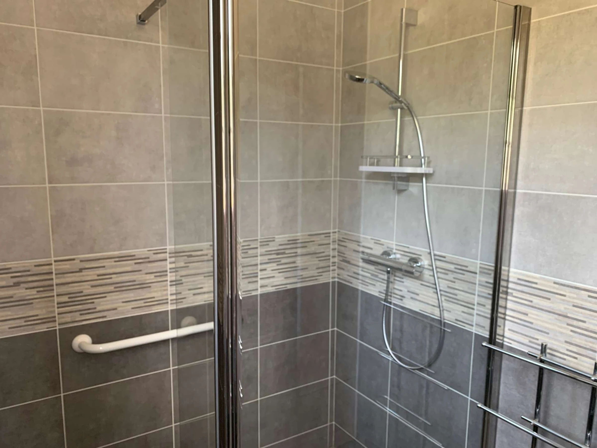 Un baño con ducha a ras de suelo y lavabo. Un aseo independiente.