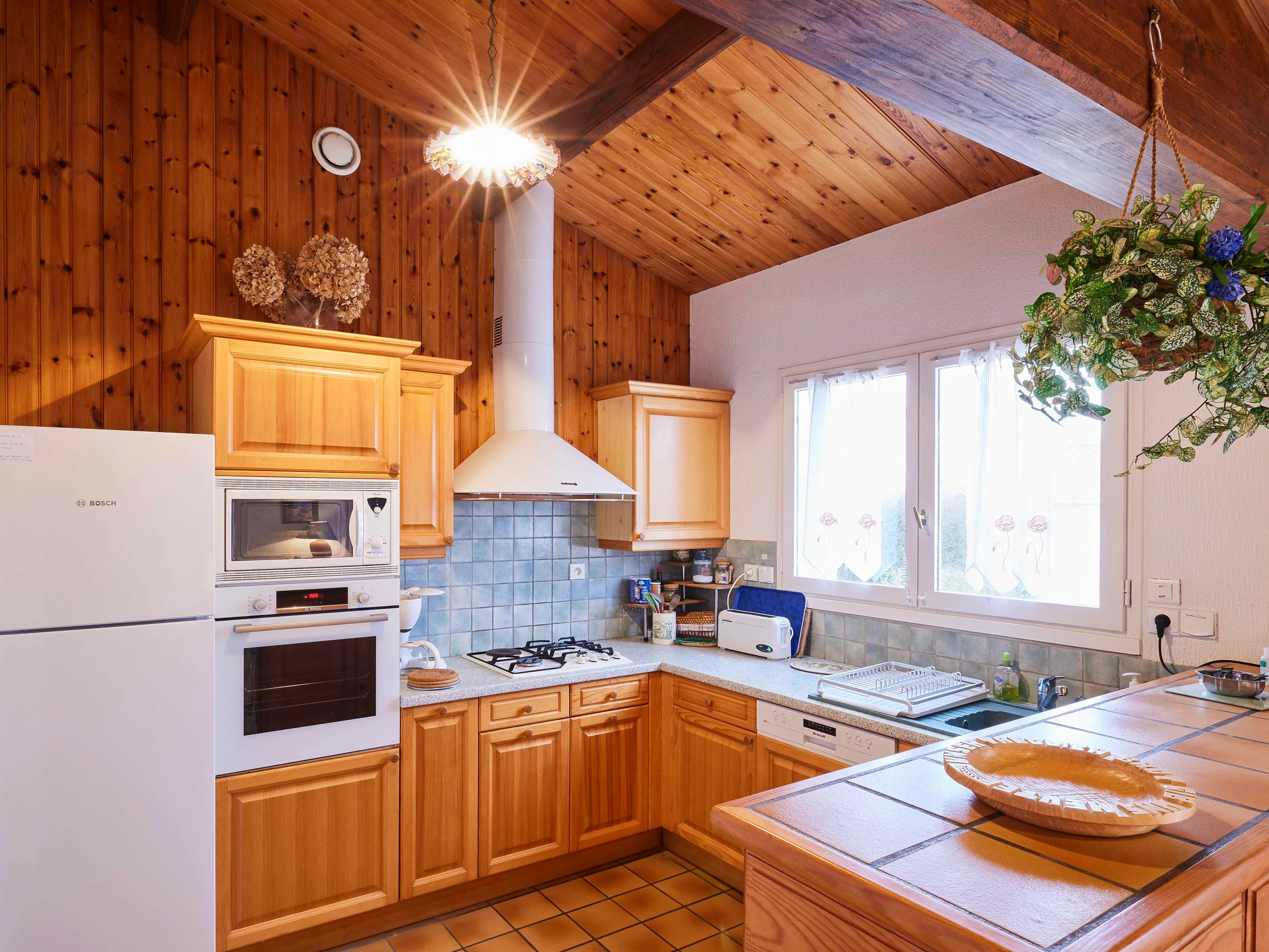 - Salón-comedor y cocina abierta: pequeña sala de TV, sofá (2024), gran mesa de comedor, cocina totalmente equipada (horno, lavavajillas, microondas, cafetera, frigorífico/congelador y despensa con lavadora).