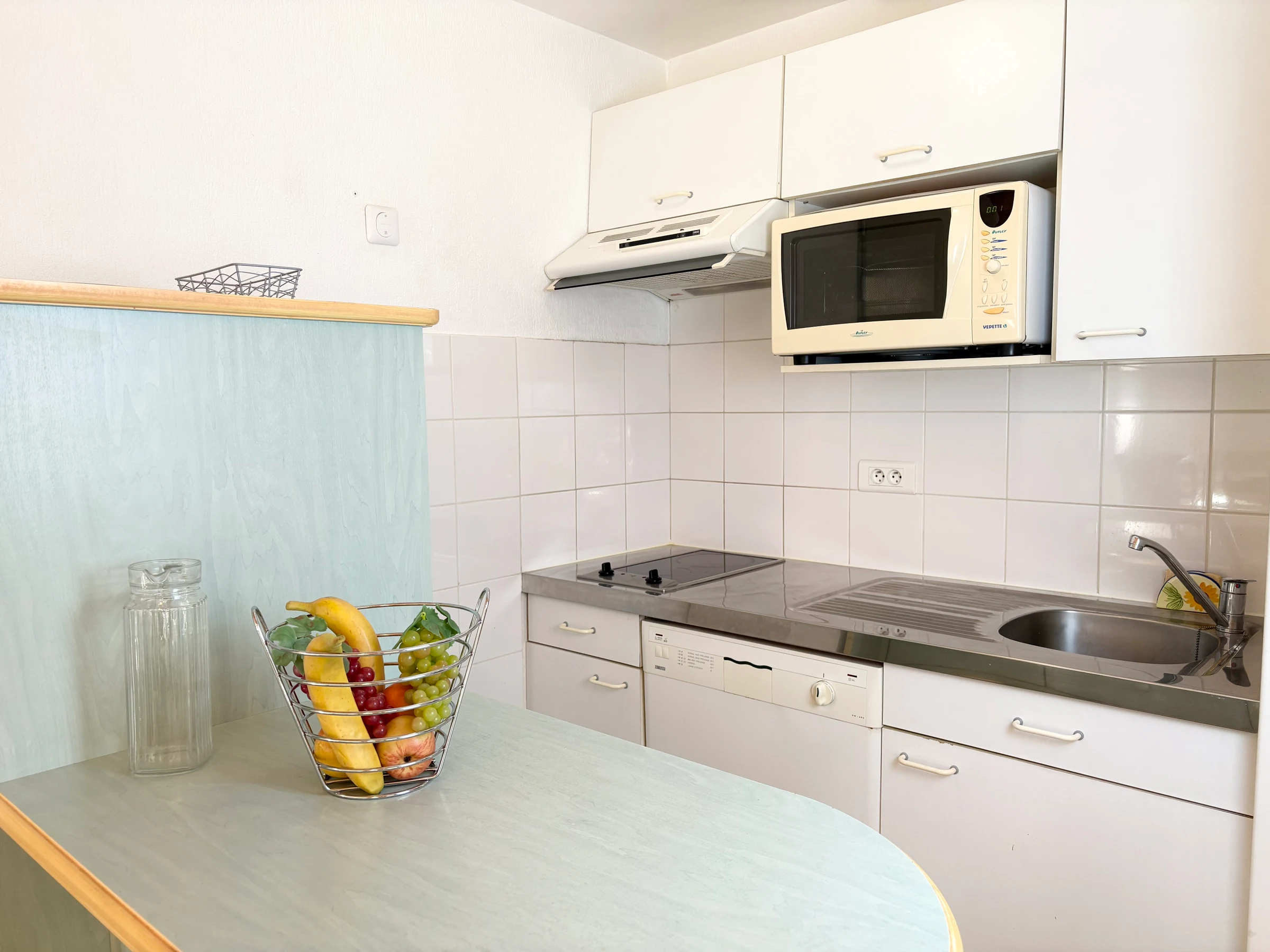Cocina equipada: vitrocerámica de 2 fuegos, campana extractora, frigorífico/congelador, microondas, lavavajillas