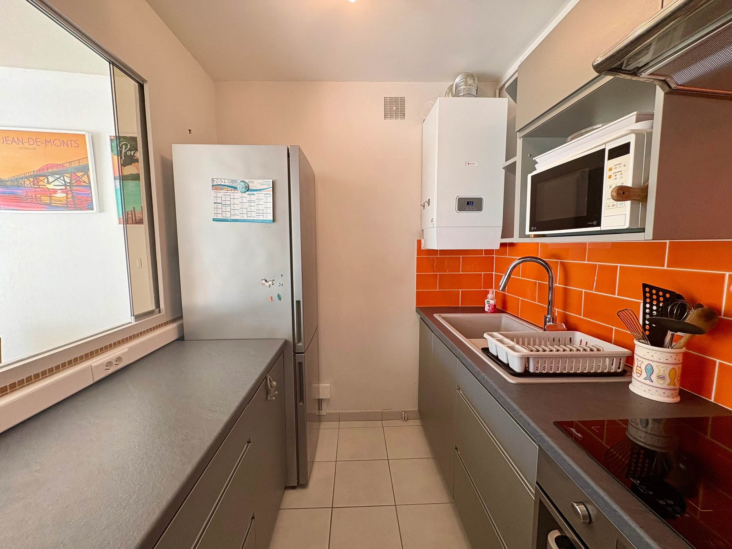 * Un cómodo salón con sofá cama (140 x 190 cm), un gran televisor de pantalla plana, mesa y sillas. * Cocina americana totalmente equipada: horno, placa de inducción, frigorífico-congelador, microondas...
