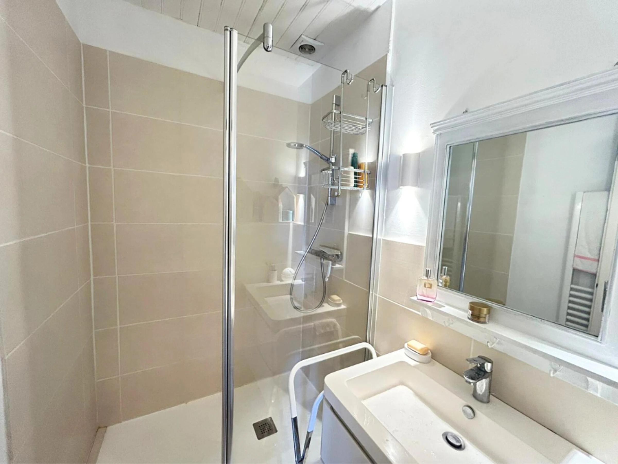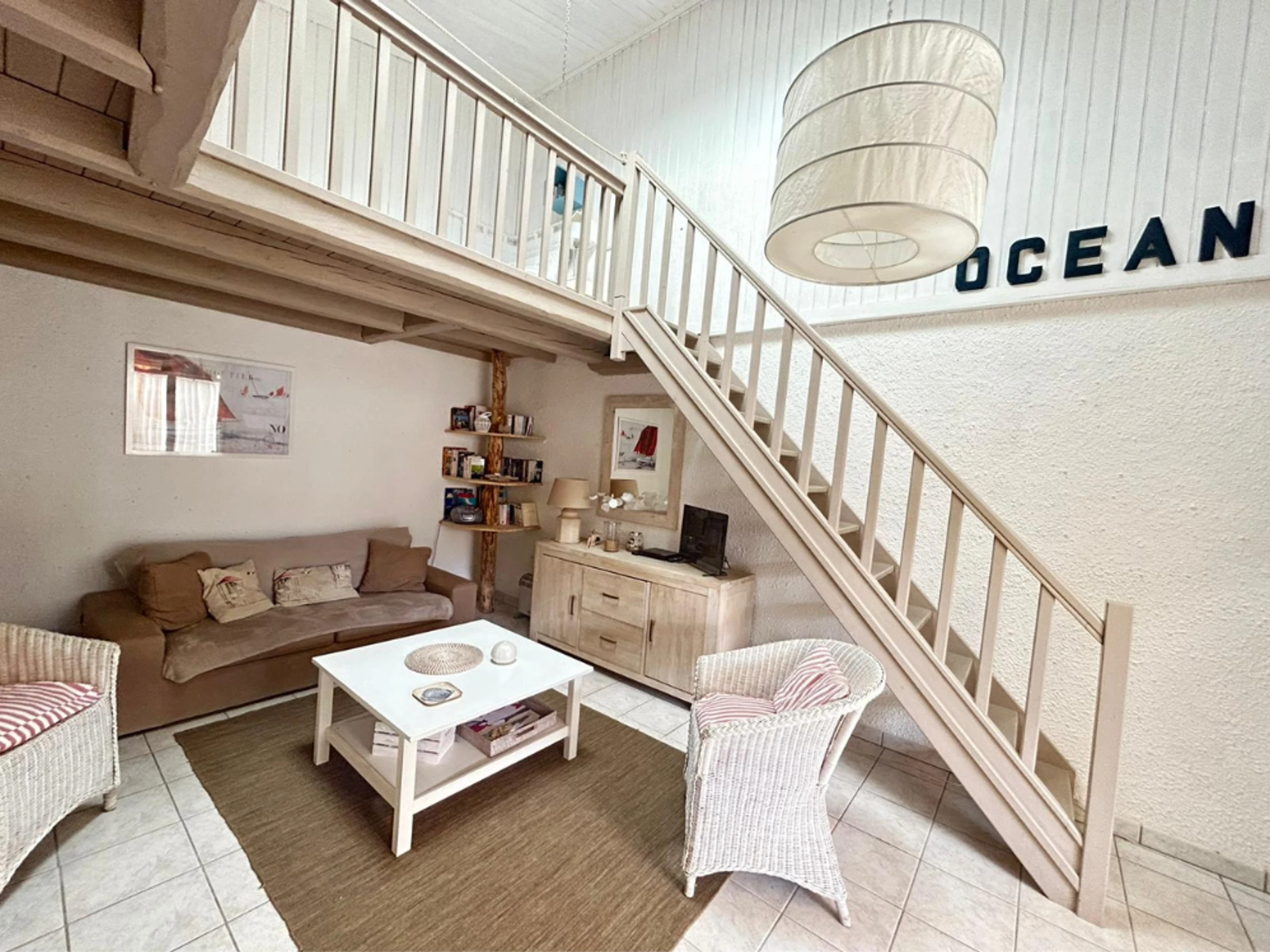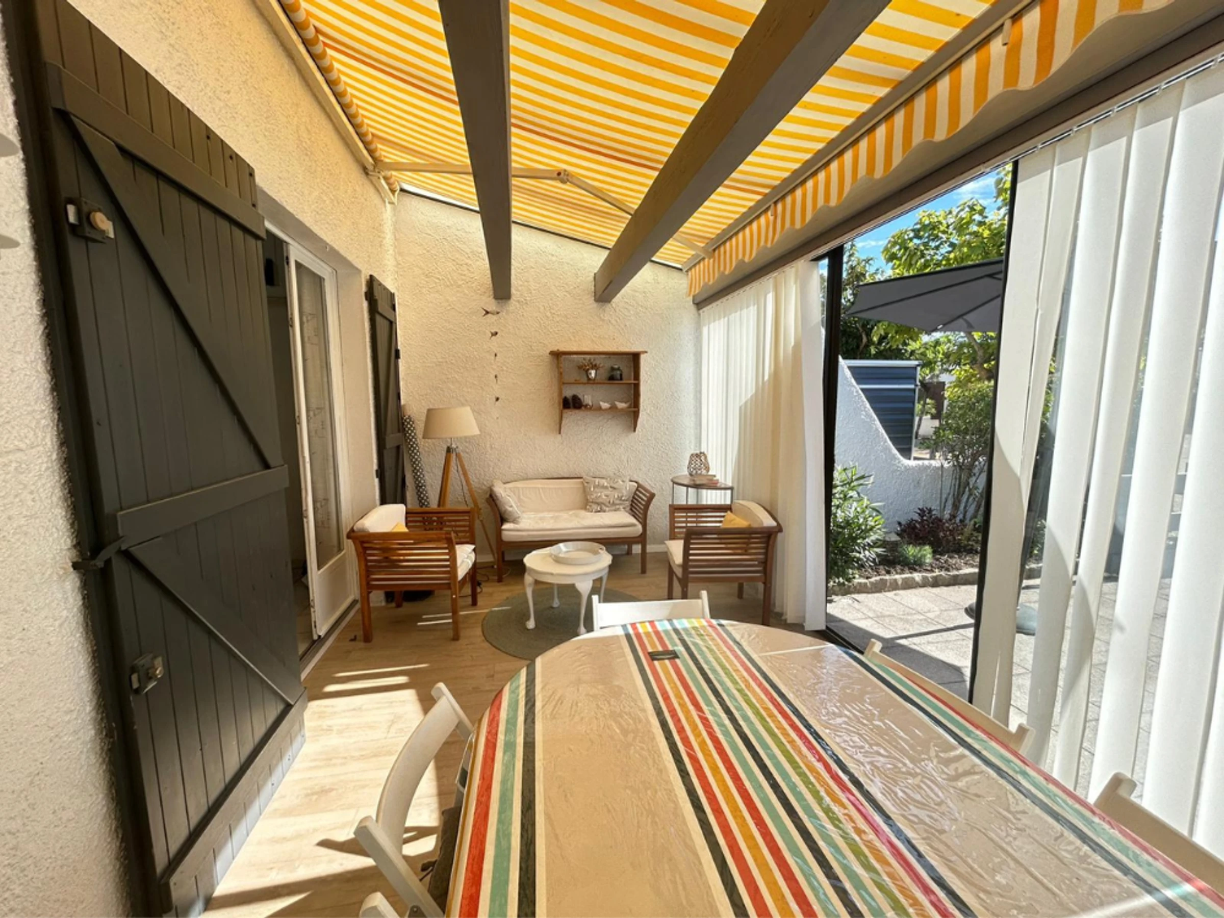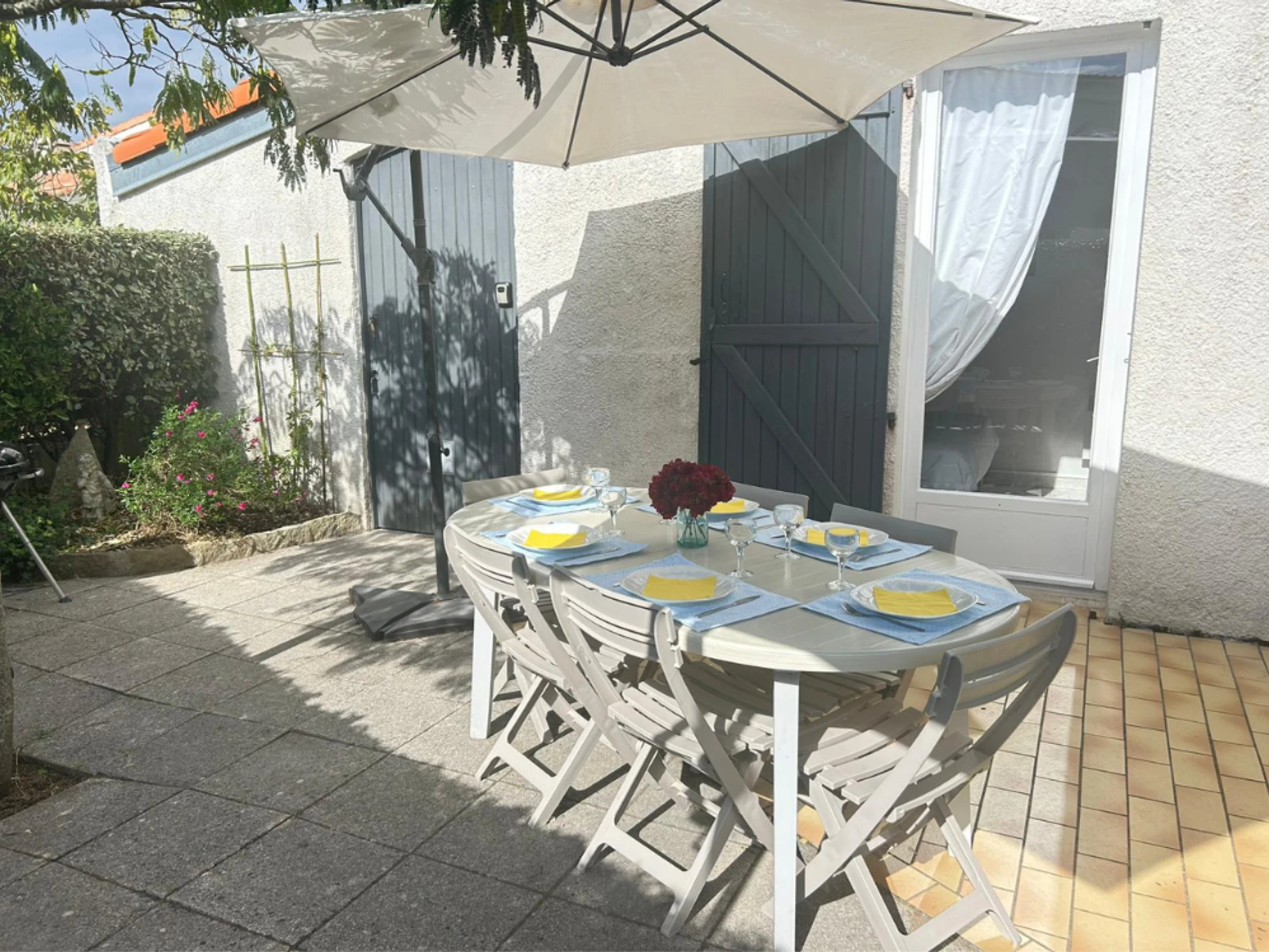 Situada a unos 300 m de la playa y a 1 km de los comercios, en una zona tranquila, encantadora casa de unos 75 m², con una terraza soleada. - Cocina equipada con acceso al salón: fregadero, lavavajillas, placa de inducción, campana extractora, horno, microondas, muebles altos y bajos, frigorífico/congelador, tostadora, hervidor de agua, cafetera de filtro y cafetera Nespresso.