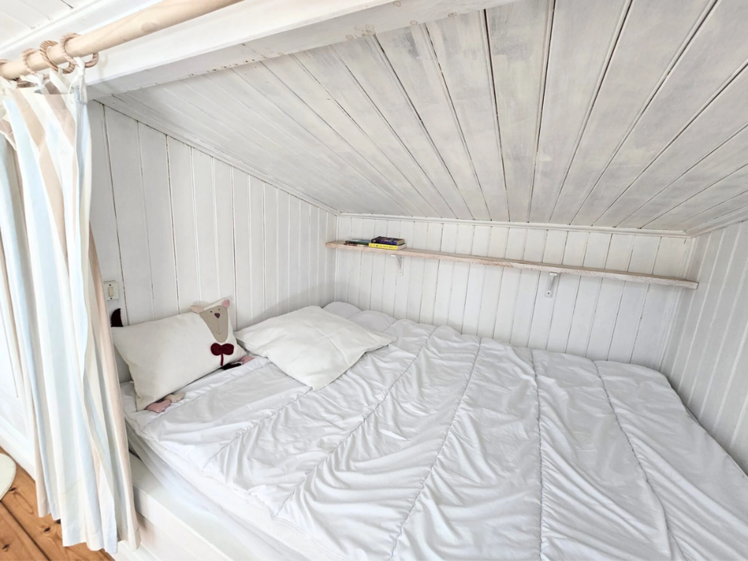 - Salón: sofá, 2 sillones, TV de pantalla plana, chimenea (decoración fuera de tono), mesa de centro, reproductor de CD y DVD, juegos de mesa. - Entrepiso: 1 cama (80 x 190 cm) y 2 camas (120 x 190 cm), armario, mesita de noche y lámpara, ventilador.